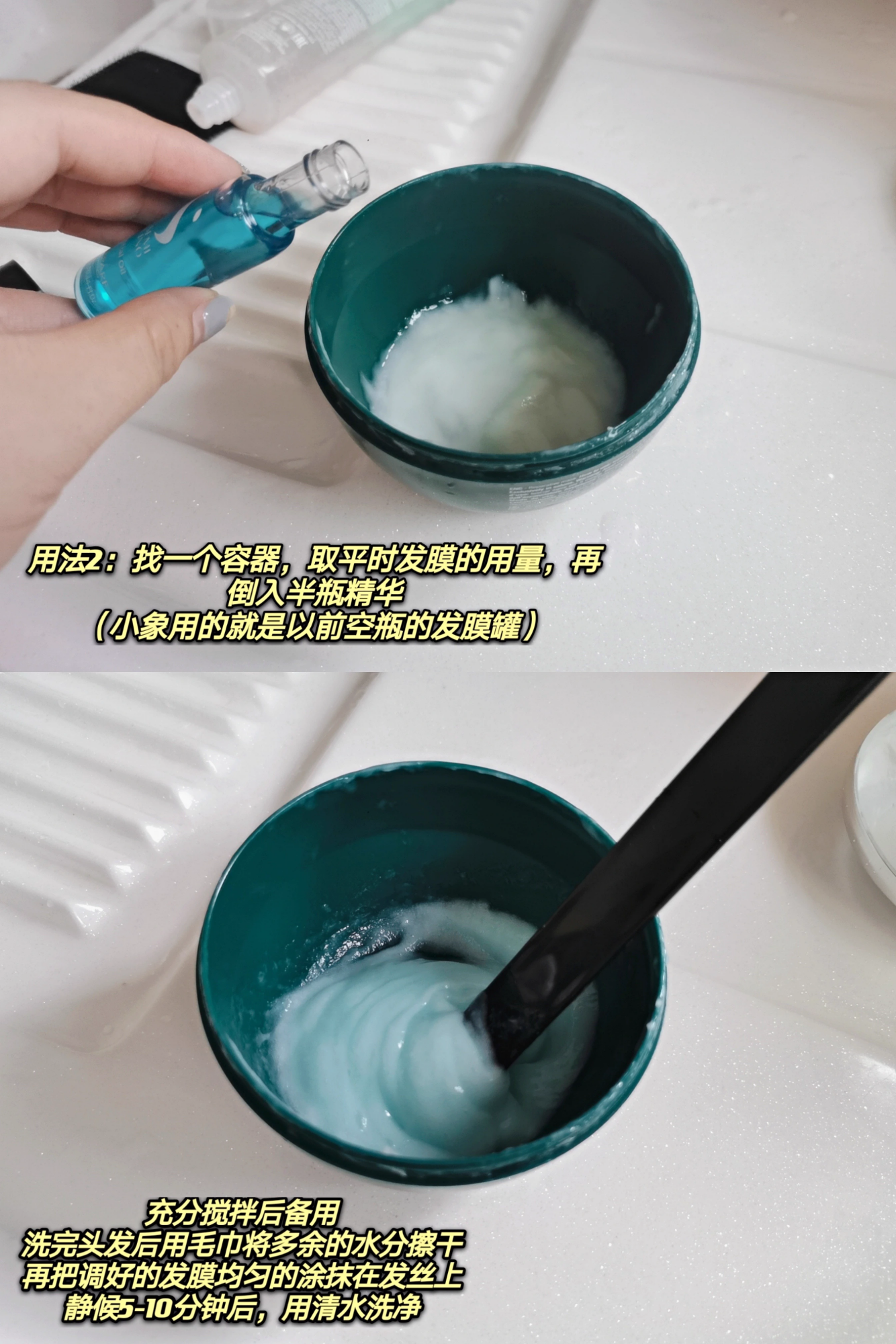 1、取合适的容器,倒入适量发膜与一瓶柔亮精华,搅拌均匀