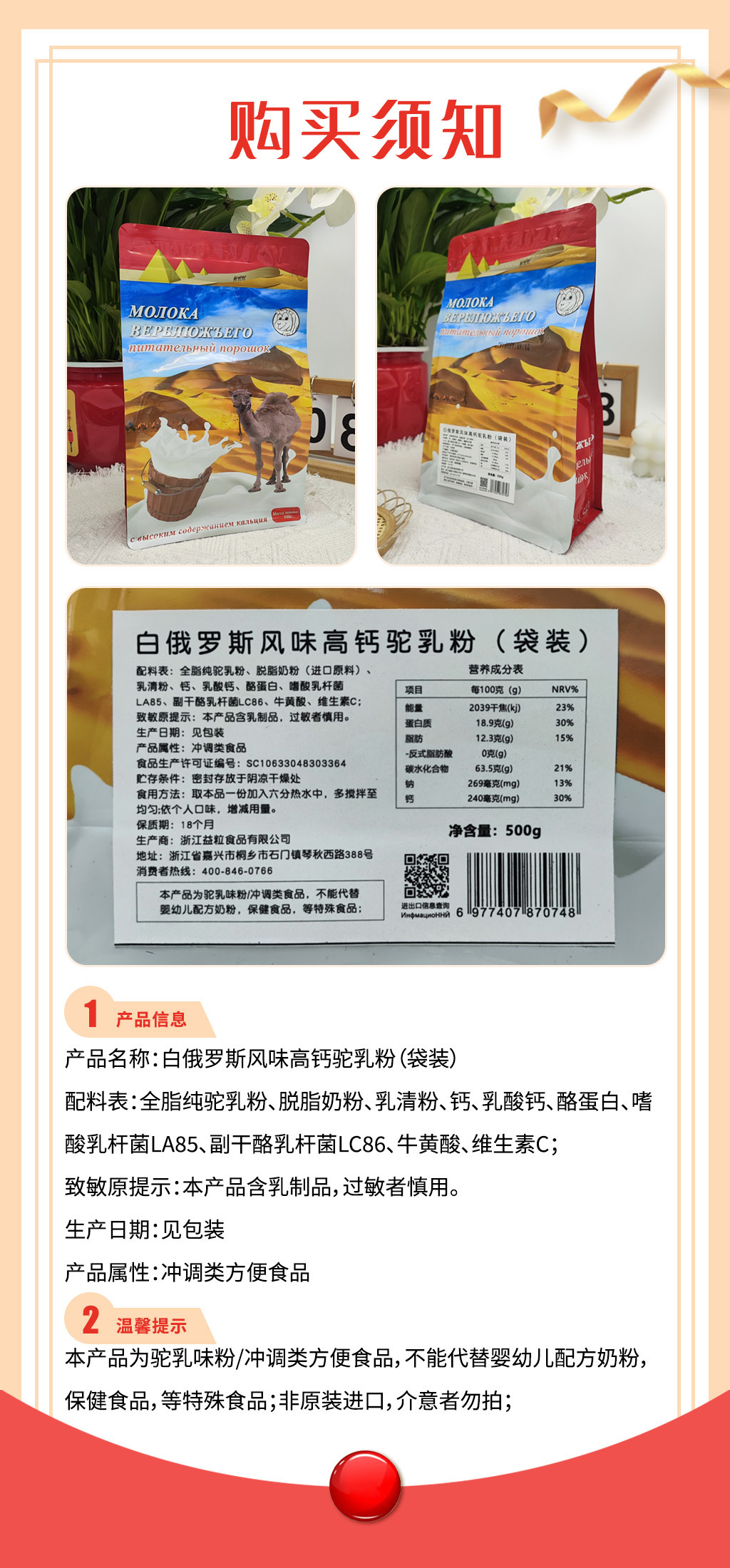 【品名】白俄罗斯驼奶粉 双峰高钙配方 【规格】500g*4袋 【产地】国内(原料进口,国内分装) 【生产日期】2026年3月 【保质期】18个月 【发货包装】独立包装袋 【发货地】陕西 【发货快递】中通,申通,极兔 【不发货区域】新疆,西藏,港澳台 【补邮费地区】海南,内蒙+8元 【发货时效】48-72小时,周末节假日顺延 【冲调方法】1.加入约30克驼奶粉到180ml水或凉开水中搅拌均入更多水溶解成250ml(可根据个人口味调节浓度) |