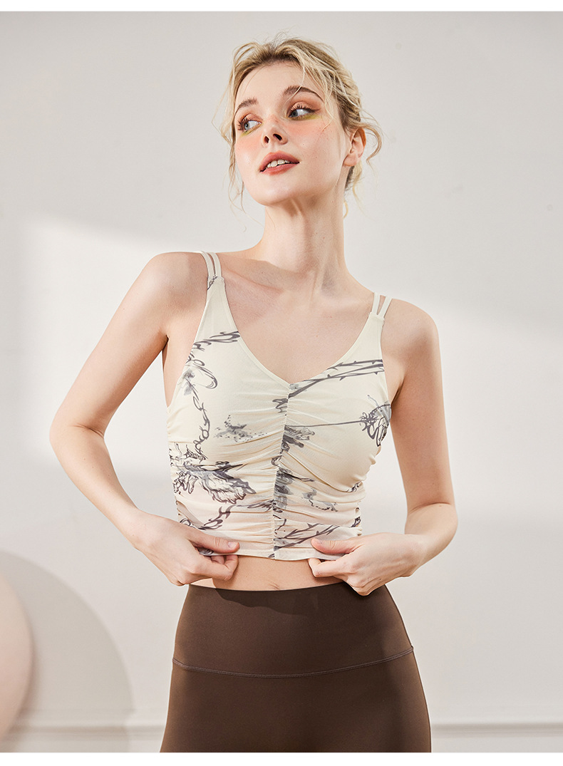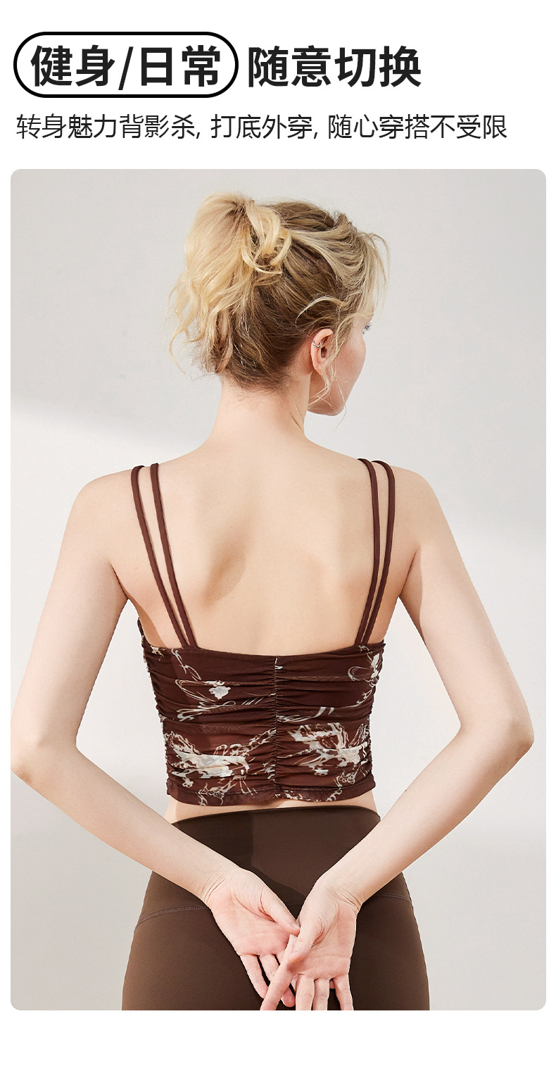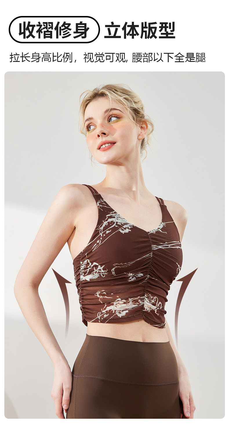 运动内衣女美背吊带一体式胸垫瑜伽文胸印花褶皱露脐alo健身背心