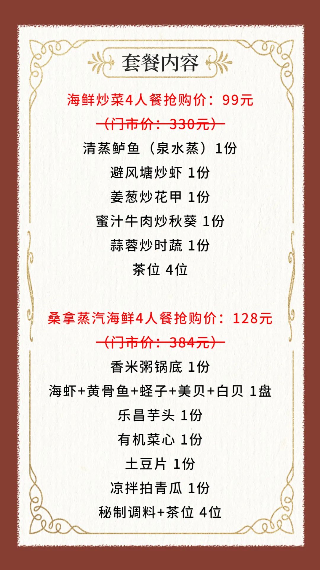 ◆ 套餐包含菜品需1次消费完毕,不可拆分不同日期享用,部分菜品若因时令或其他不可抗因素导致无法提供,将视实际情况以等价菜品替换
