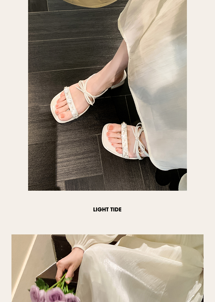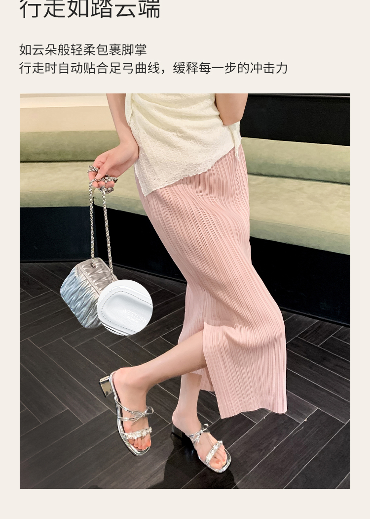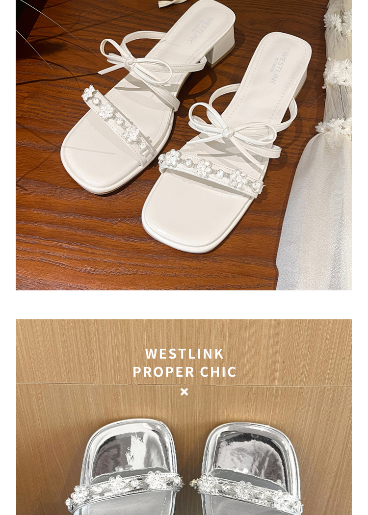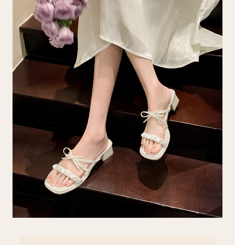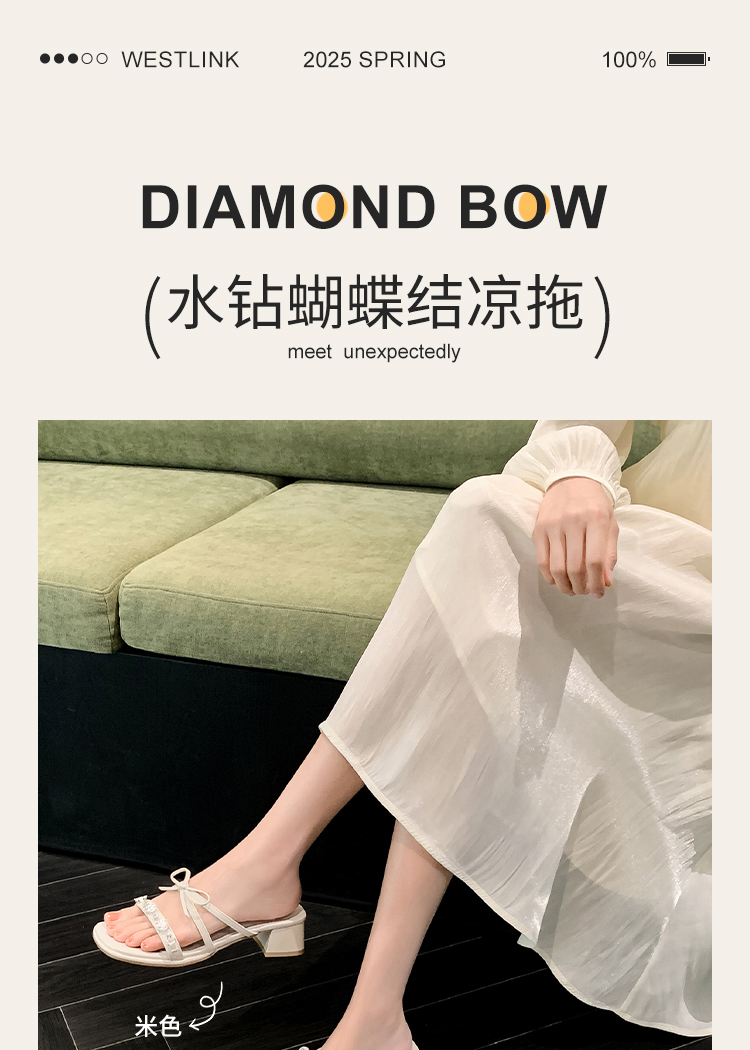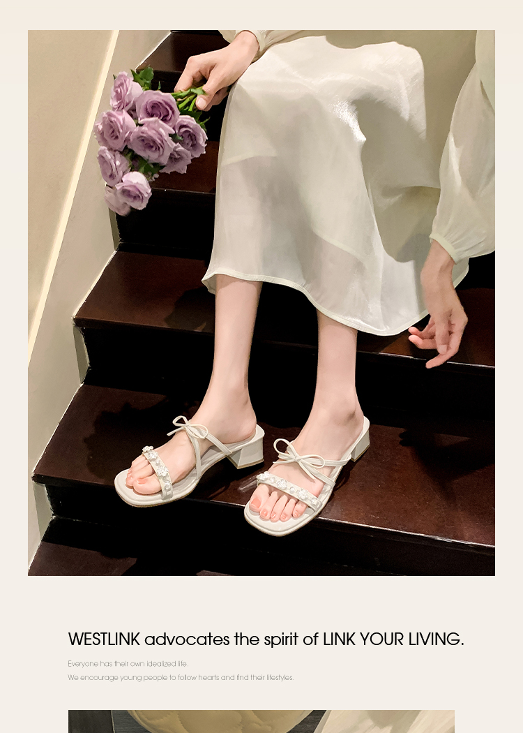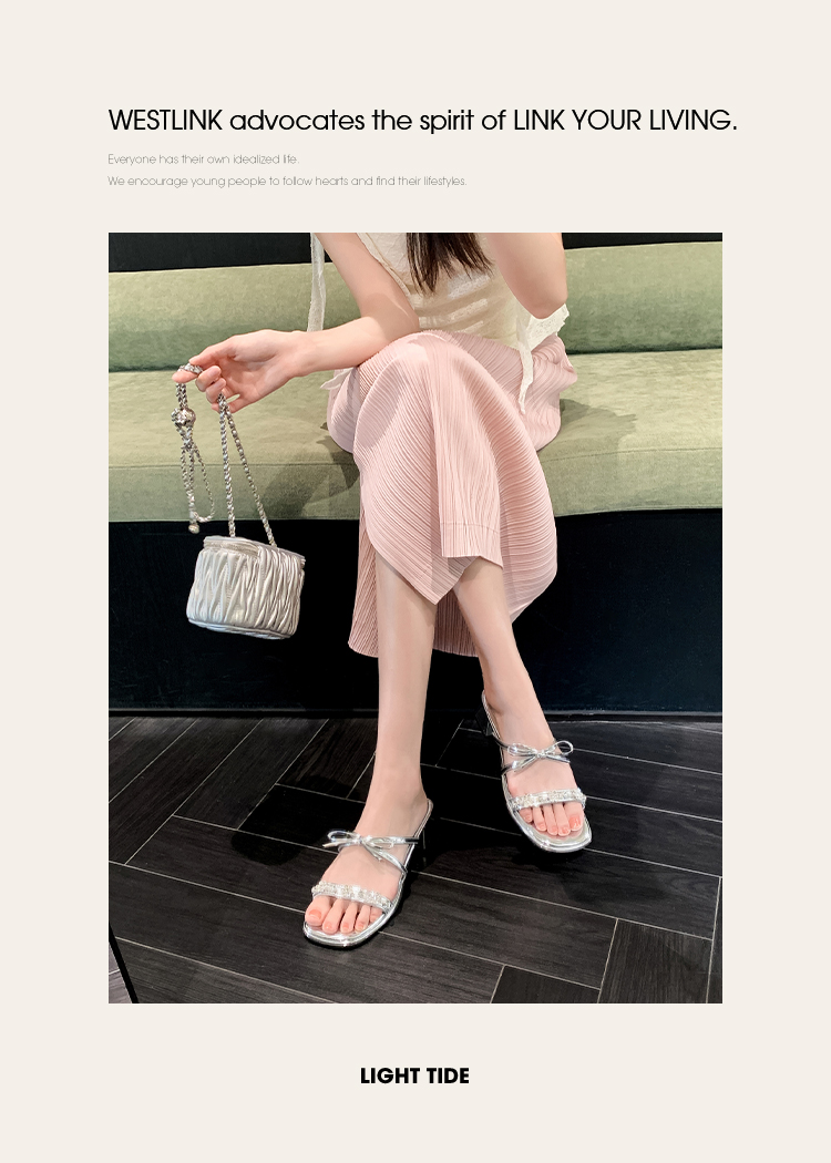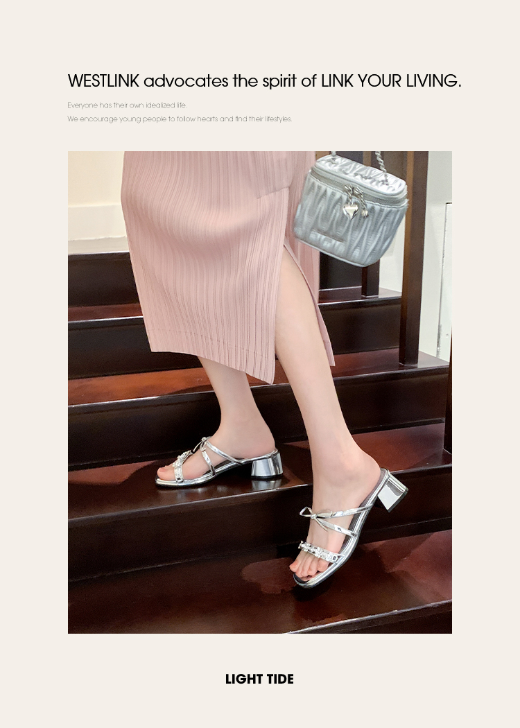 西遇粗跟凉拖鞋女夏外穿新款绝美水钻蝴蝶结配裙子中跟凉鞋K1156796