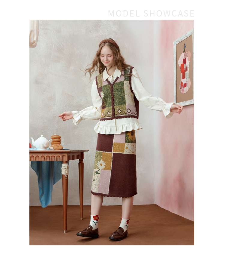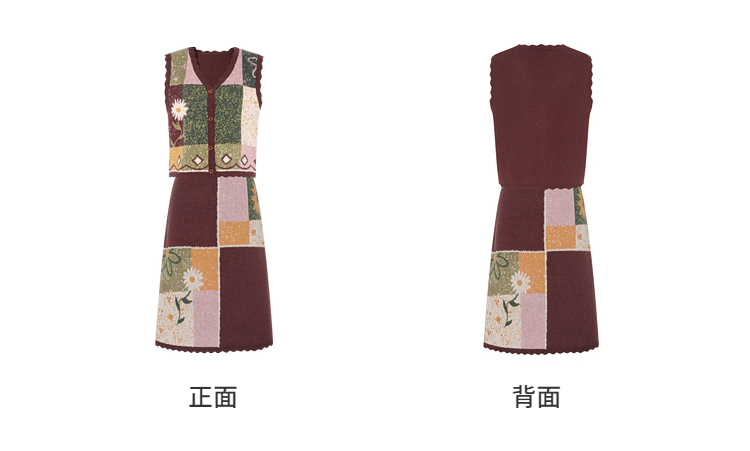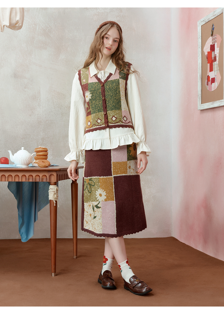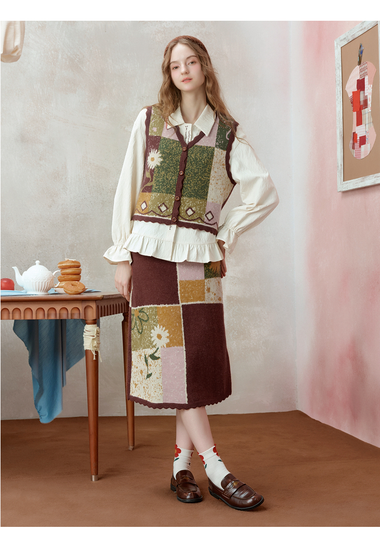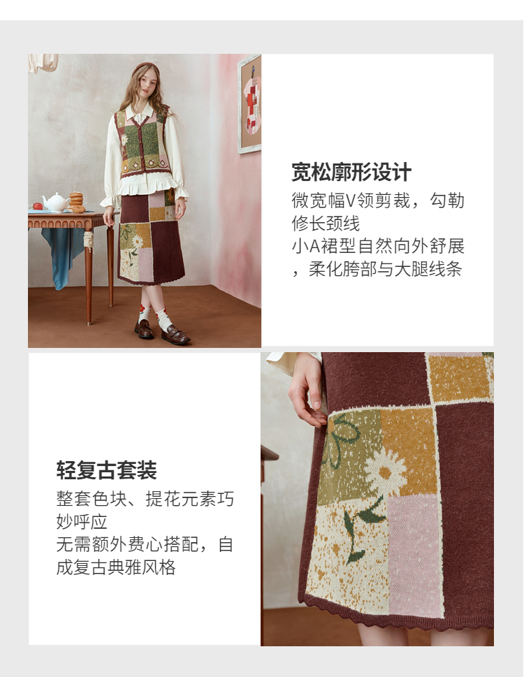 两三事梵高文艺忘忧岛2025冬季新款拼色提花马甲半身裙两件套装女