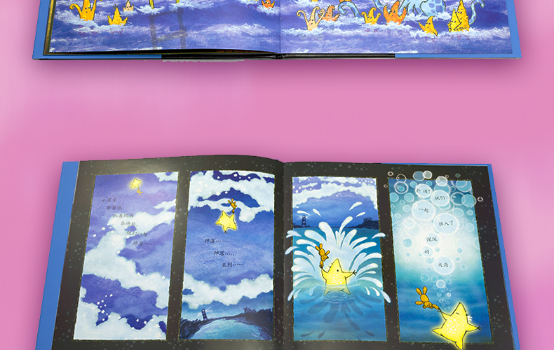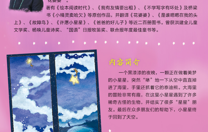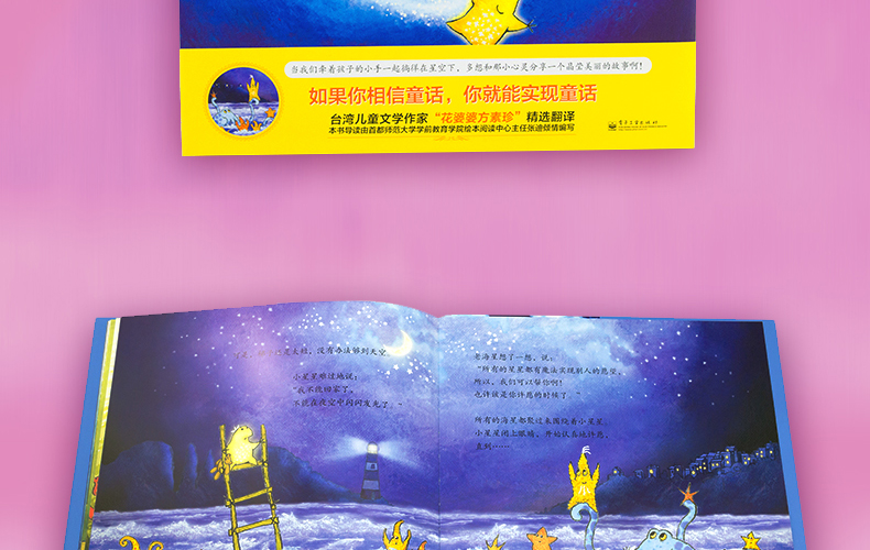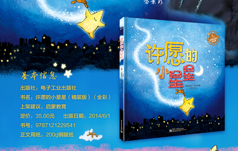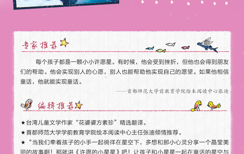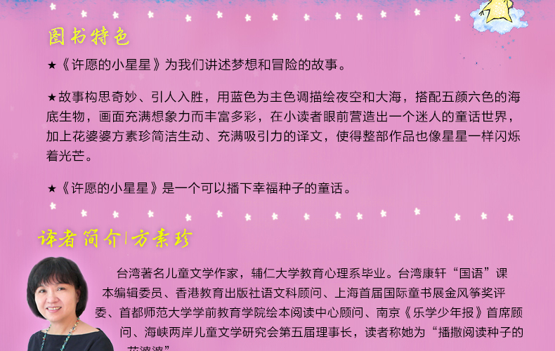 3.“当我们牵着孩子的小手一起徜徉在星空下,多想和那小心灵分享一个晶莹美丽的故事啊!那就讲《许愿的小星星》吧!让孩子和小星星一起在童话的星空与海洋间,体验一趟奇妙的愿望之旅。”