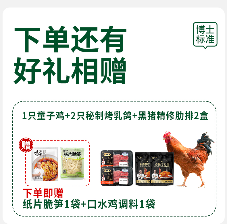 【杨博士自营 开心加倍套餐】无抗童子鸡1只+烤乳鸽2只+猪肋排2份(口水鸡调料1袋纸片脆笋1袋)