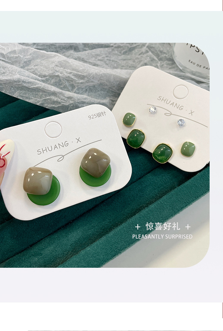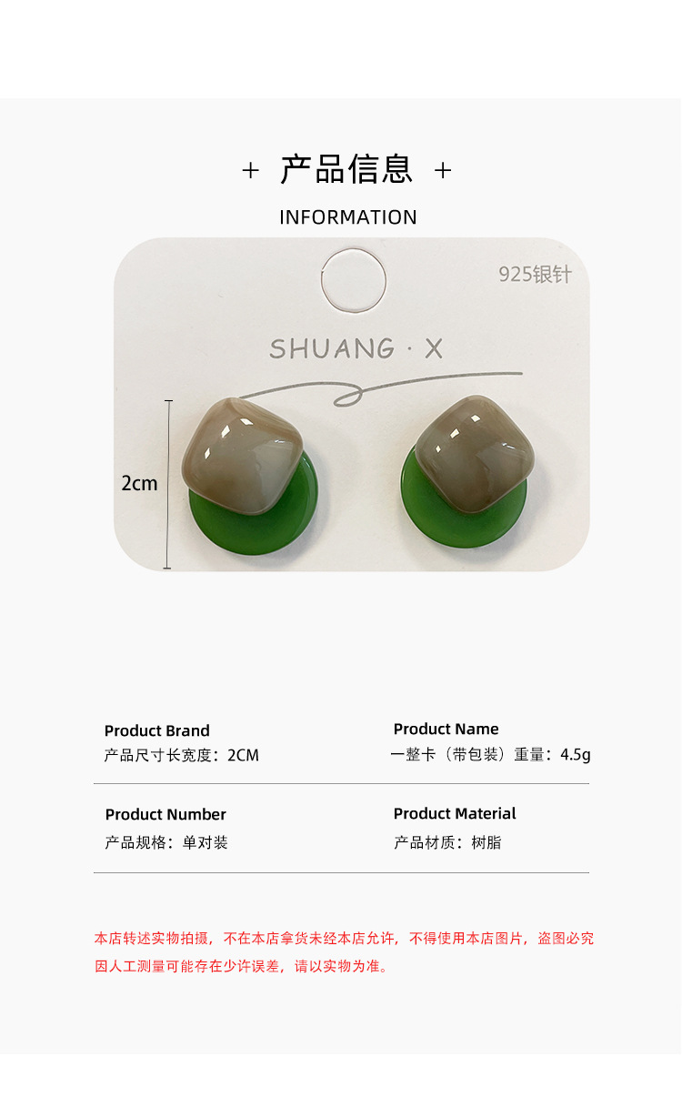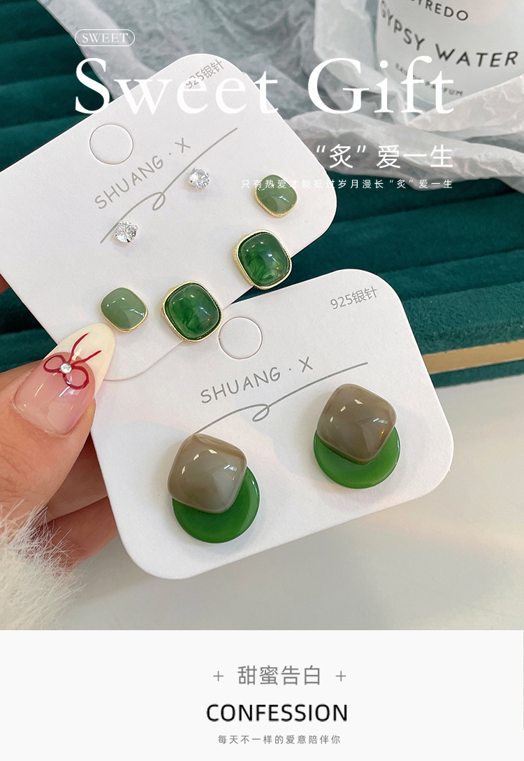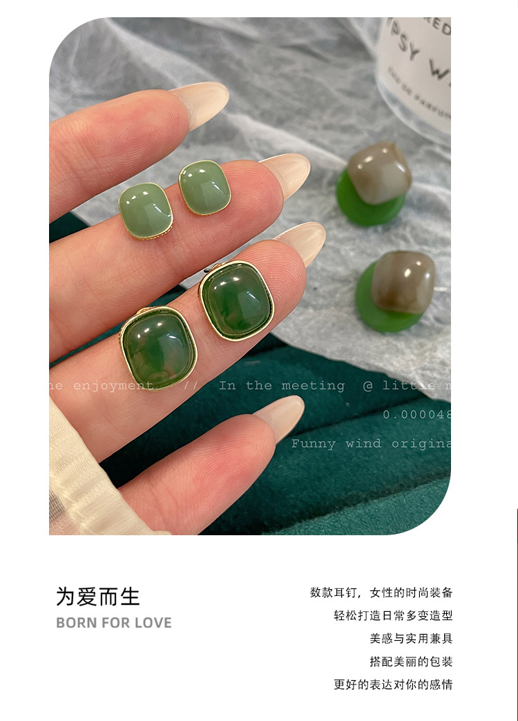 「9.9元到手!港风·复古」新品港风几何方形深绿耳钉女银针气质简约树脂古风耳饰时尚饰品