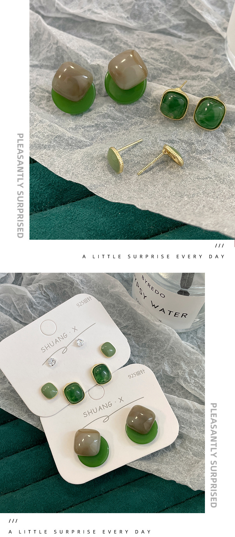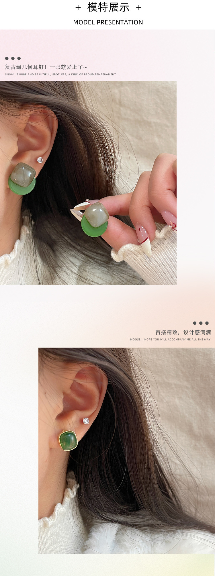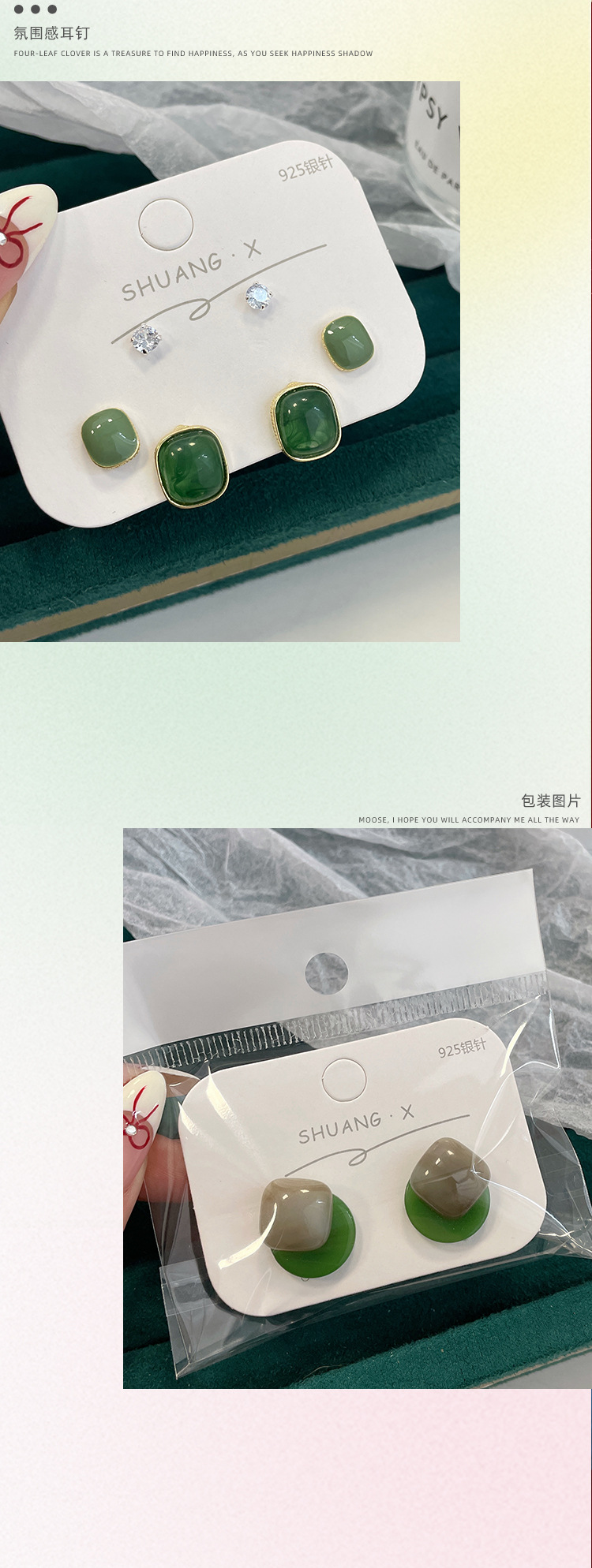 「9.9元到手!港风·复古」新品港风几何方形深绿耳钉女银针气质简约树脂古风耳饰时尚饰品