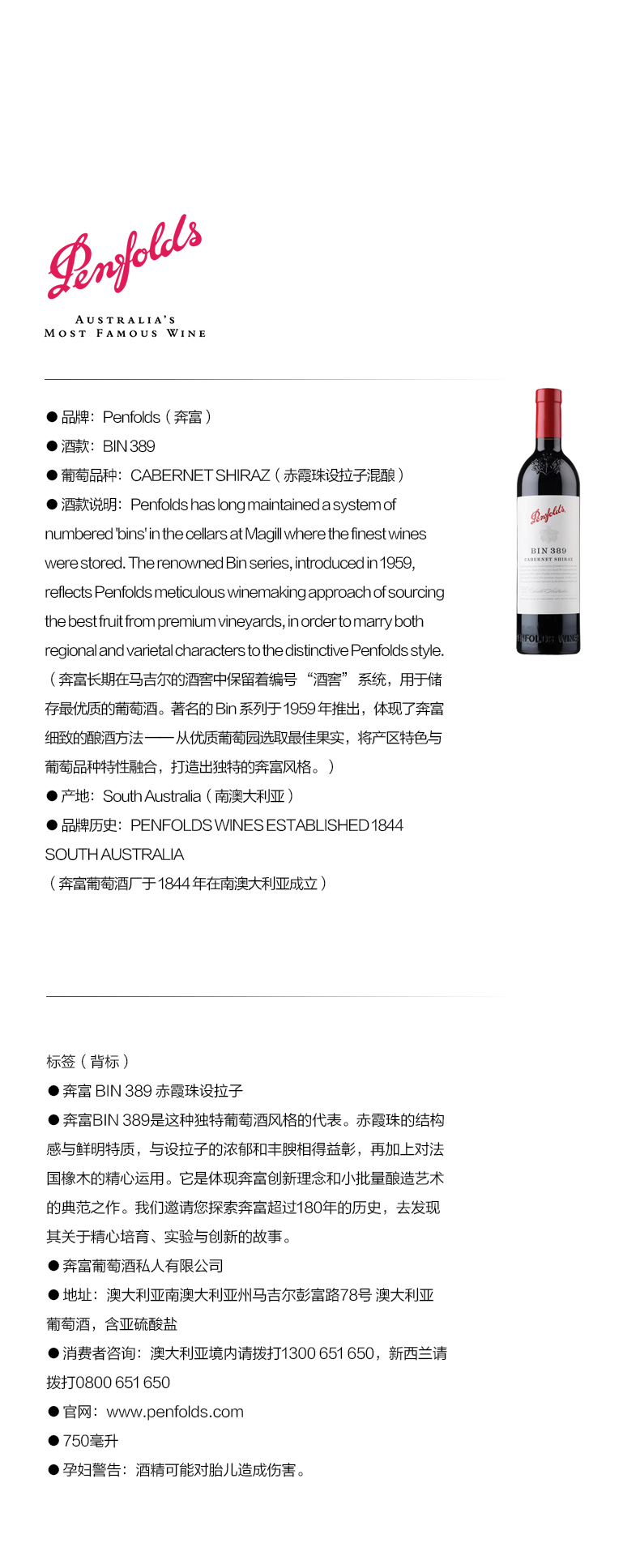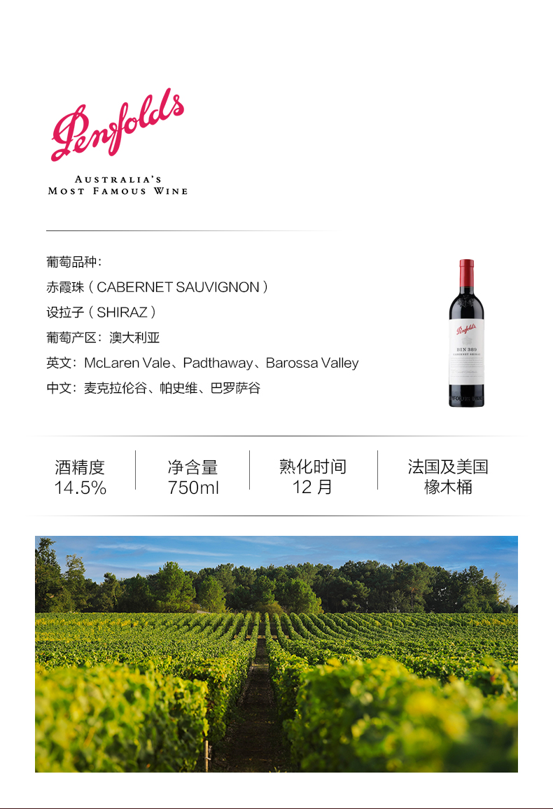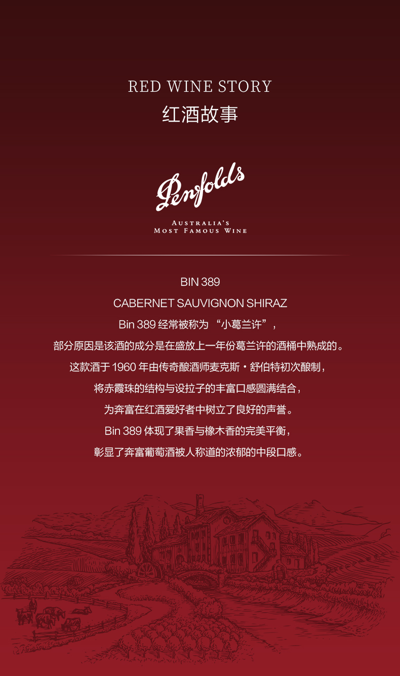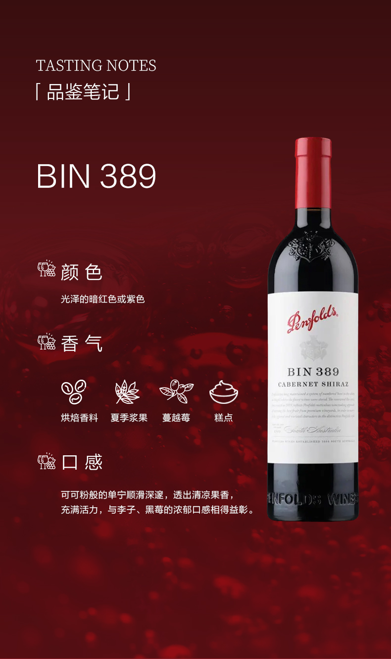奔富(Penfolds)Bin389赤霞珠设拉子干红葡萄酒裸瓶木塞750ml 澳洲原产【保税进口】