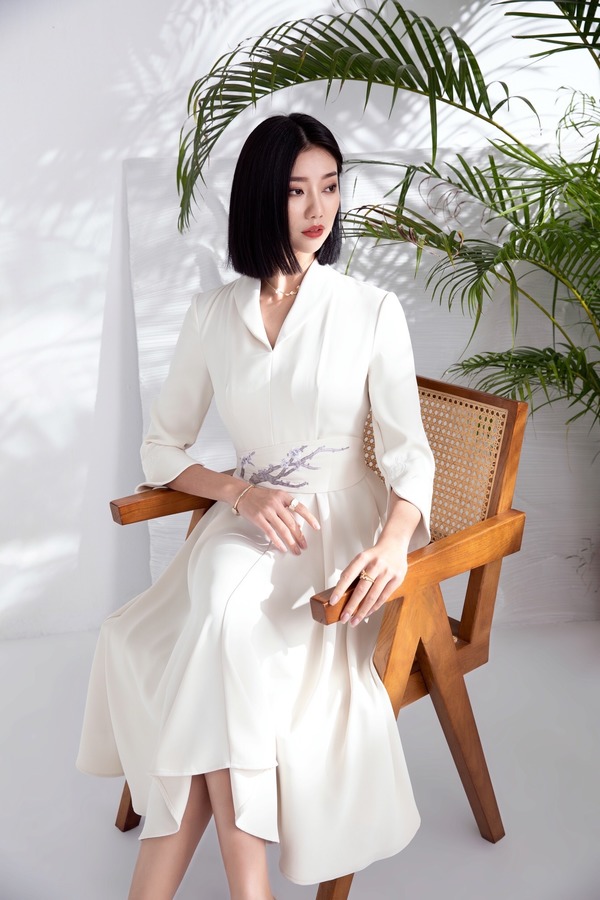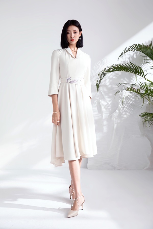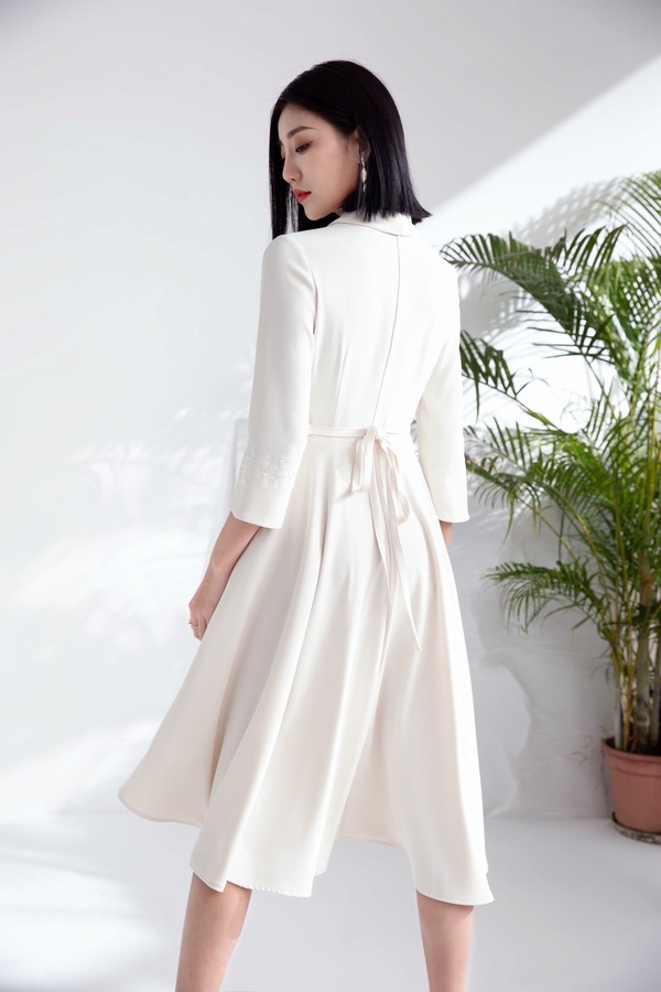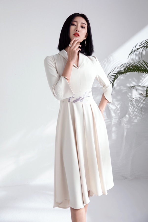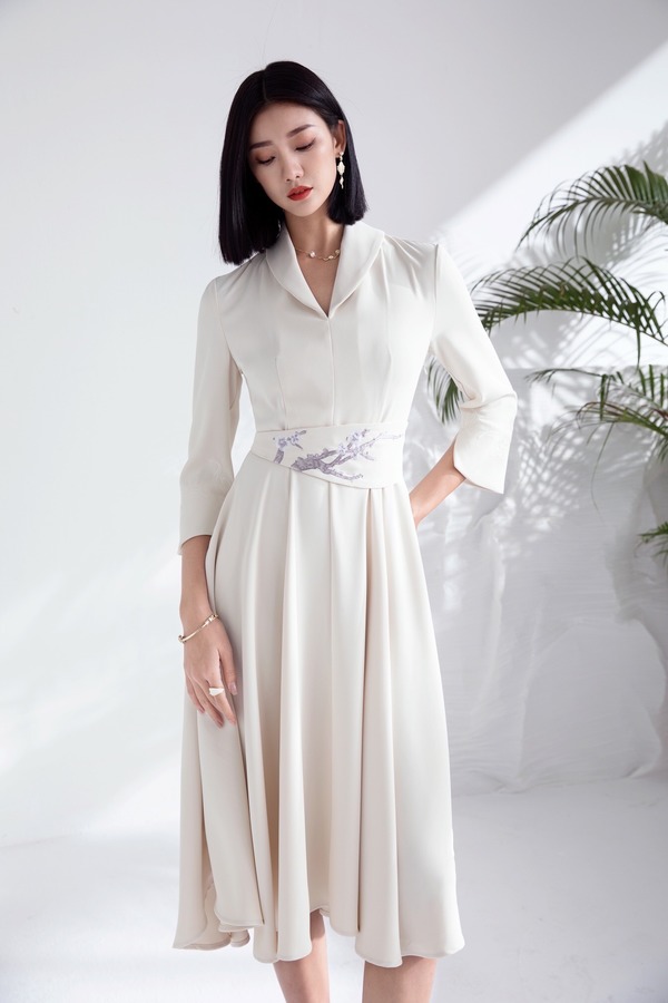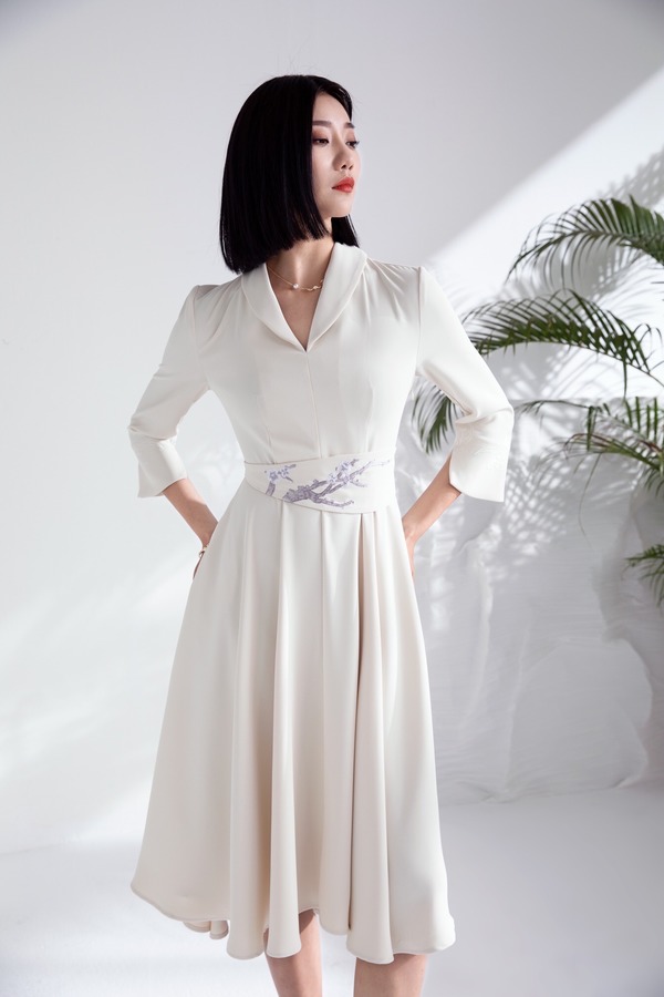 Le Malene 国风刺绣小翻领收腰大A摆连衣裙 15782