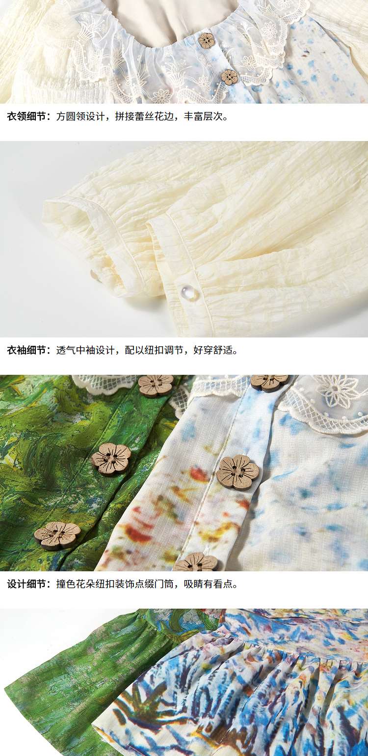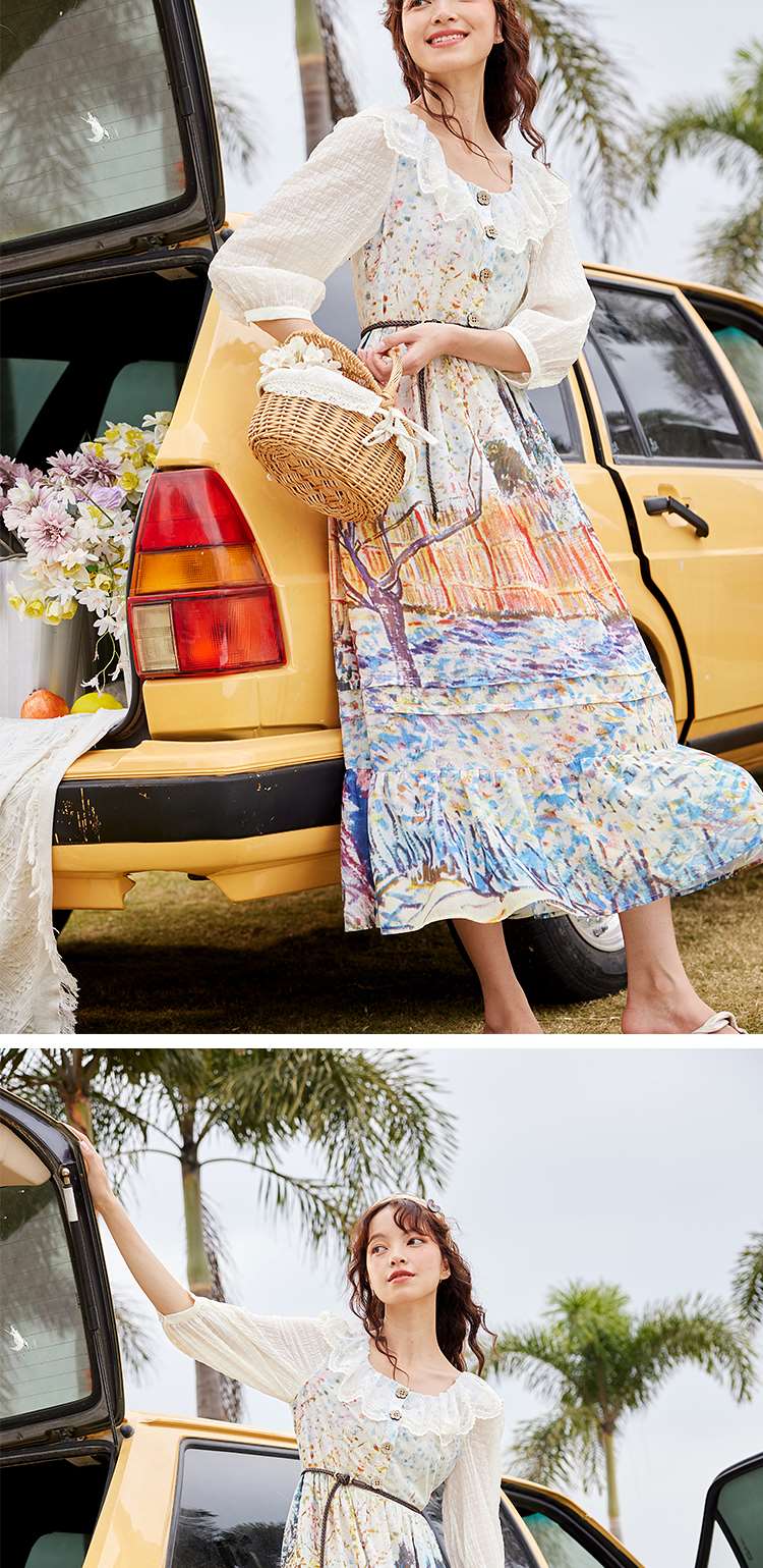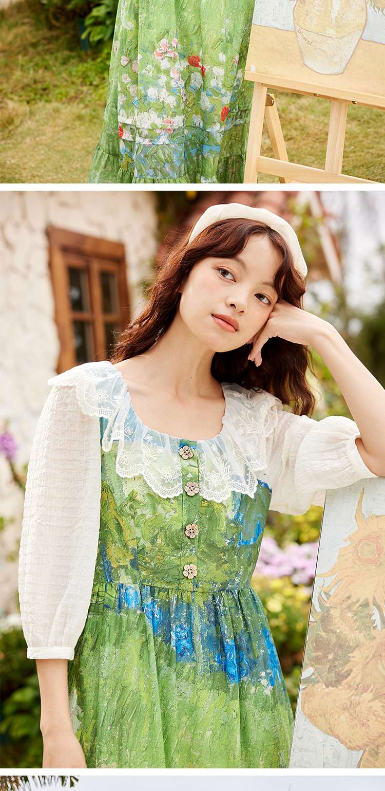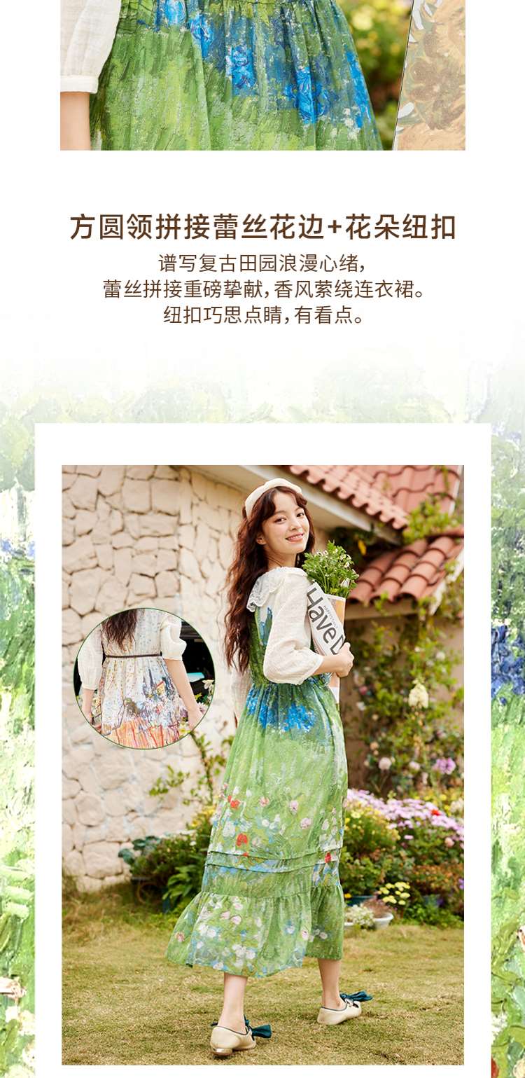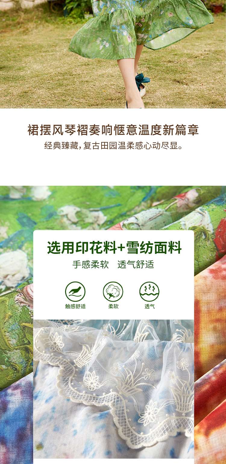 两三事月海梦游 夏季新款复古蕾丝拼接印花a字连衣裙长裙