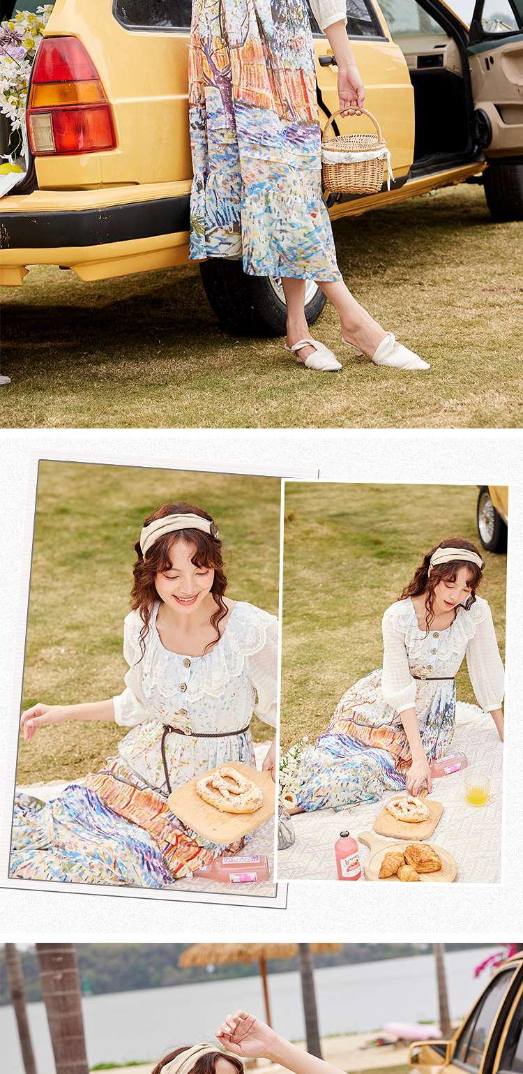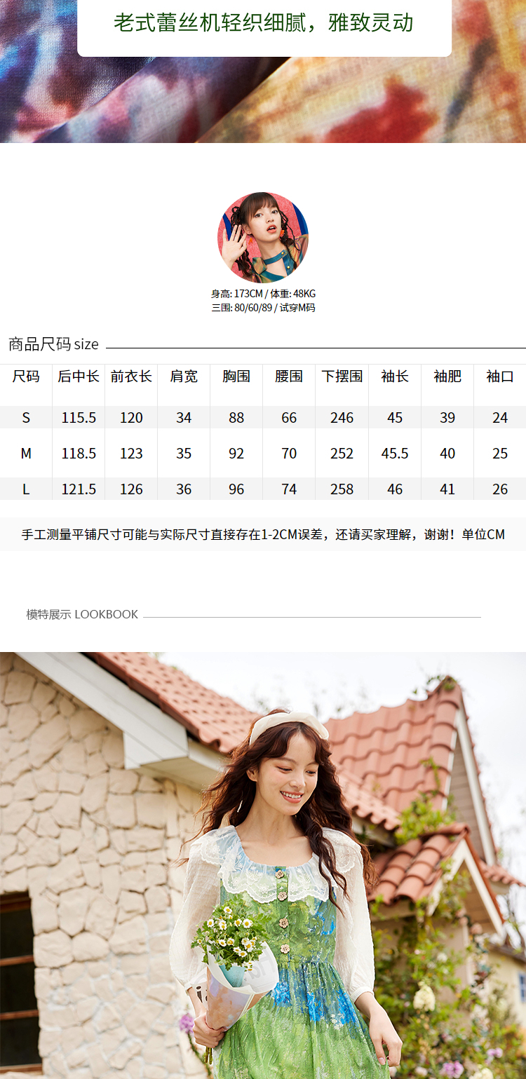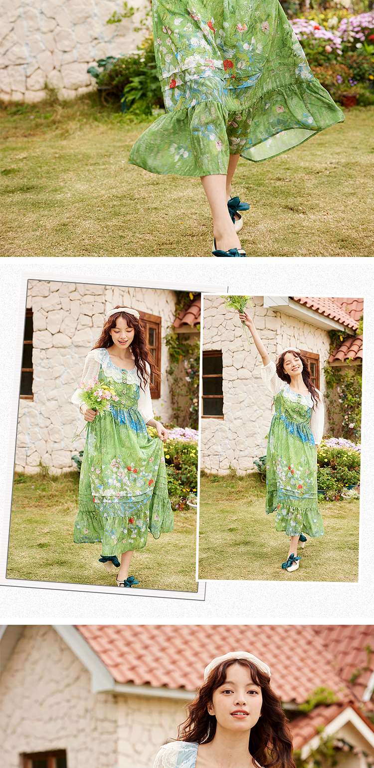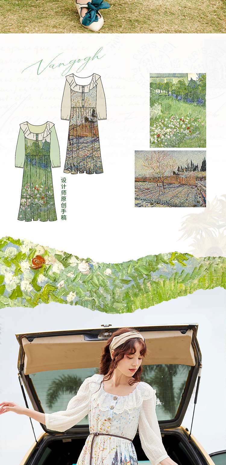 两三事月海梦游 夏季新款复古蕾丝拼接印花a字连衣裙长裙