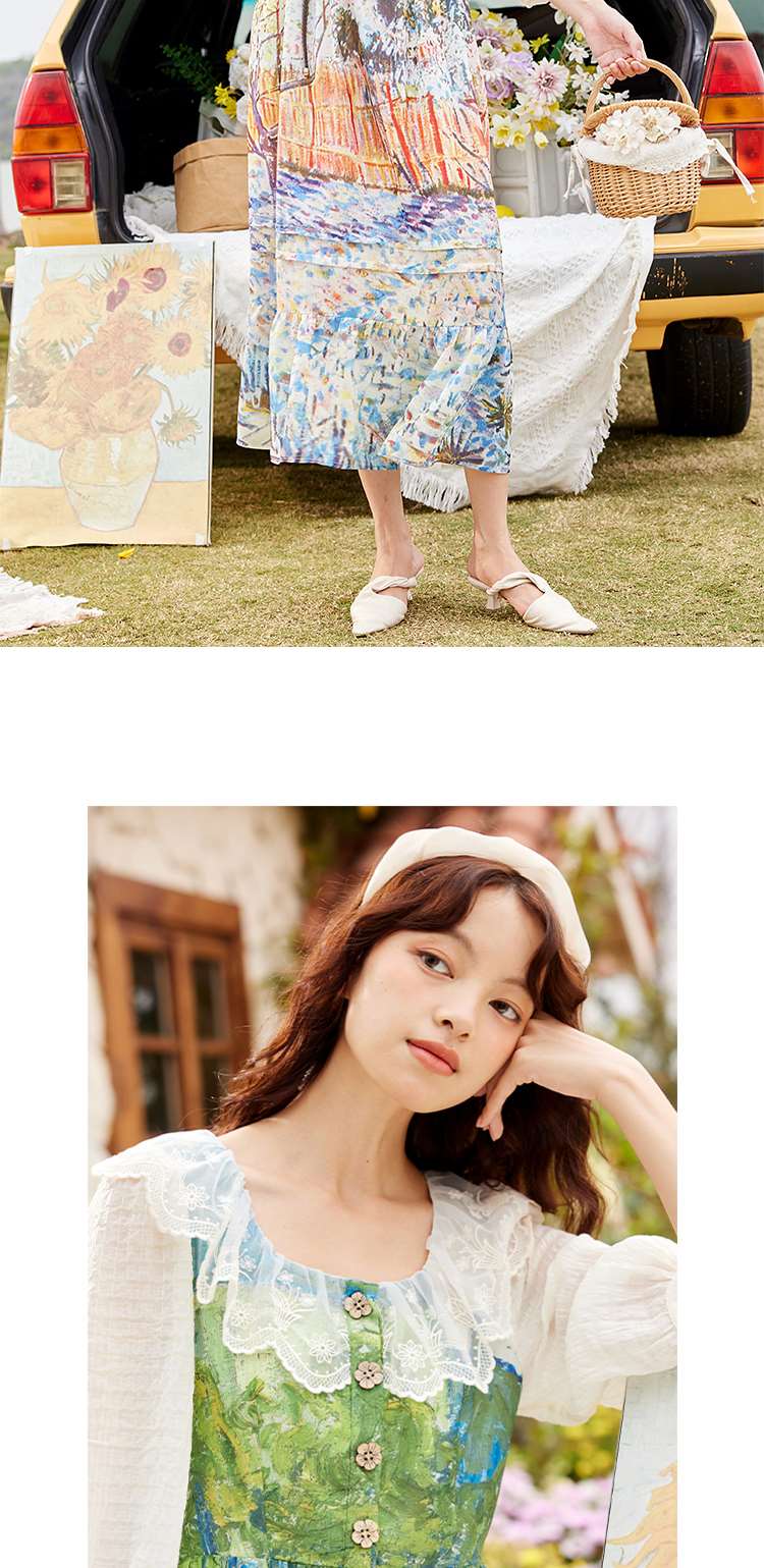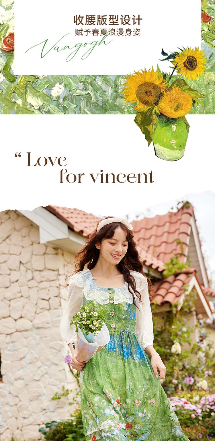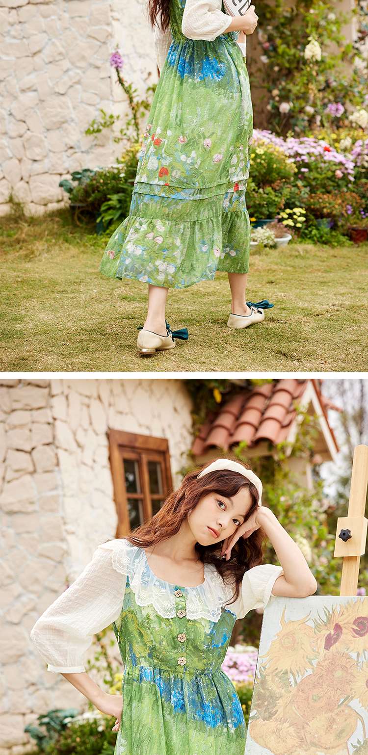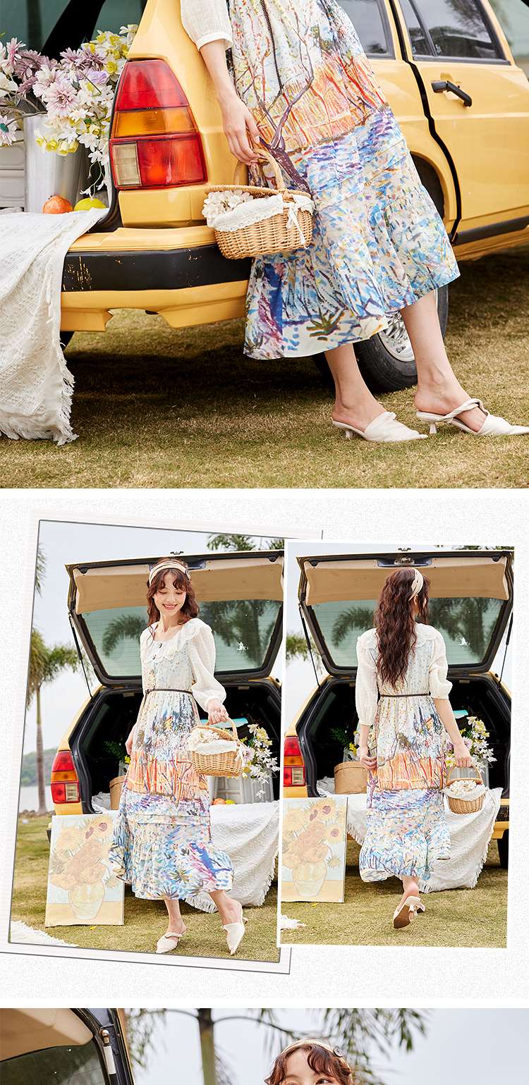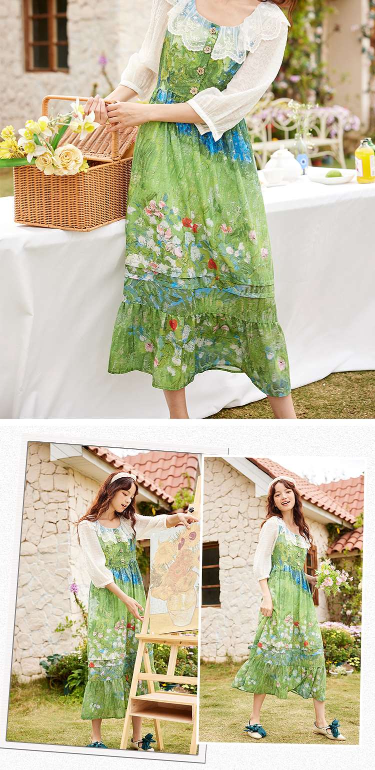 两三事月海梦游 夏季新款复古蕾丝拼接印花a字连衣裙长裙