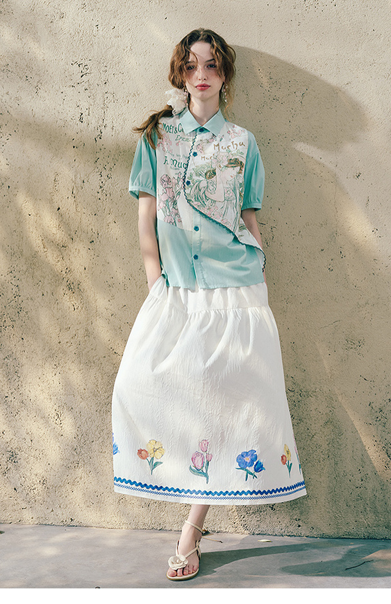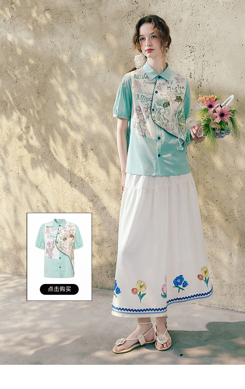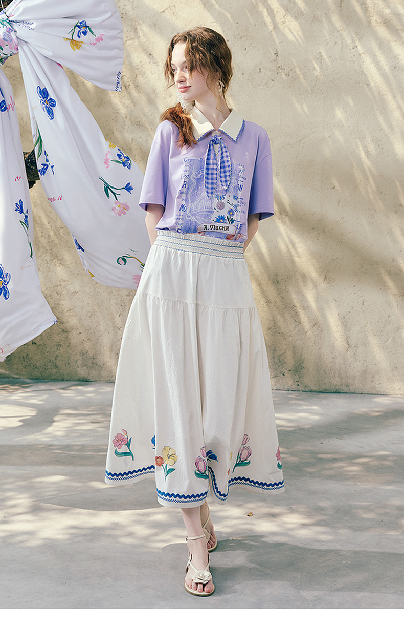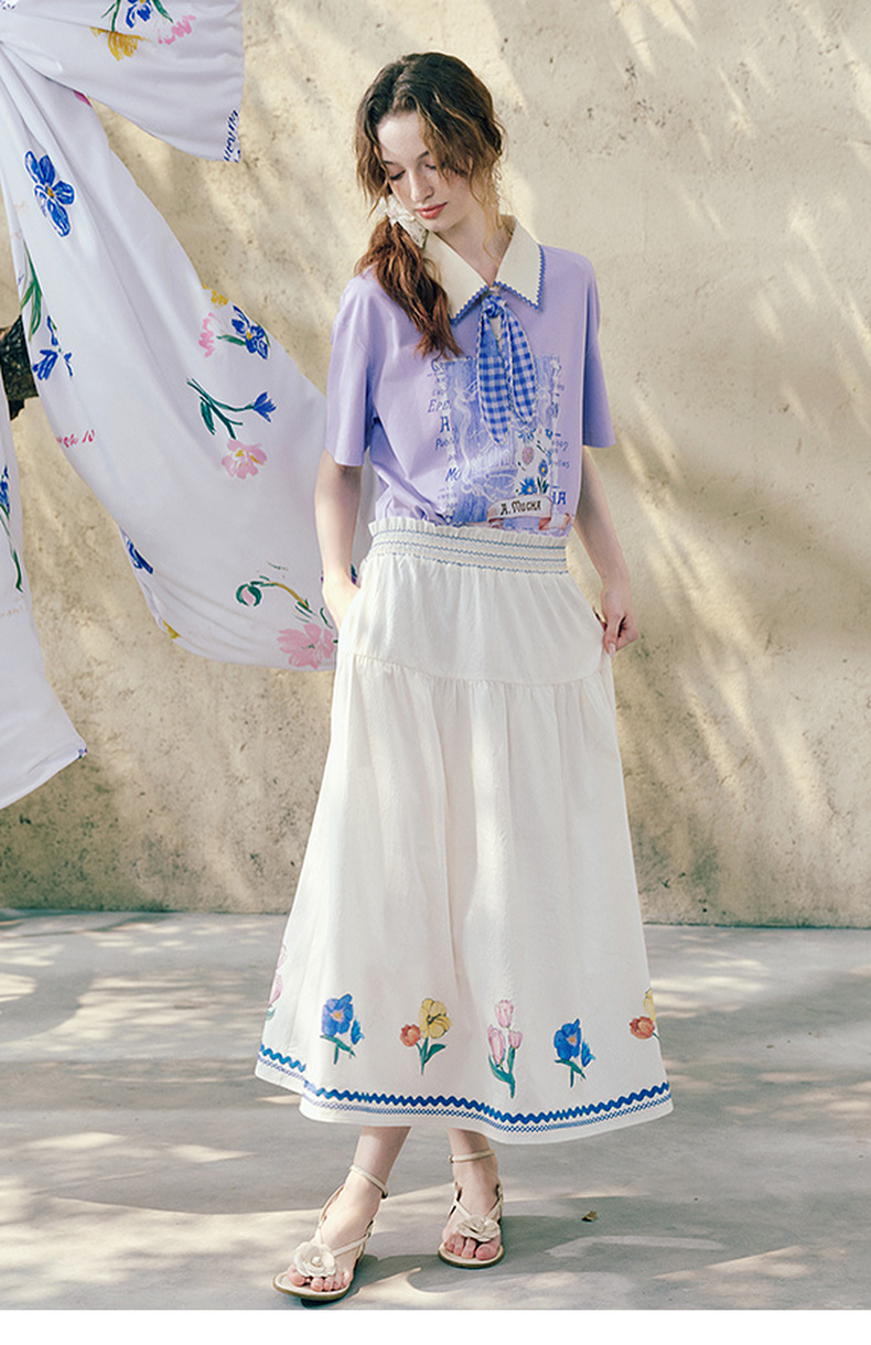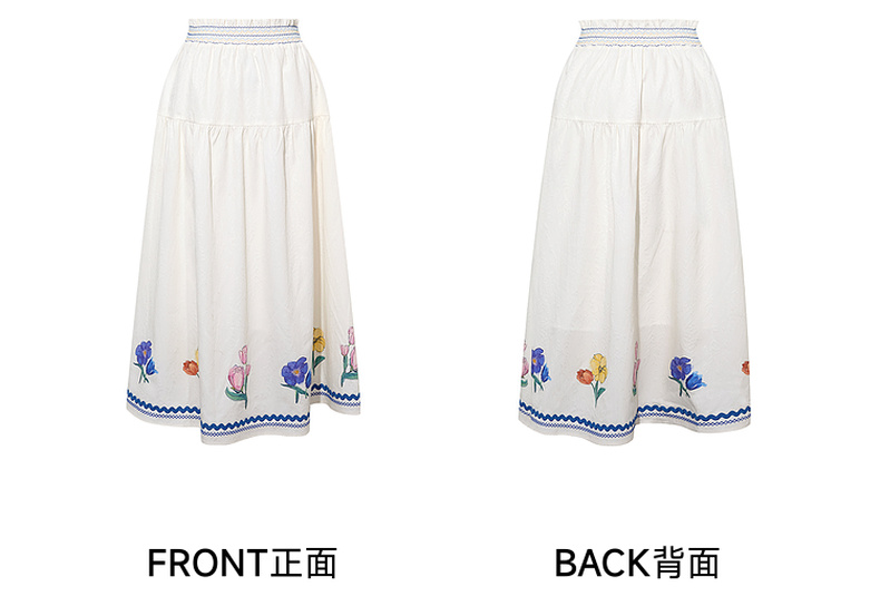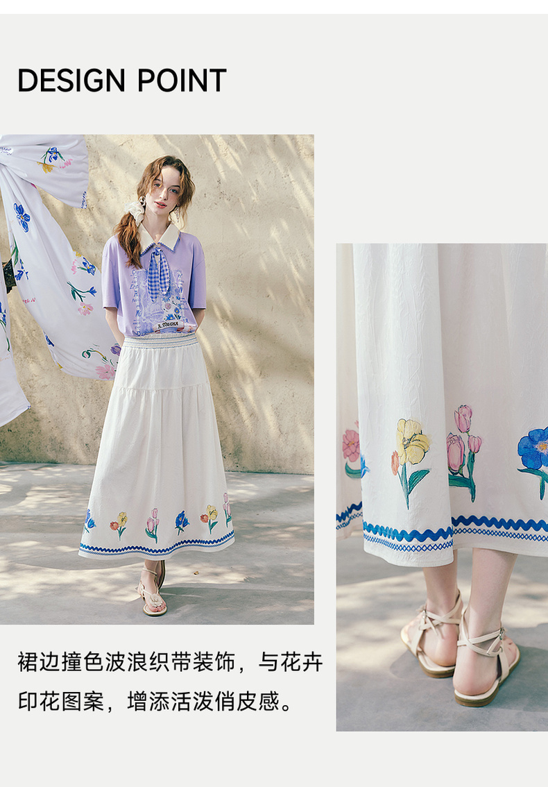 两三事 环佩蔓歌 2025夏季新款复古撞色织带拼接印花高腰半身裙