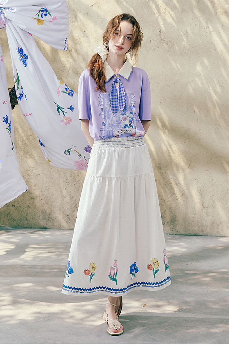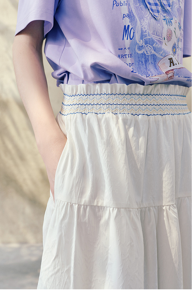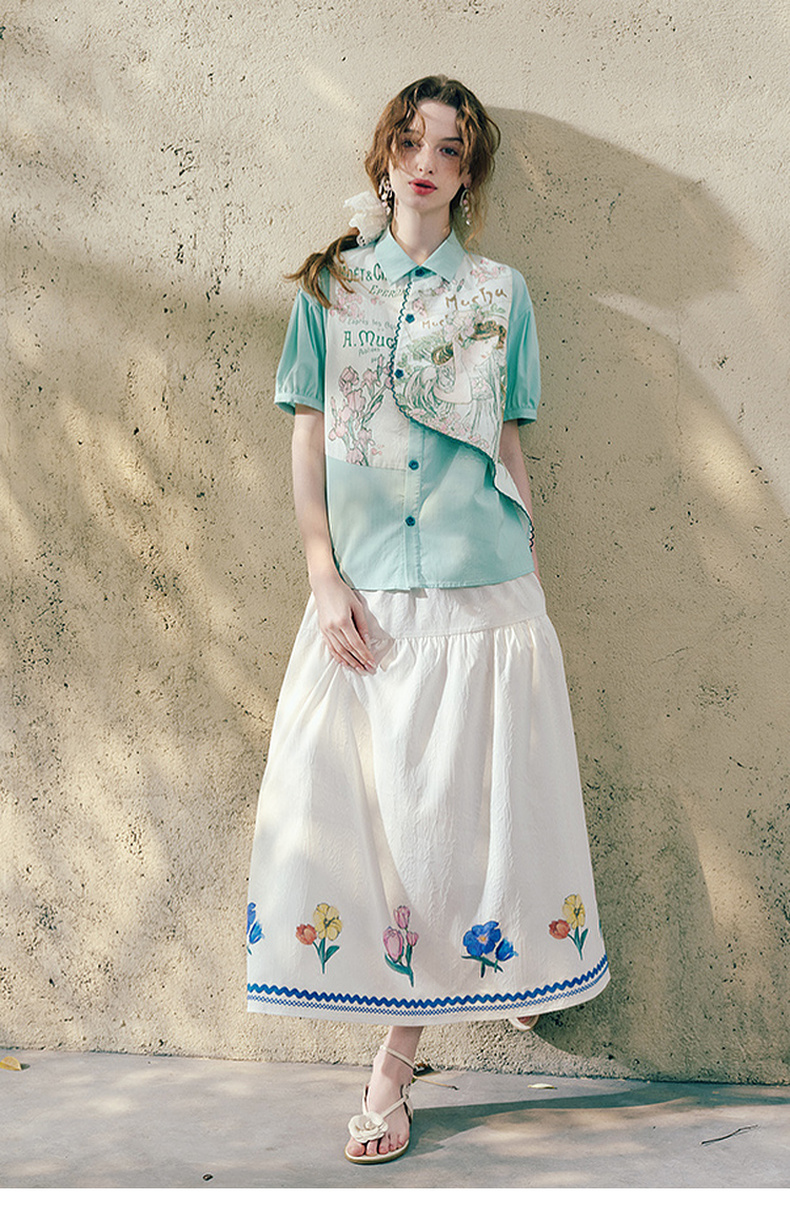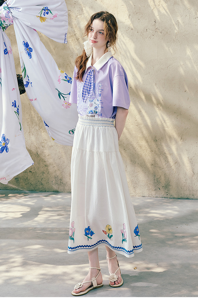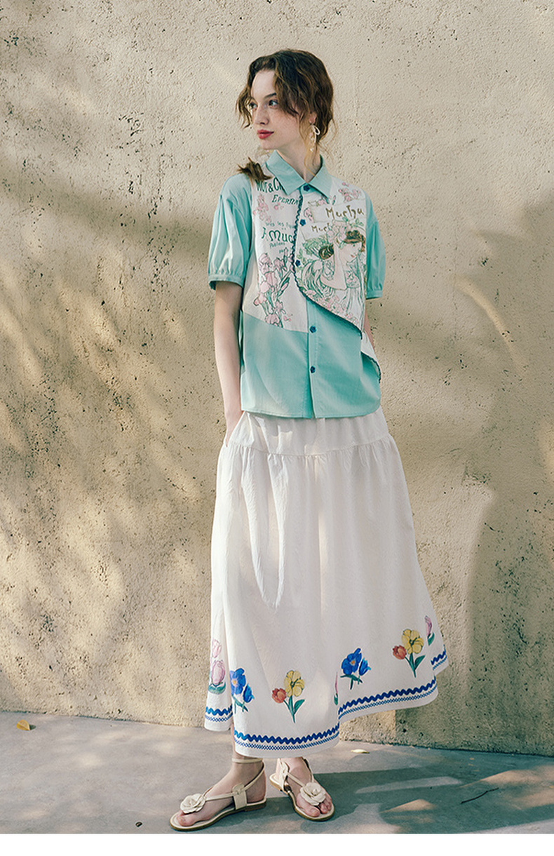 两三事 环佩蔓歌 2025夏季新款复古撞色织带拼接印花高腰半身裙
