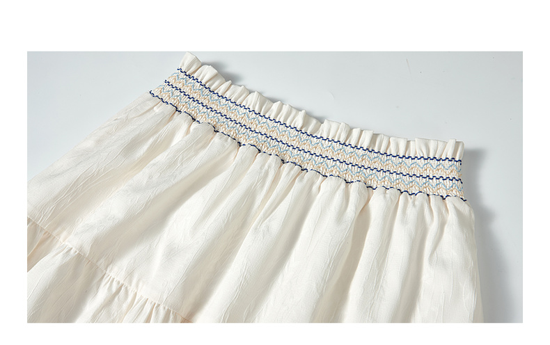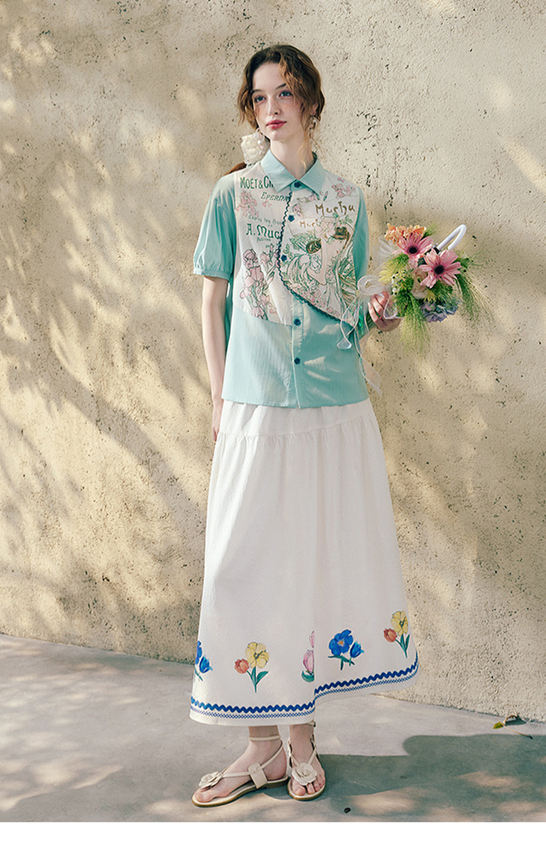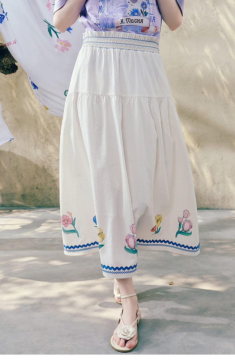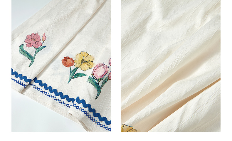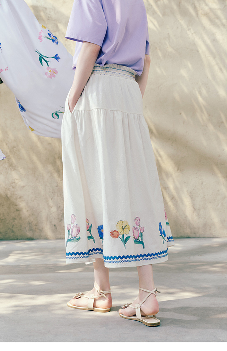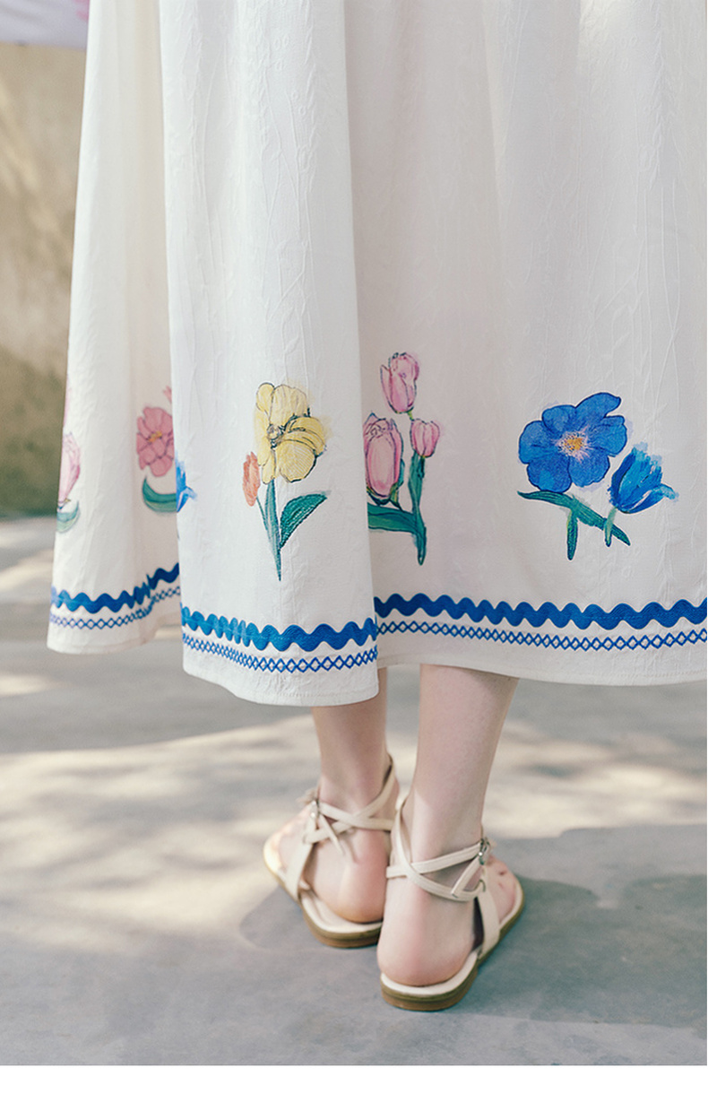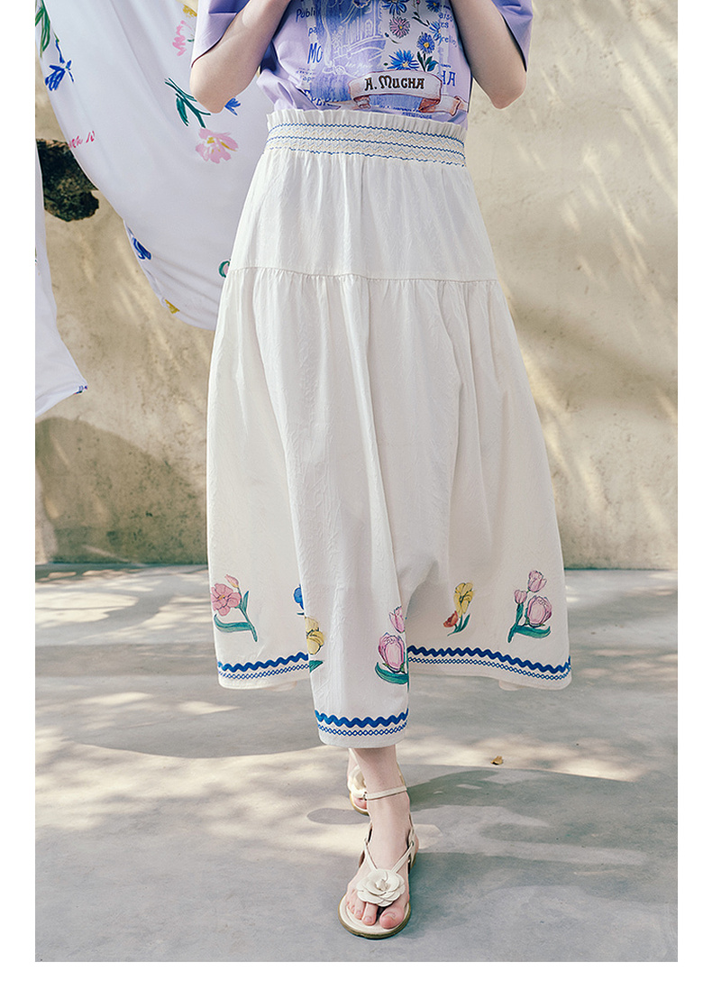 两三事 环佩蔓歌 2025夏季新款复古撞色织带拼接印花高腰半身裙