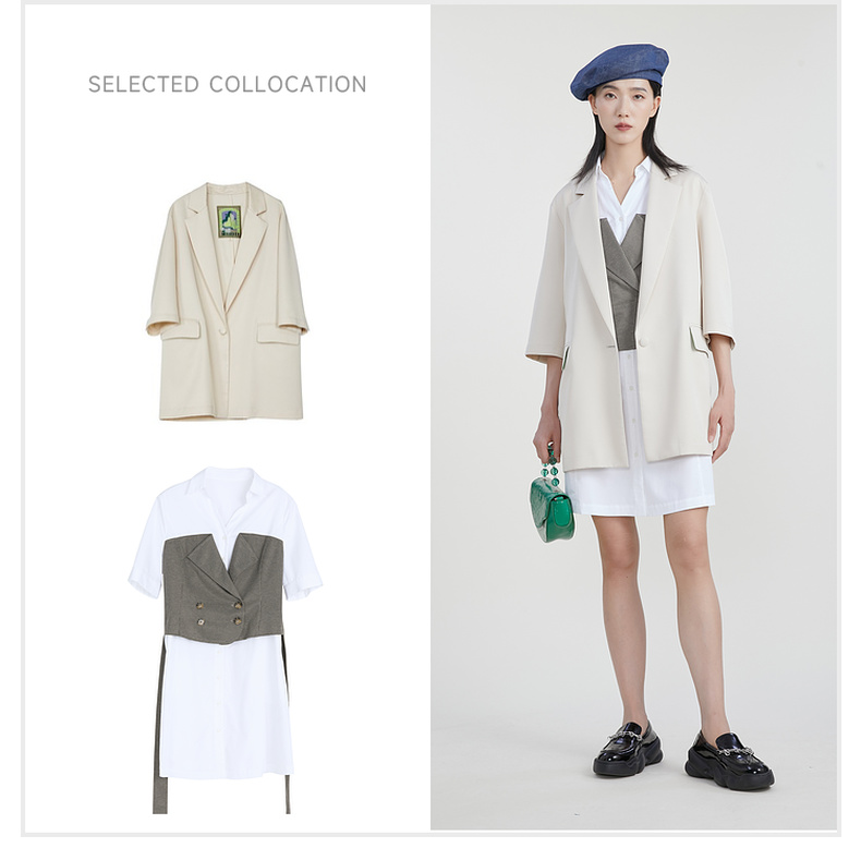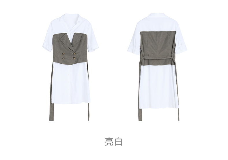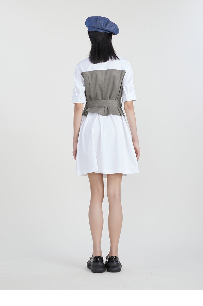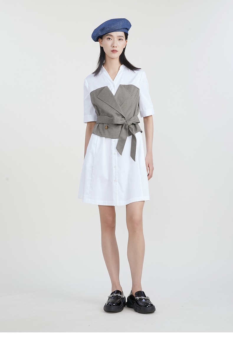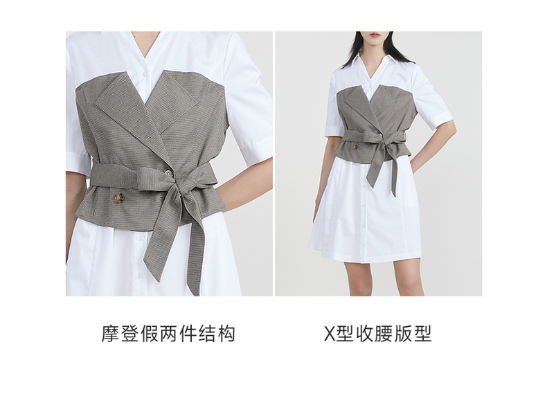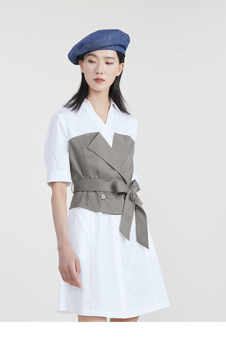 谜底收腰拼接连衣裙女2023春季新款时尚翻领中长裙短袖231ML0107