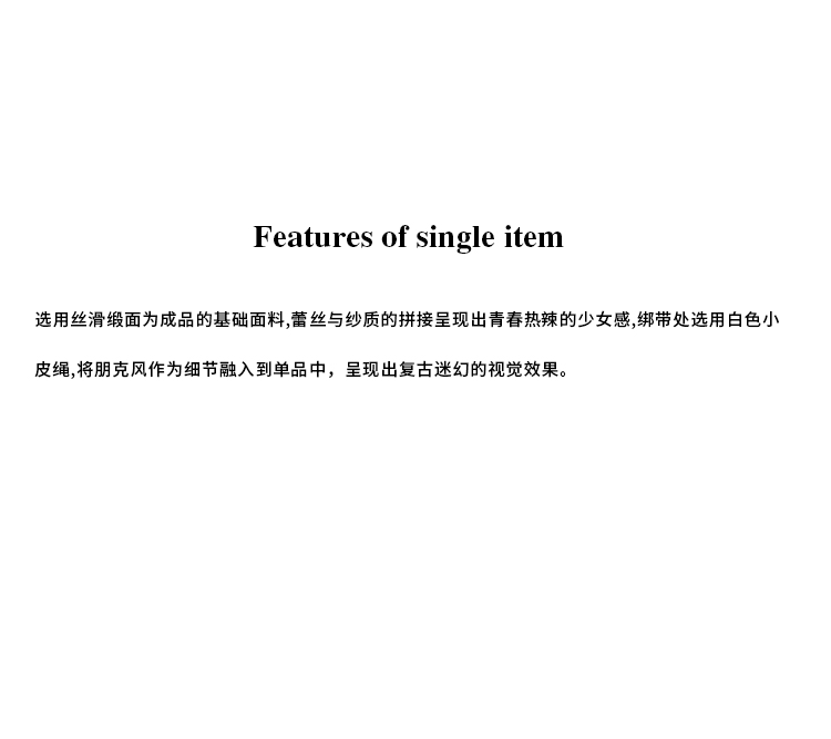 | 裙长: 短裙 | 流行元素/工艺: 蝴蝶结,荷叶边,露背,系带,拼接,绑带,拉链,蕾丝 |