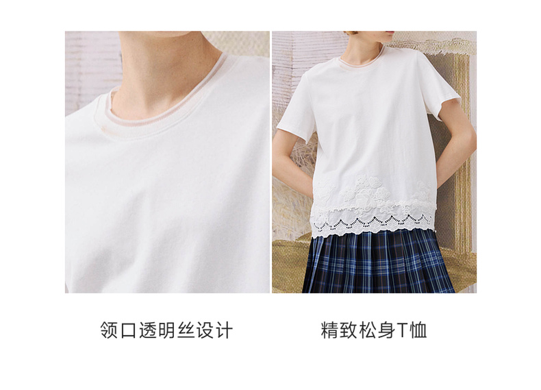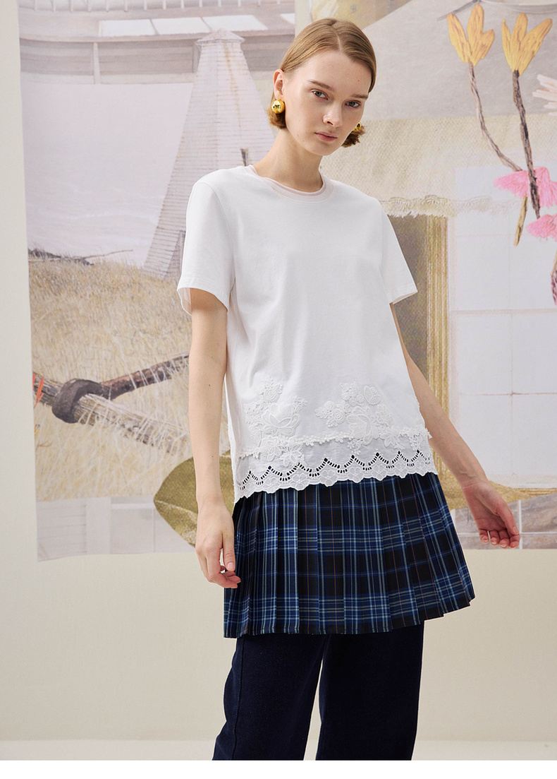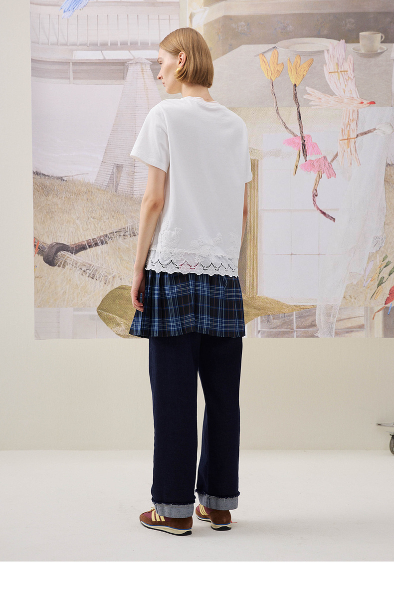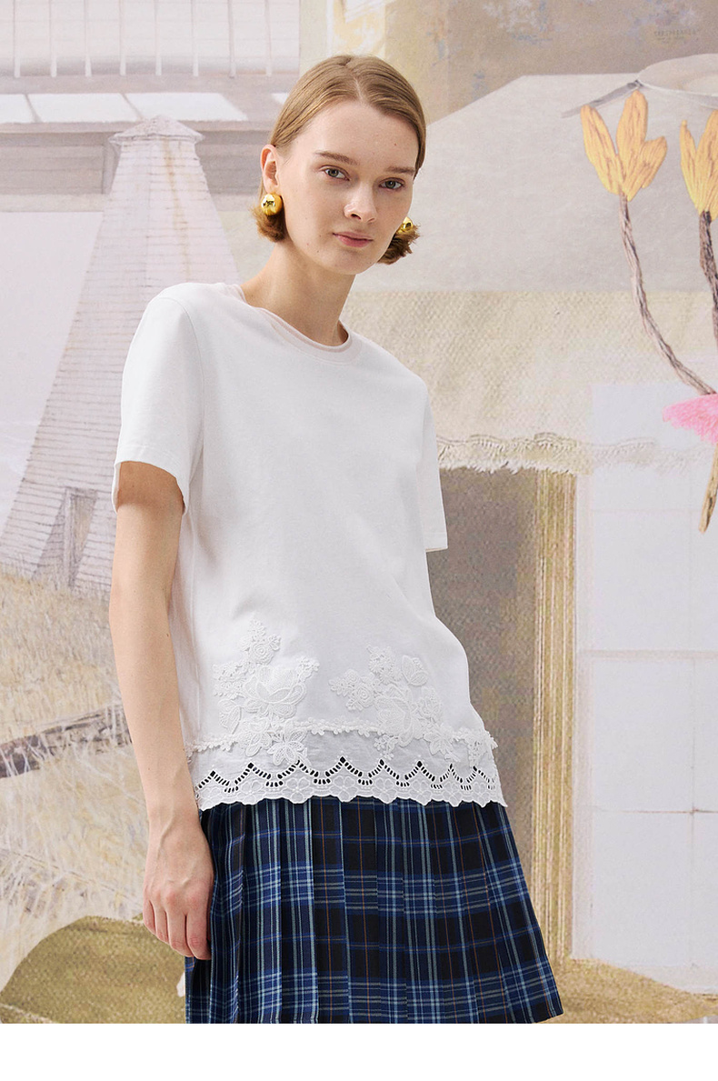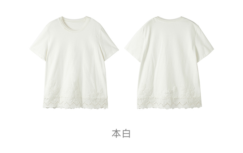 谜底简约T恤短袖2025年冬季新品纯棉亲肤下摆拼接蕾丝女254MT1723