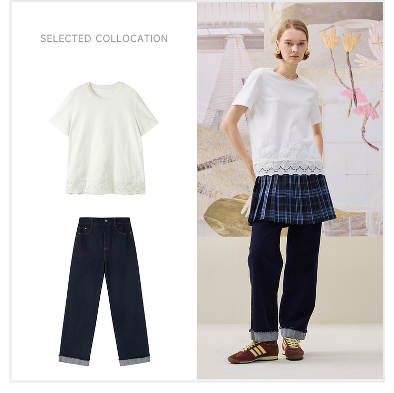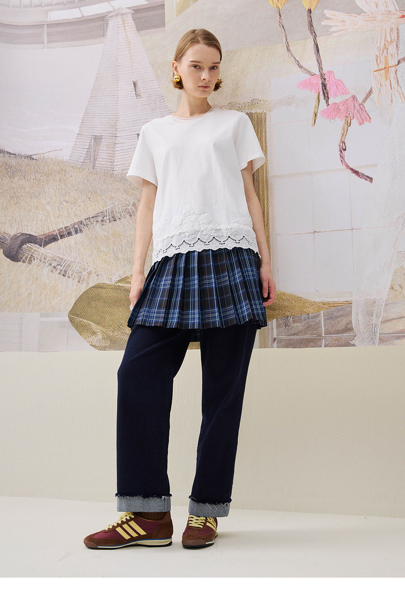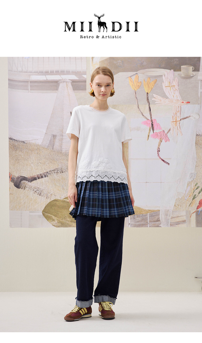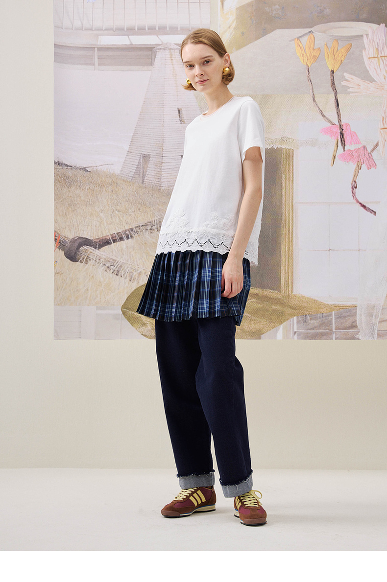 谜底简约T恤短袖2025年冬季新品纯棉亲肤下摆拼接蕾丝女254MT1723
