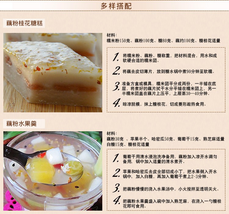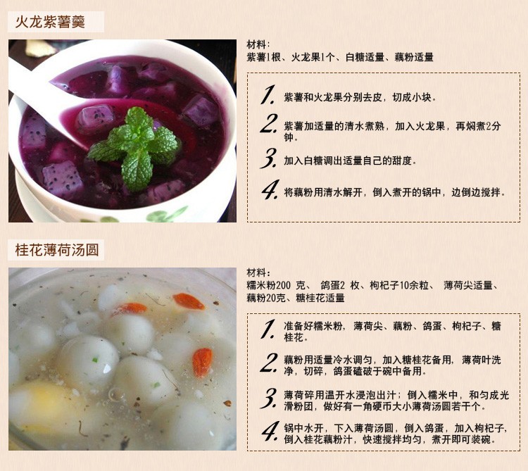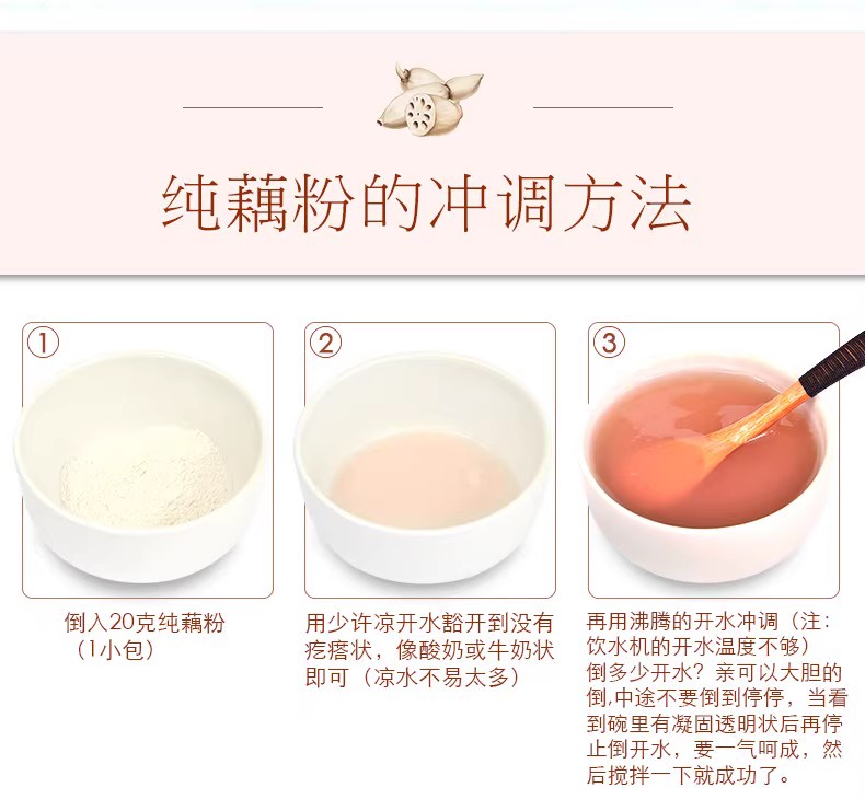 【食用方法】取一小袋,温水豁匀(如牛奶状),围着碗边倒入沸水,看到透明凝 固状后即冲调成功,搅拌均匀后加白糖、红糖或者坚果、桂花口感更佳。