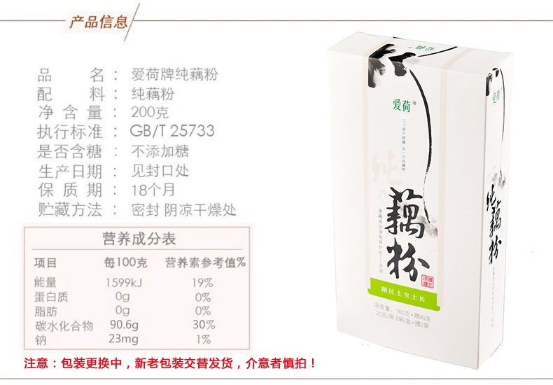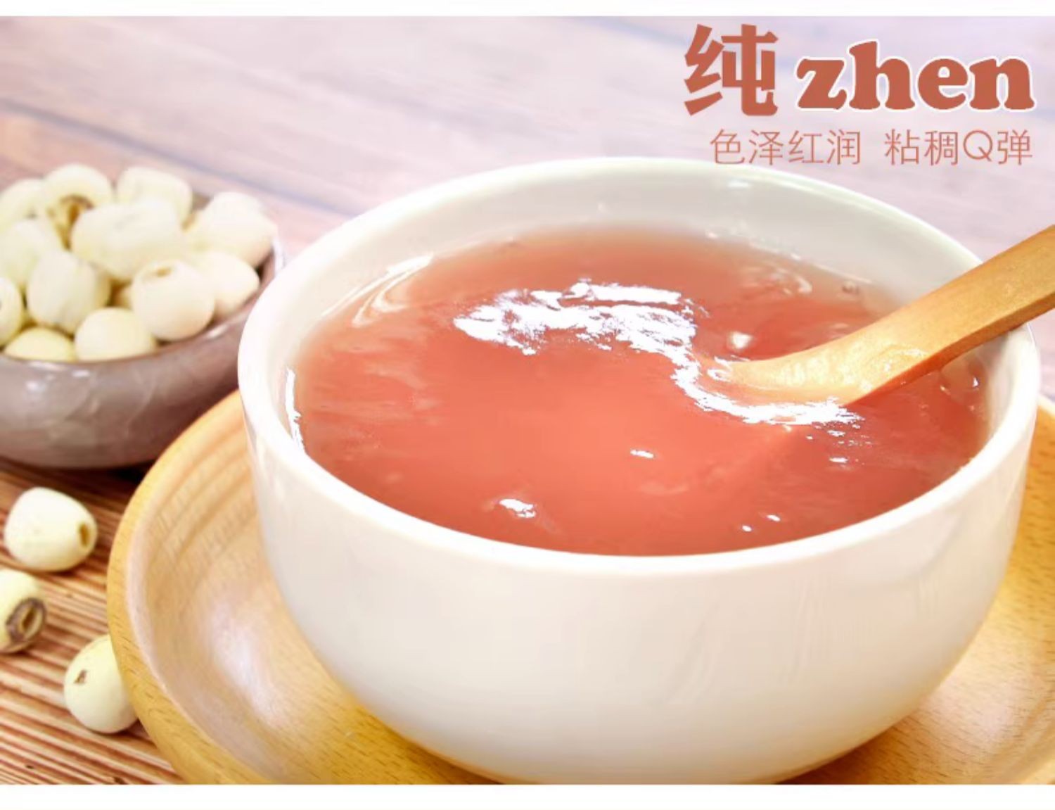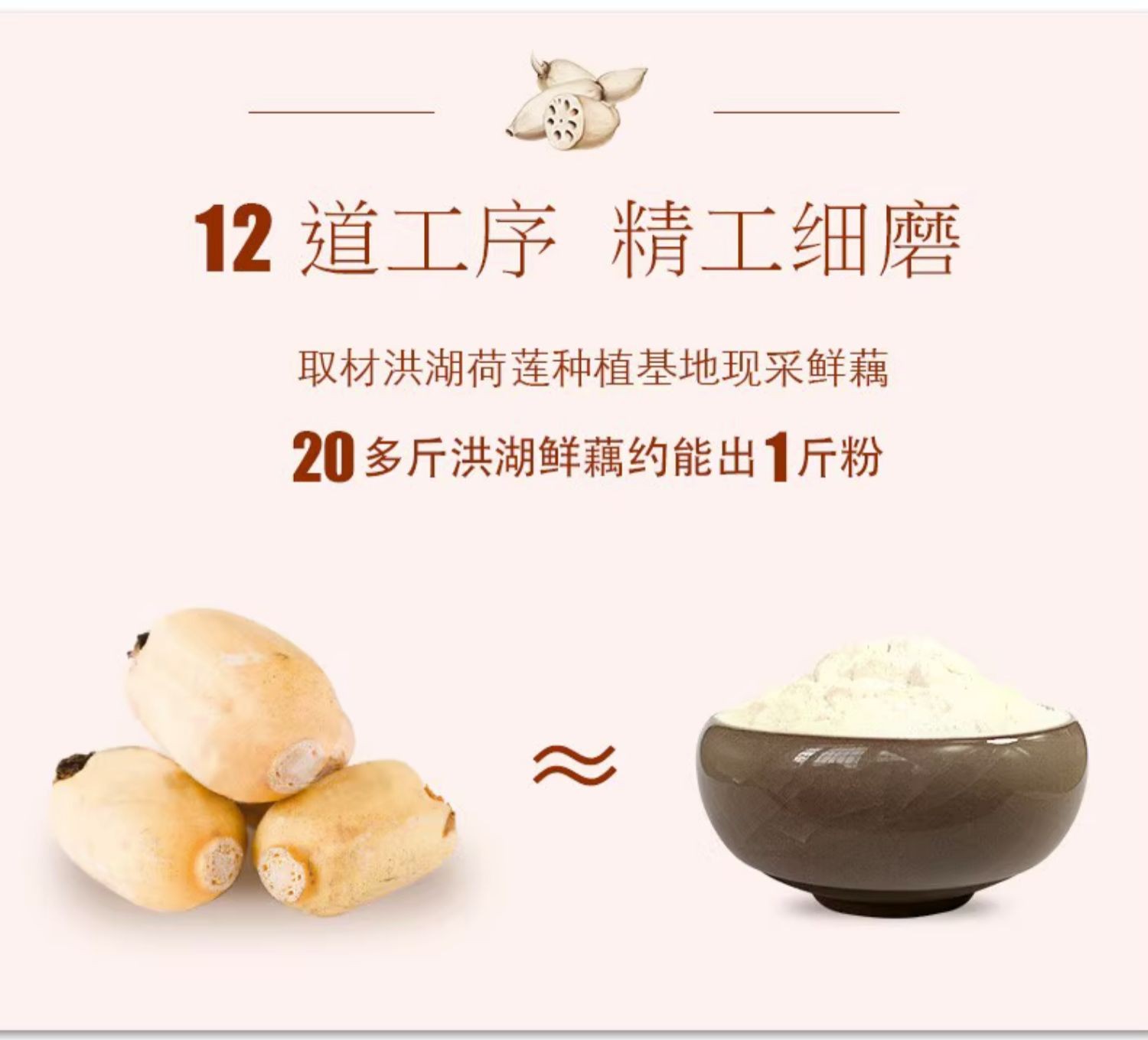 爱荷纯藕粉,自产自销十多年,藕粉制作全程不添加任何色素和添加剂,里面只有莲藕。10斤莲藕才出1斤纯藕粉。只所以纯,才让更多的消费者青睐。经过权威检测部门实测:爱荷纯藕粉中典型性藕淀粉颗粒含量大于70%(国标GB/T25733中要求大于等于50%为纯藕粉)