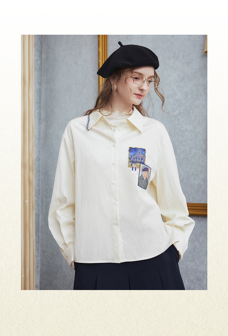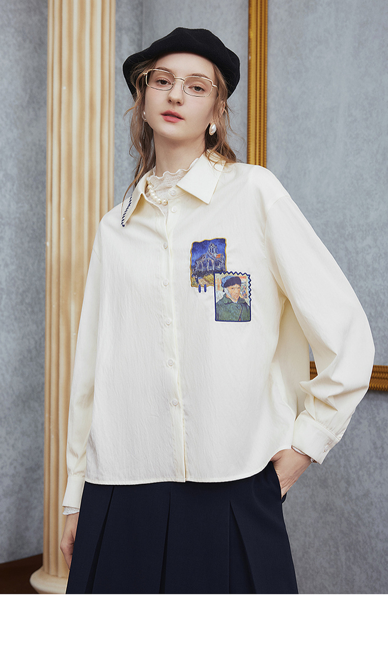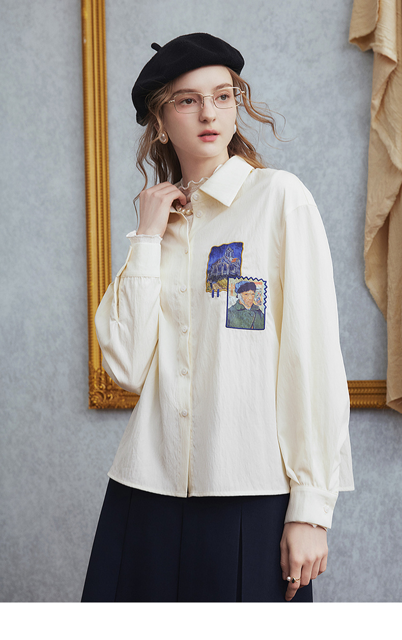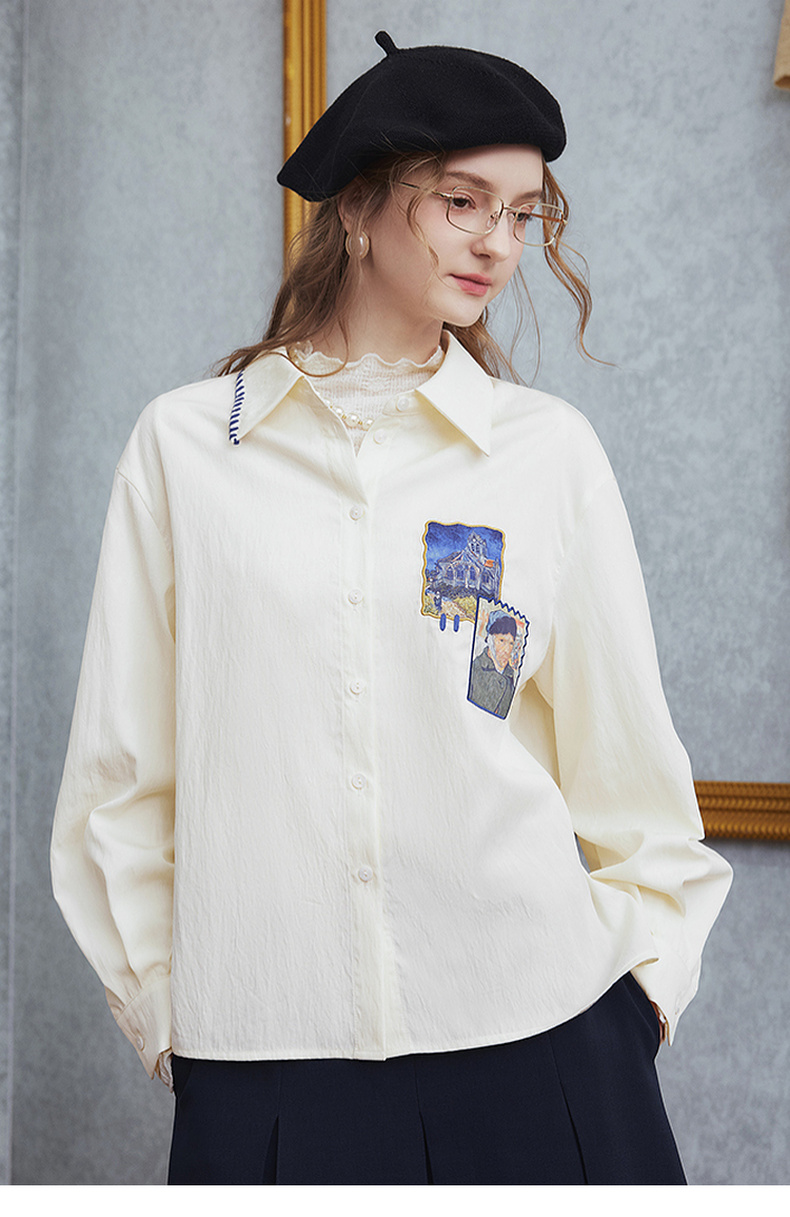 两三事梵高文艺 雪山牧歌 2025秋季新款贴布绣撞色绣边翻领衬衫女