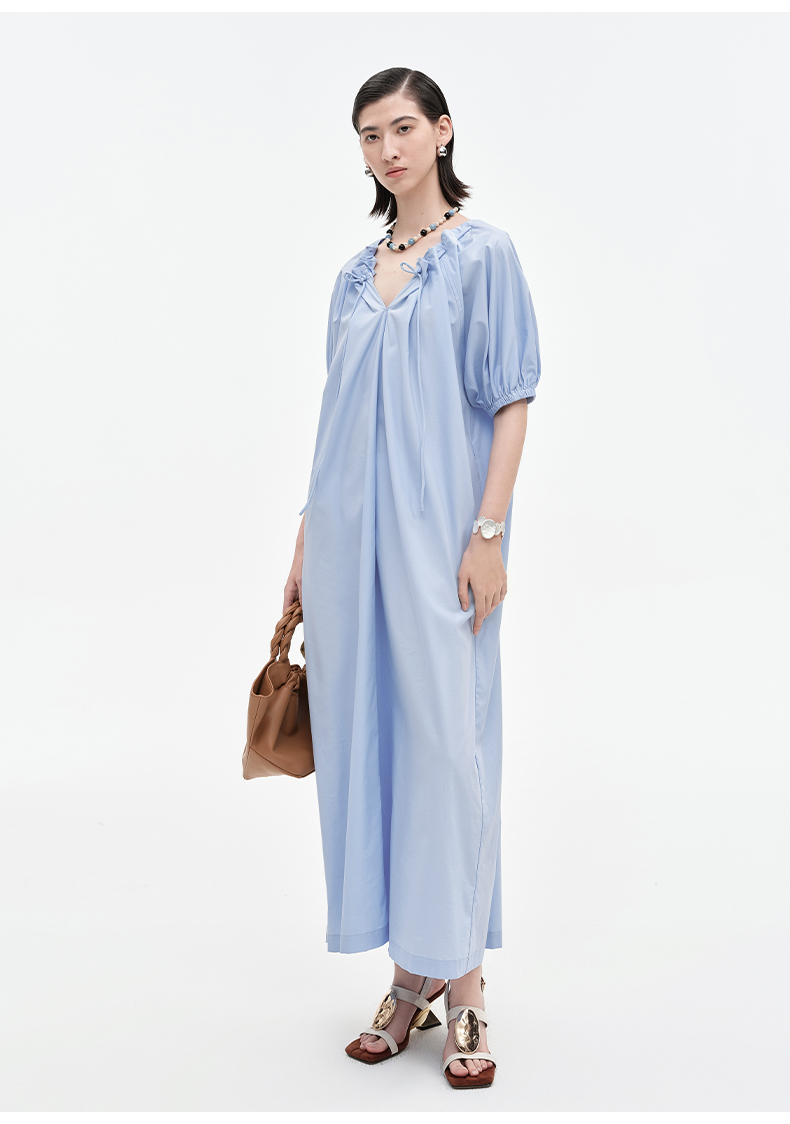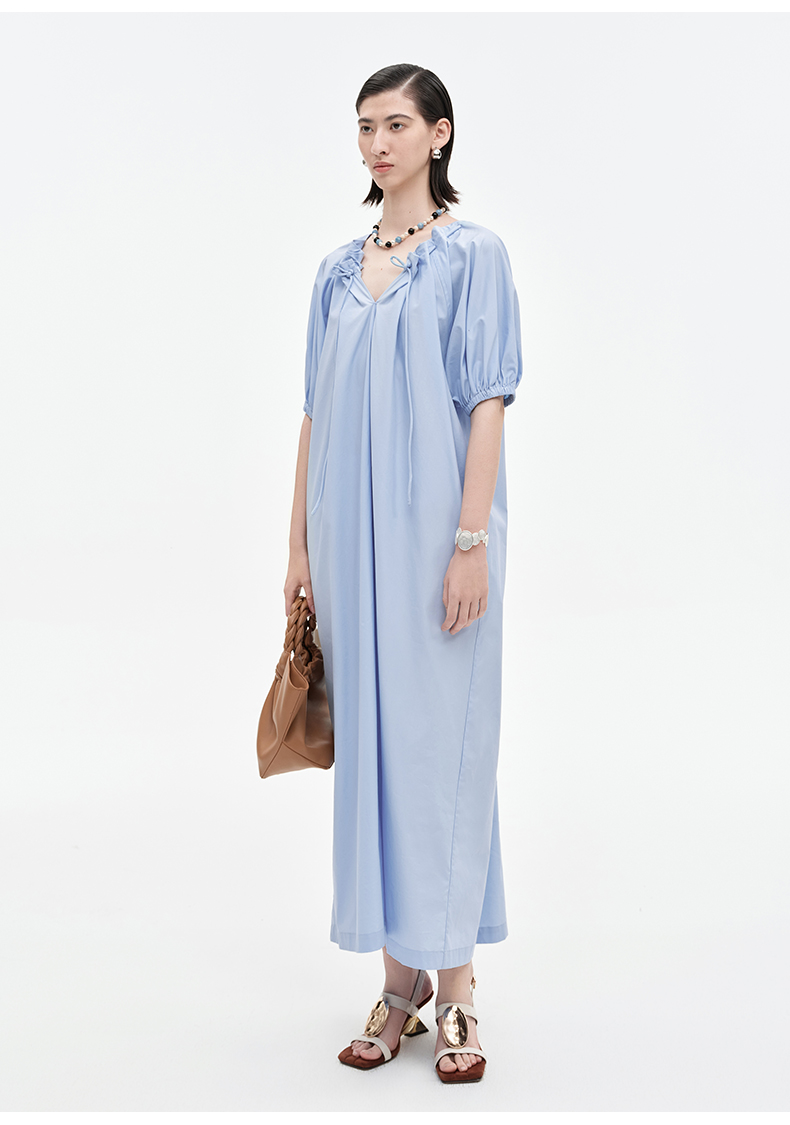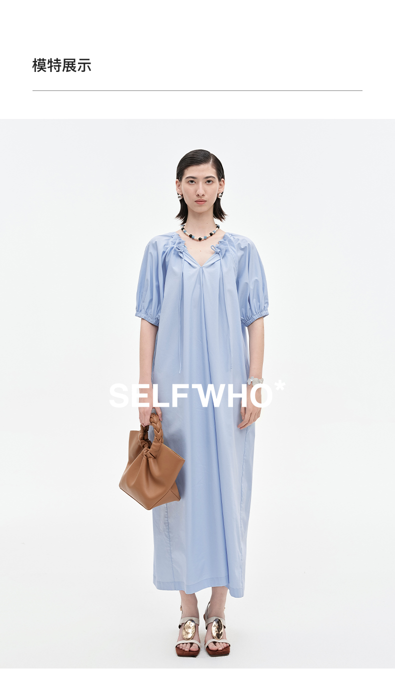 SELFWHO莱赛尔棉混纺泡泡袖连衣裙女2025夏新款淡人穿搭抽褶长裙