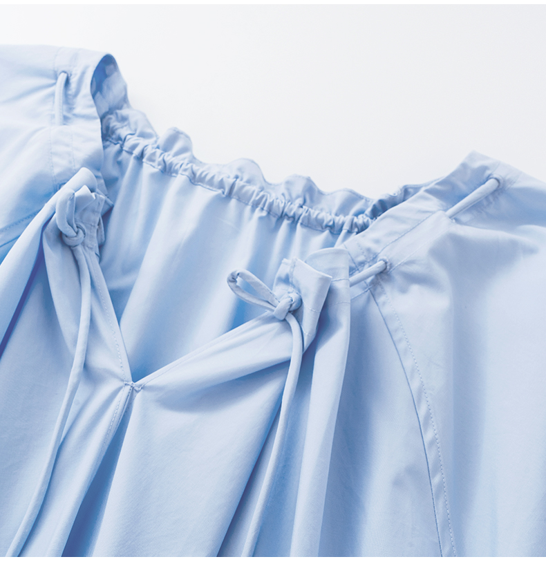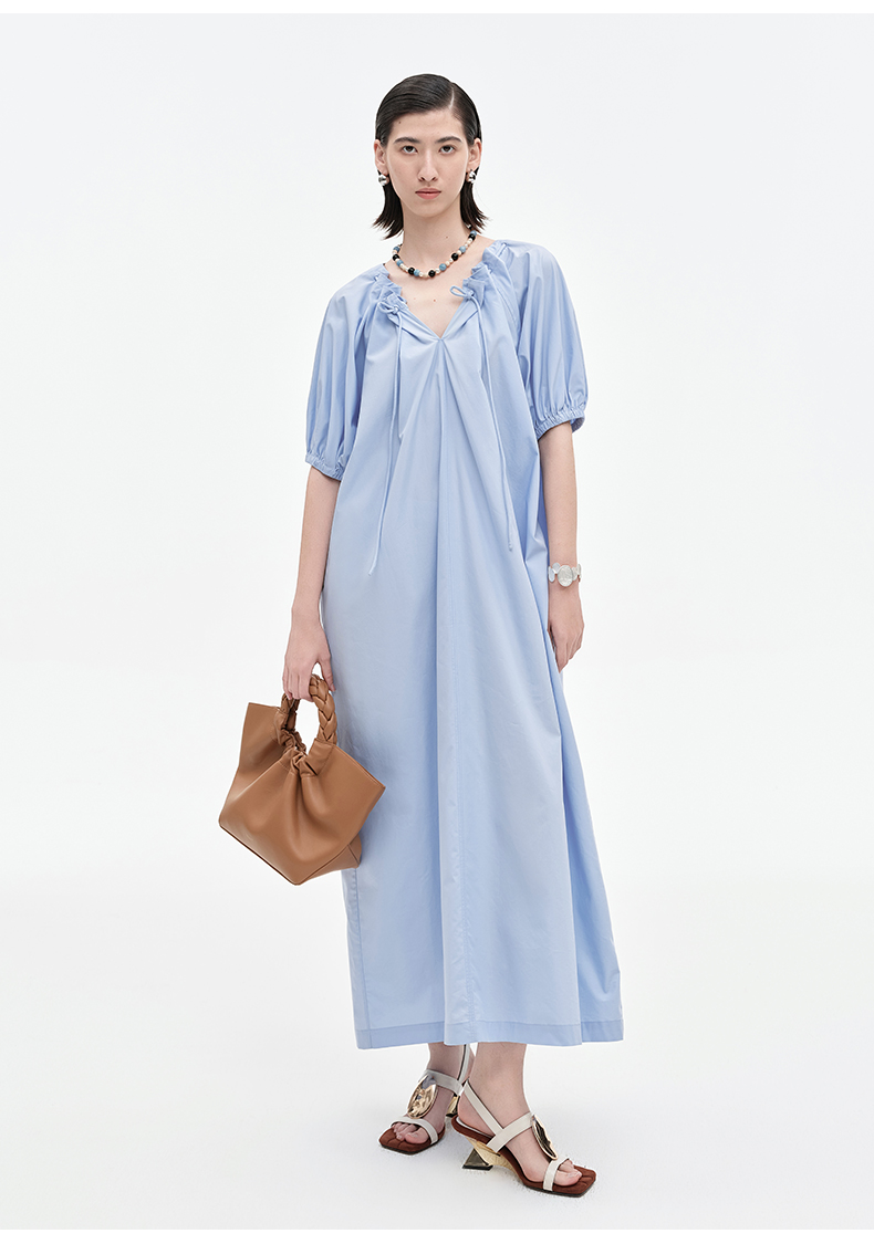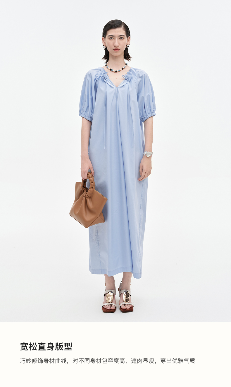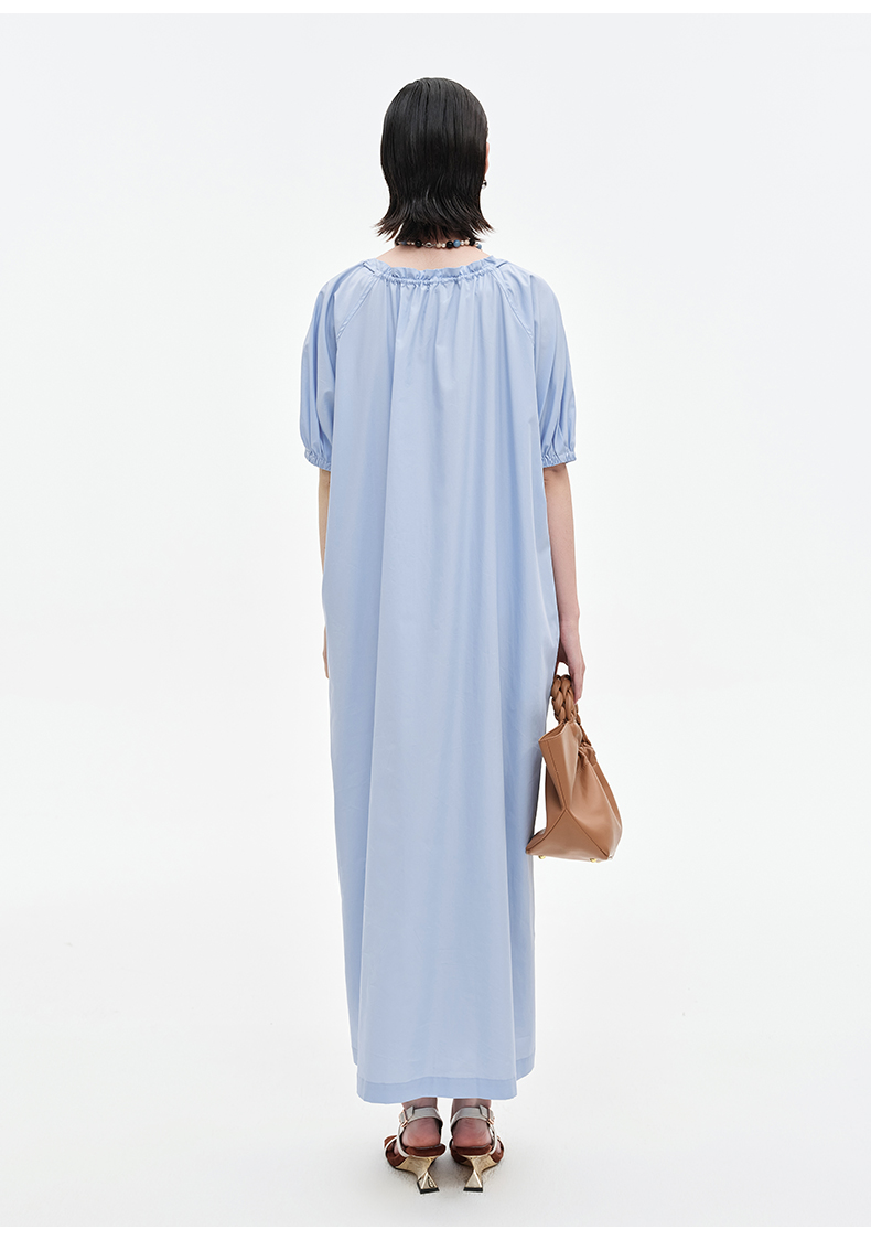 SELFWHO莱赛尔棉混纺泡泡袖连衣裙女2025夏新款淡人穿搭抽褶长裙