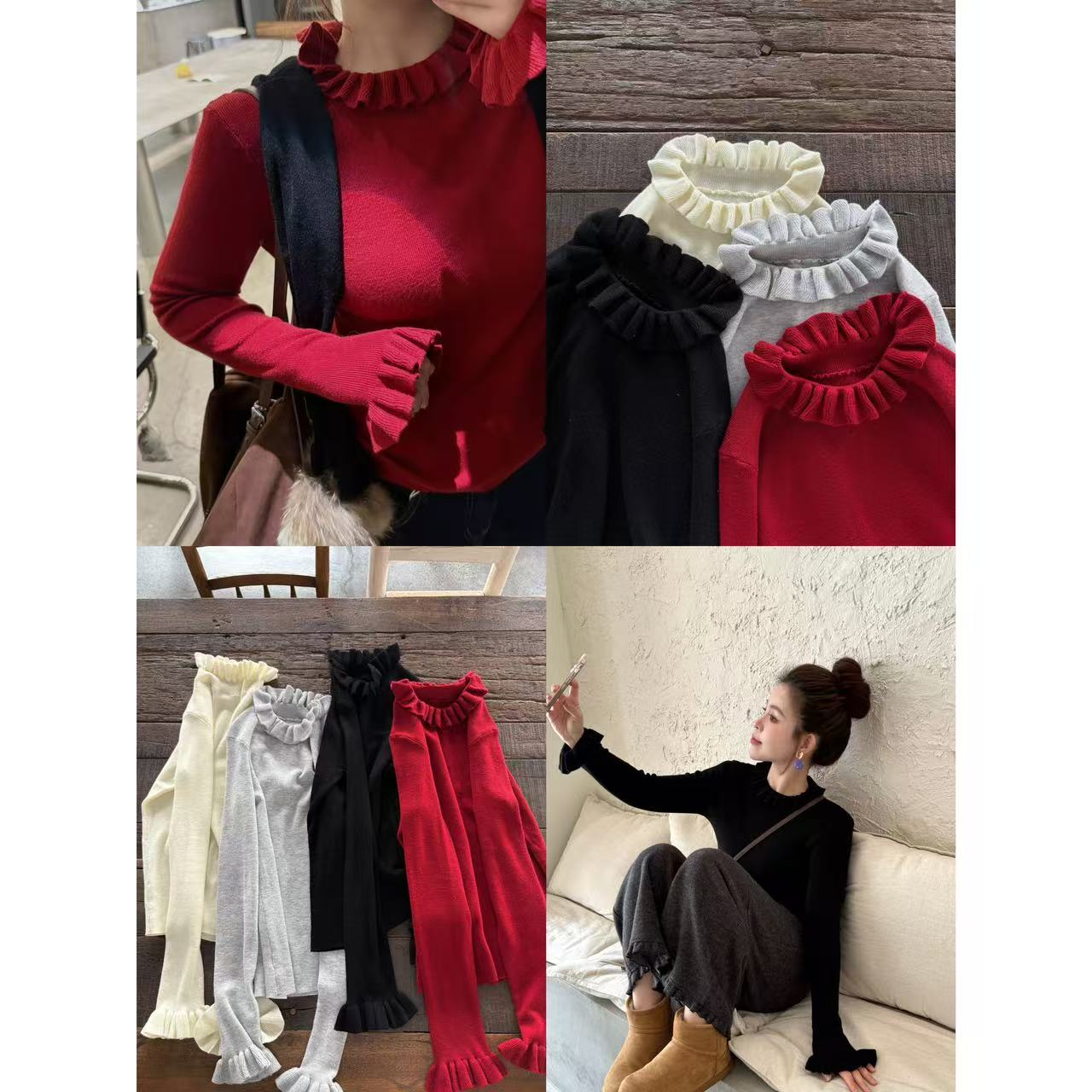 25AW上新 甜甜同款【花瓣轨迹】木耳双层荷叶边半高领针织上衣