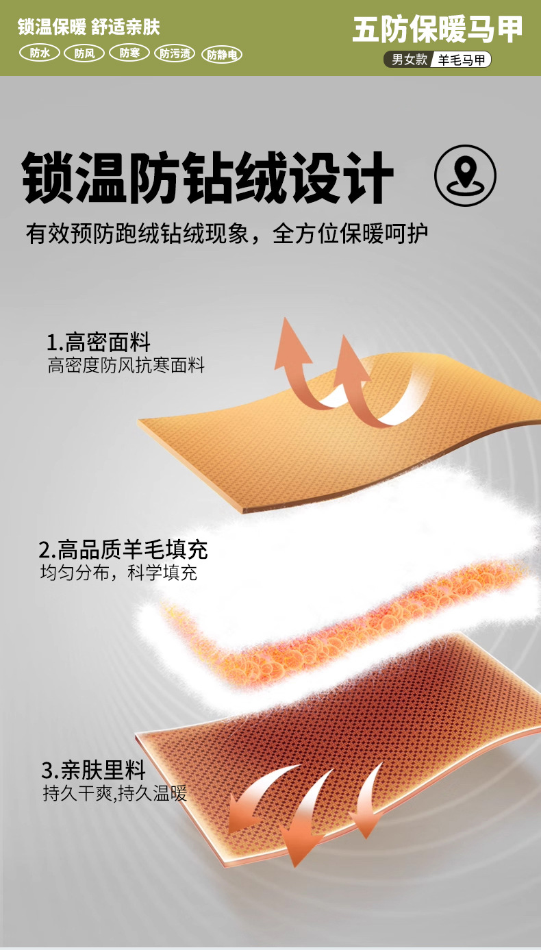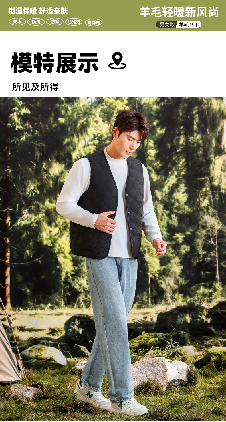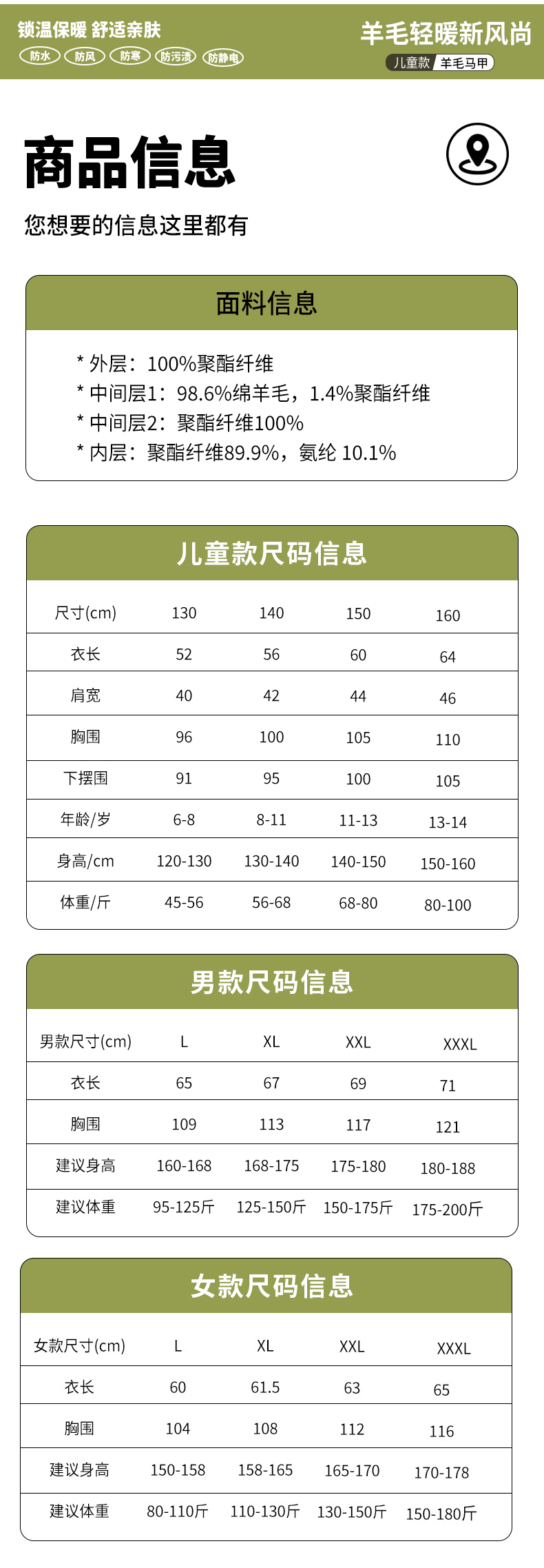 【停发】男女款羊毛马甲、7A级抑菌面料、防水防污抗静电处理工艺、男女款羊毛马甲、儿童保暖马甲
