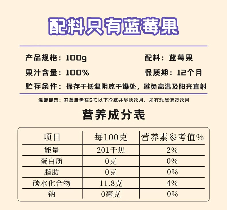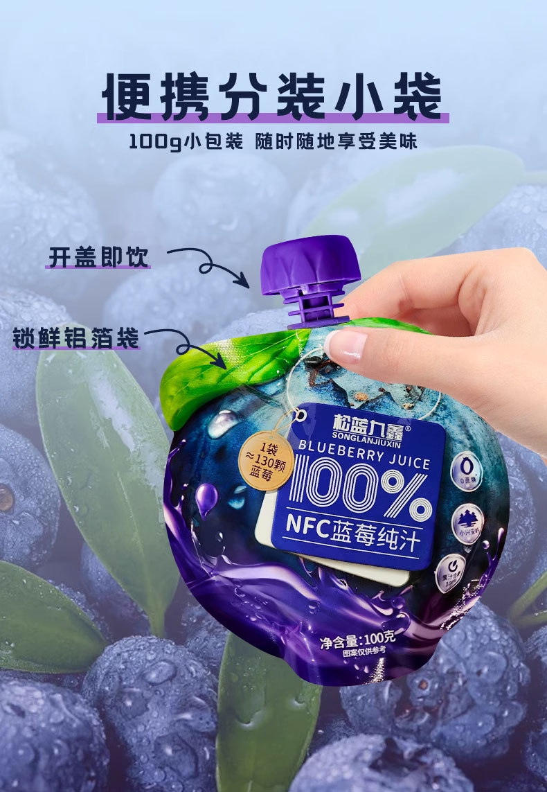 【品名】100%NFC蓝莓纯汁 【规格】100g/袋 【配料】蓝莓果 【蓝莓含量】 100% 【保质期】12个月 【贮藏条件】保存于低温阴凉干燥处,避免高温及阳光直射 温馨提示:开盖后需在5℃以下冷藏并尽快饮用,如有涨袋请勿饮用 【发货地】黑龙江伊春 【发货快递】韵达/邮政(以实际物流为准) 【发货时效】48-72小时,周末节假日顺延 【不发货区域】青海,海南,宁夏,新疆,西藏,港澳台 |