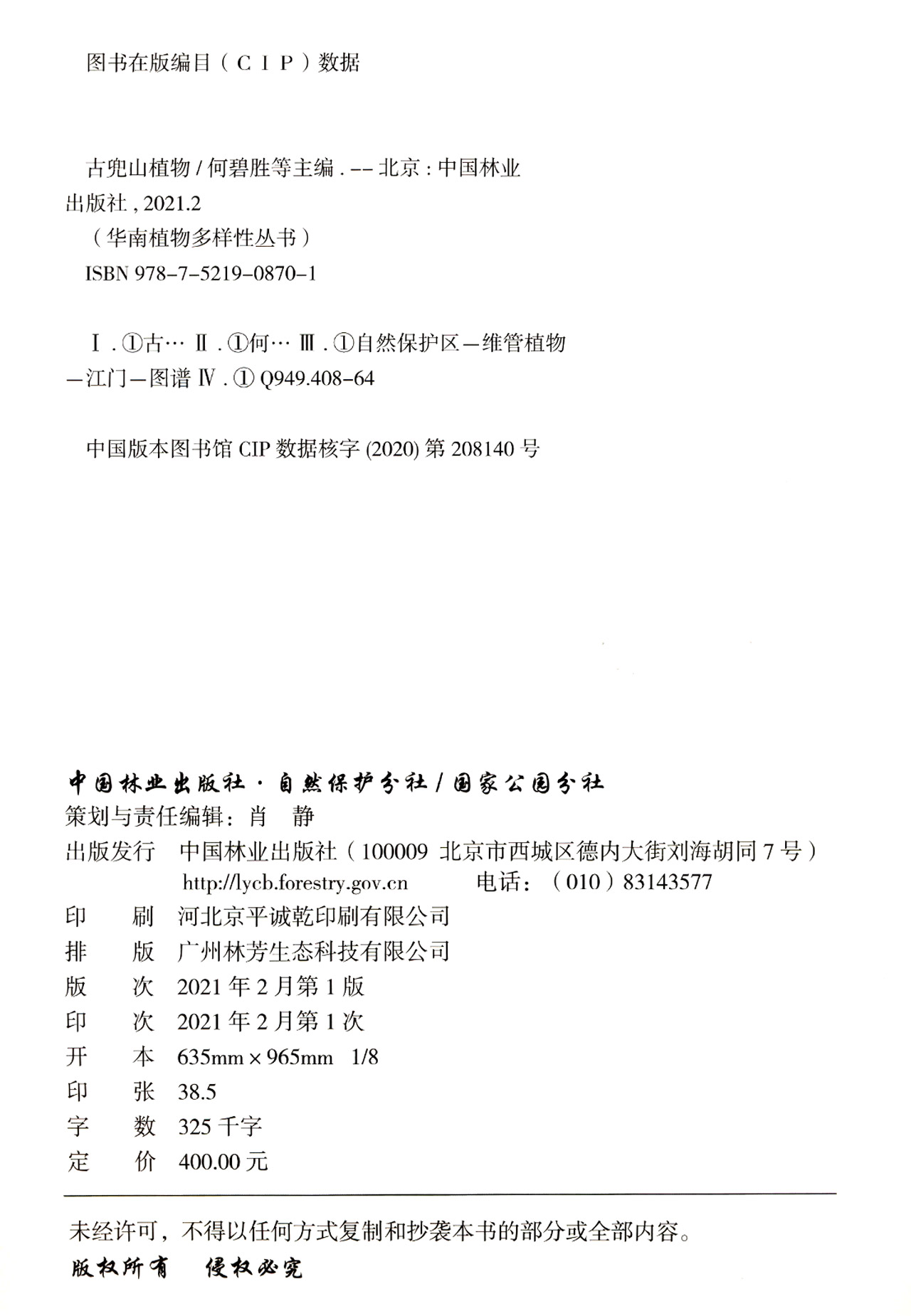 本书图文并茂介绍了广东江门古兜山自然保护区维管束植物185科659属1328种,其中野生维管束植物163科621属1199种、栽培植物57科86属129种。本书除对植物科、属、种特征进行精简的文字描述外,还为大部分物种配有精美图片,并加之以生境及分布描述,同时书后附有中文名及拉丁名索引,以便于读者查询。