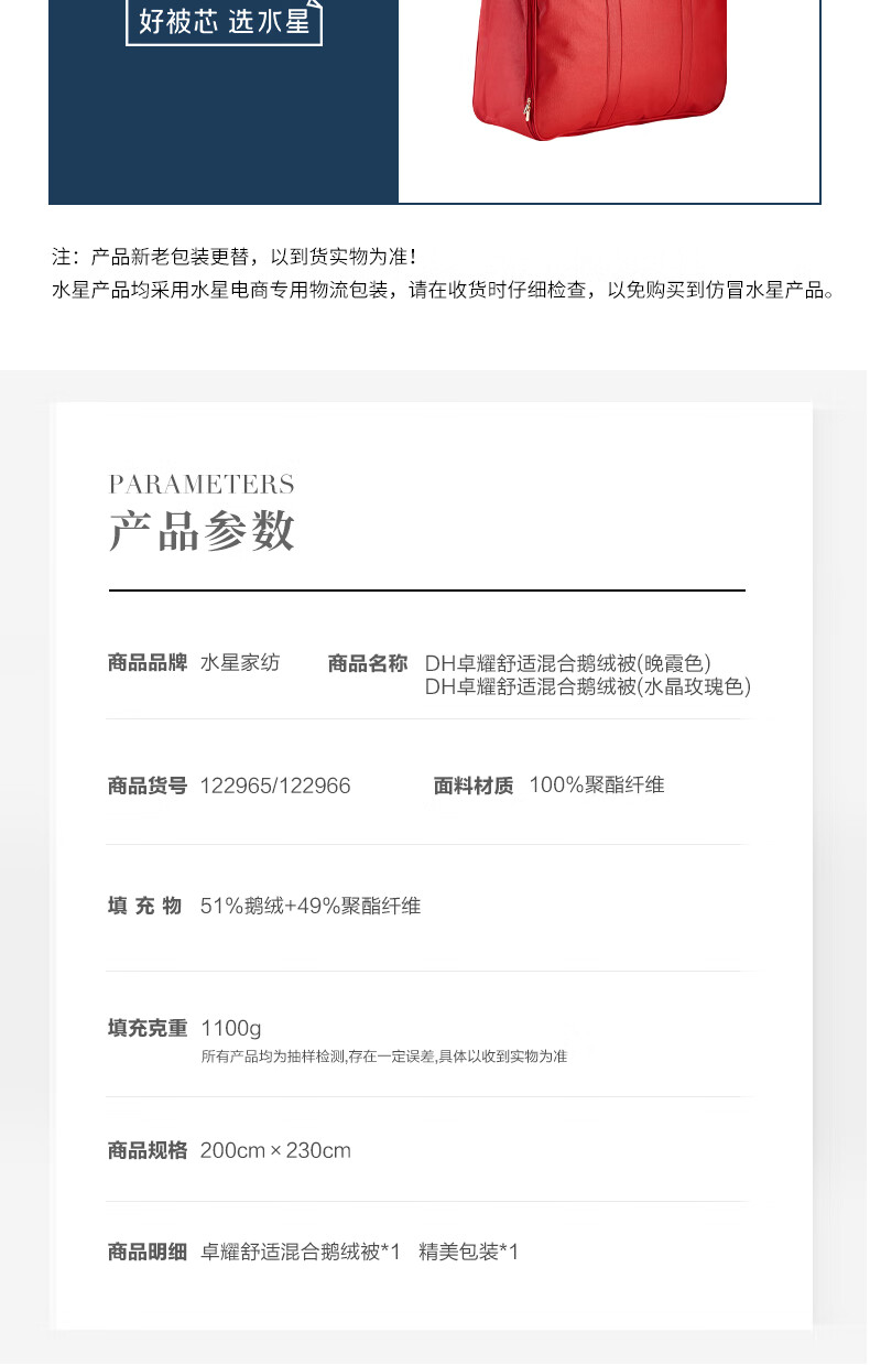 水星家纺 DH卓耀舒适混合鹅绒被(水晶玫瑰色)122966