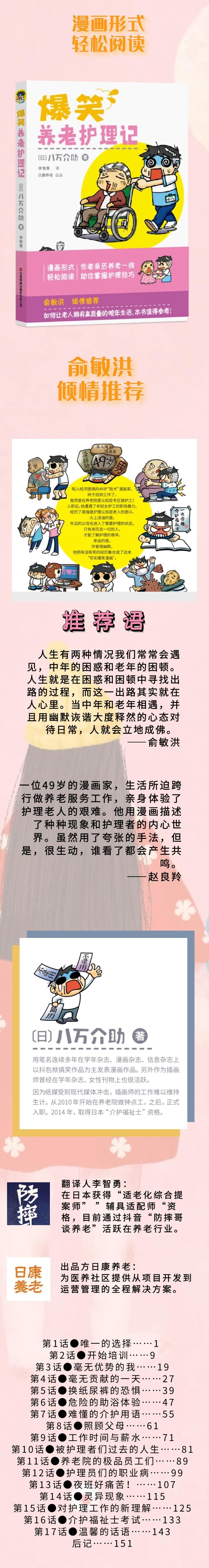 这本漫画,用幽默诙谐的方式,寓教于乐,通过介护所内医生、护士、康复治疗师、介护师等形象鲜明的人物对话,生动地描绘了老年人日常生活中经常遇到的困难以及介护团队是如何处理的,用轻松的漫画形式传递着关于护理的知识。