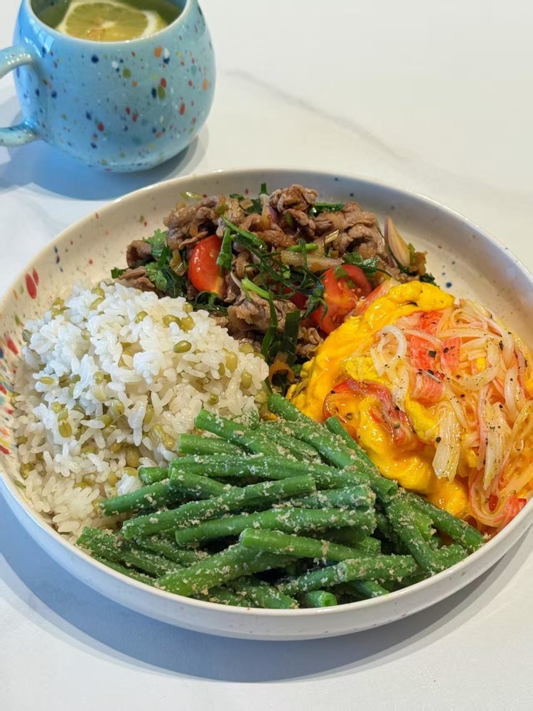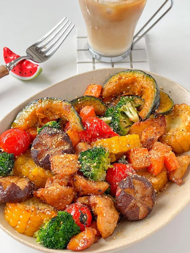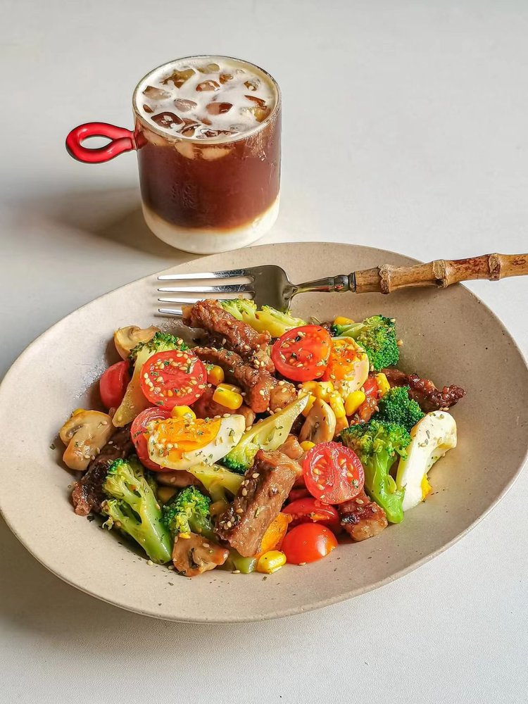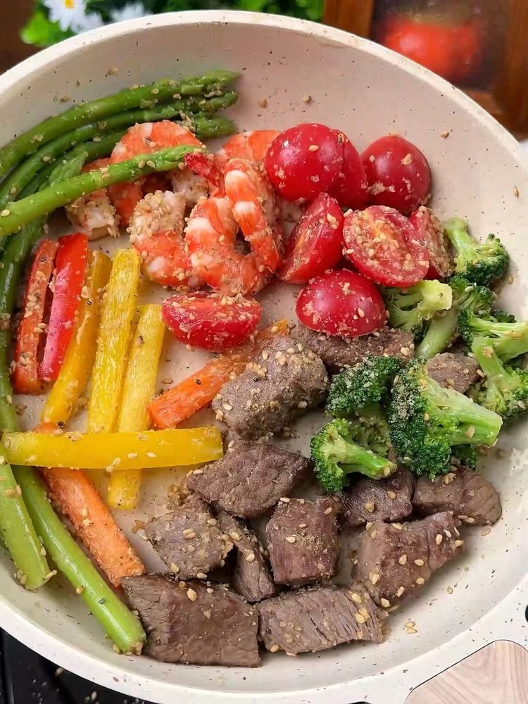 芝麻牛排能量碗🥩牛排煎至七分熟,切小块,搭配烤蔬菜、糙米饭,淋点黑胡椒酱,最后撒上撒料,牛排的香混着芝麻的香,比西餐厅的还好吃!