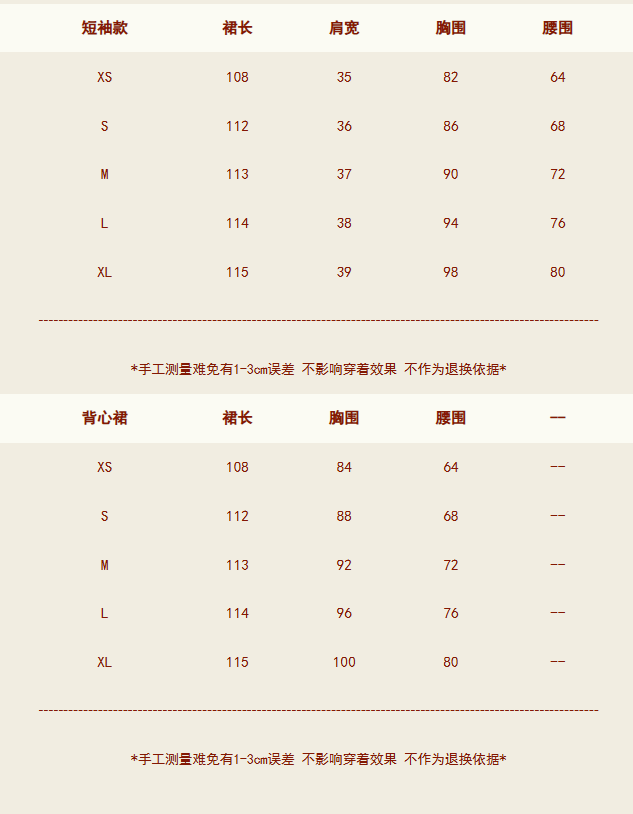 *手工测量难免有1-3cm误差 不影响穿着效果 不作为退换依据* | ||||||