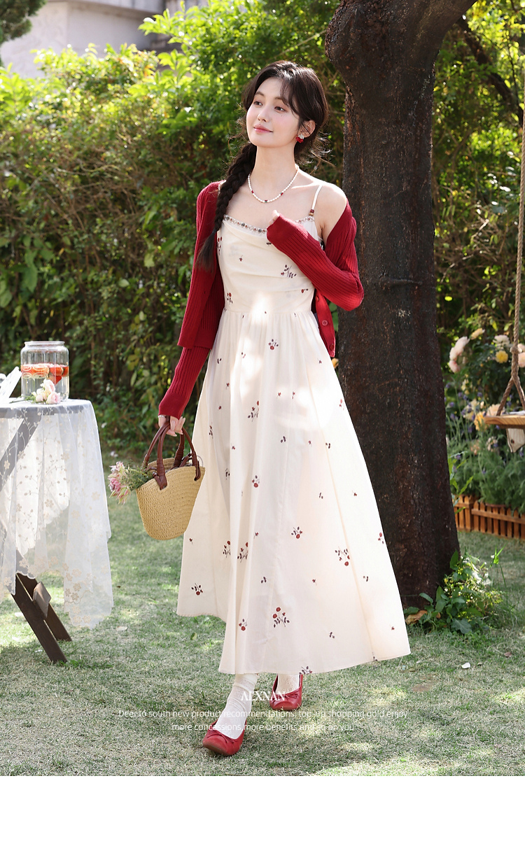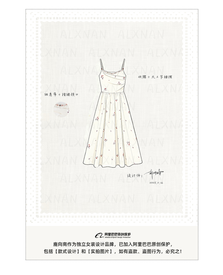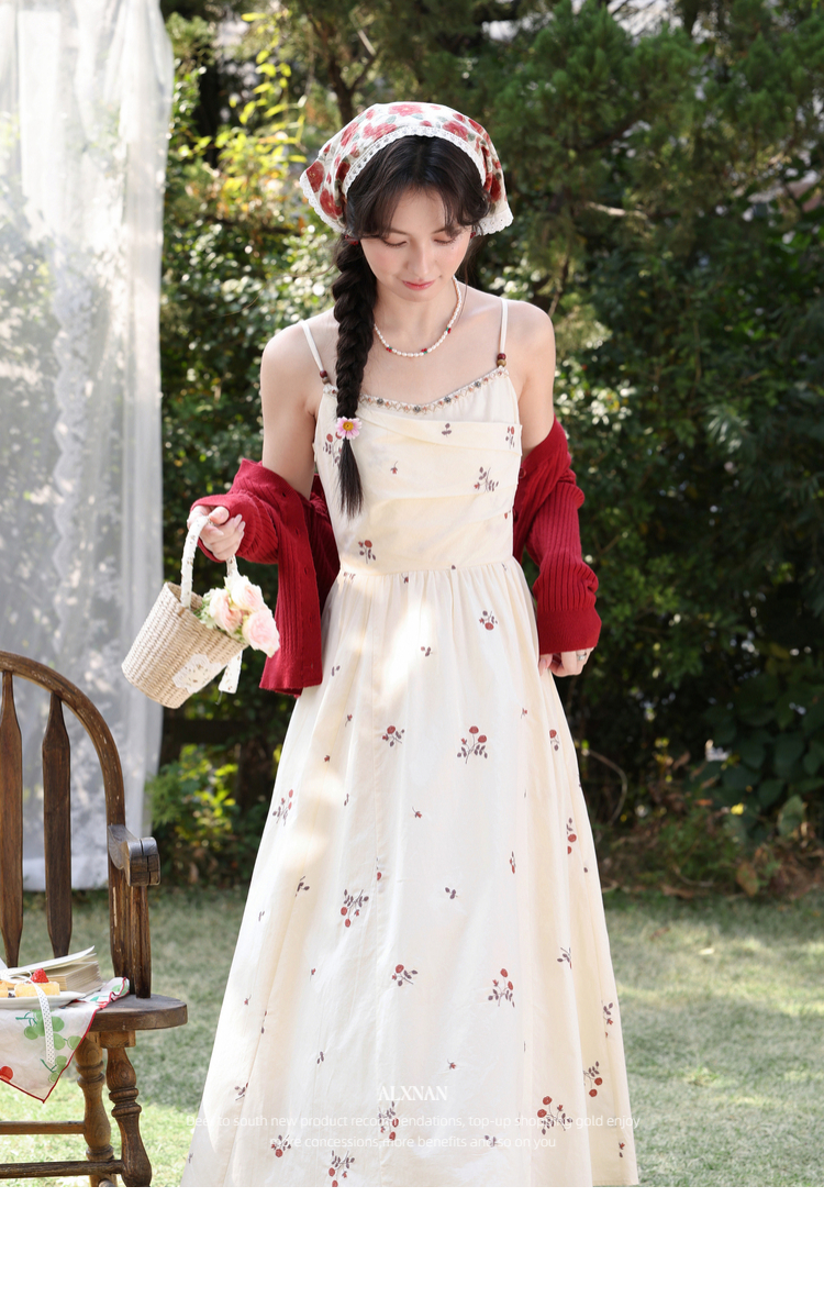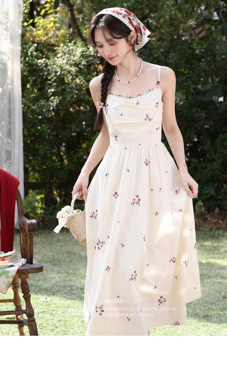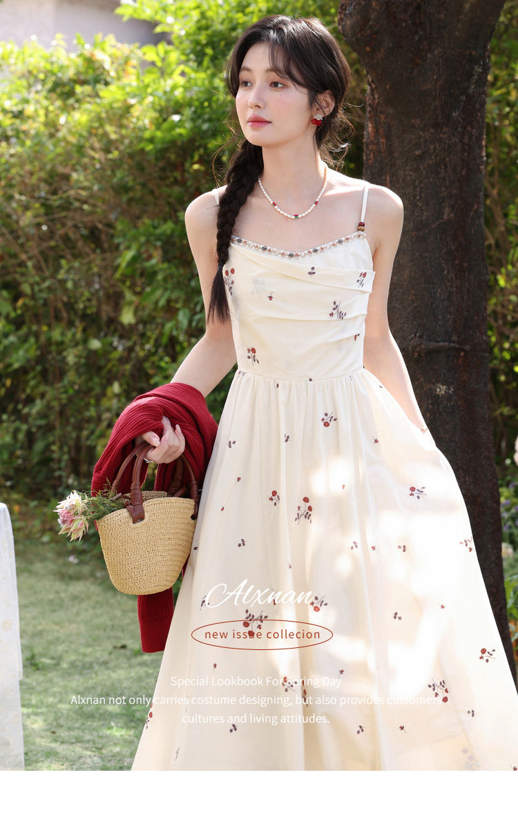 鹿向南「清新花语」杏色法式气质刺绣碎花连衣裙女春夏收腰吊带裙