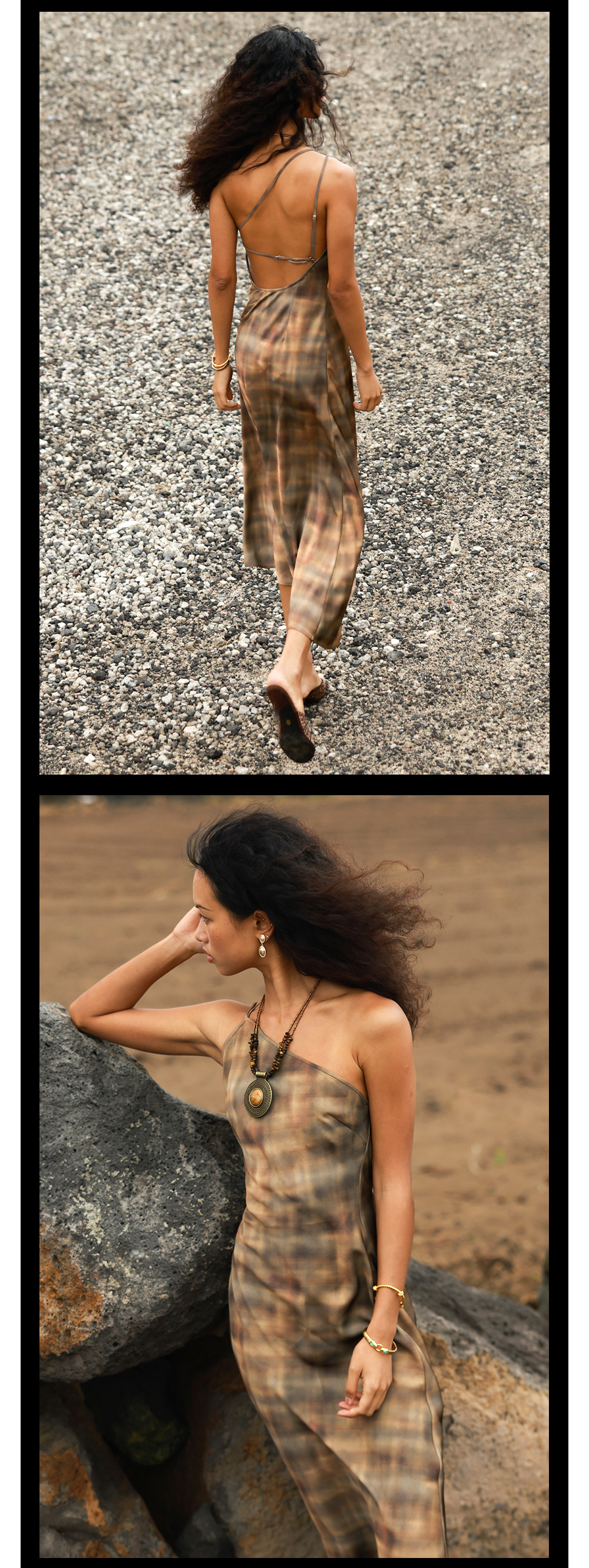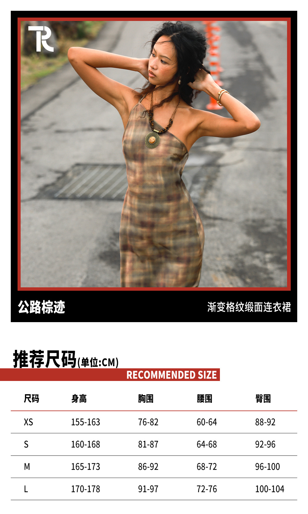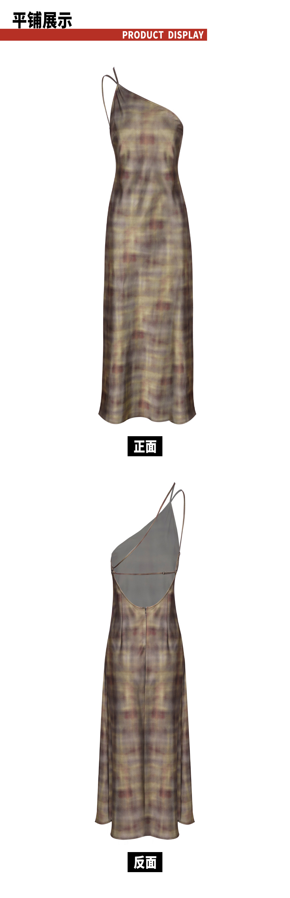 TR她热 公路棕迹 棕色缎面渐变格纹不规则单肩露背复古吊带连衣裙