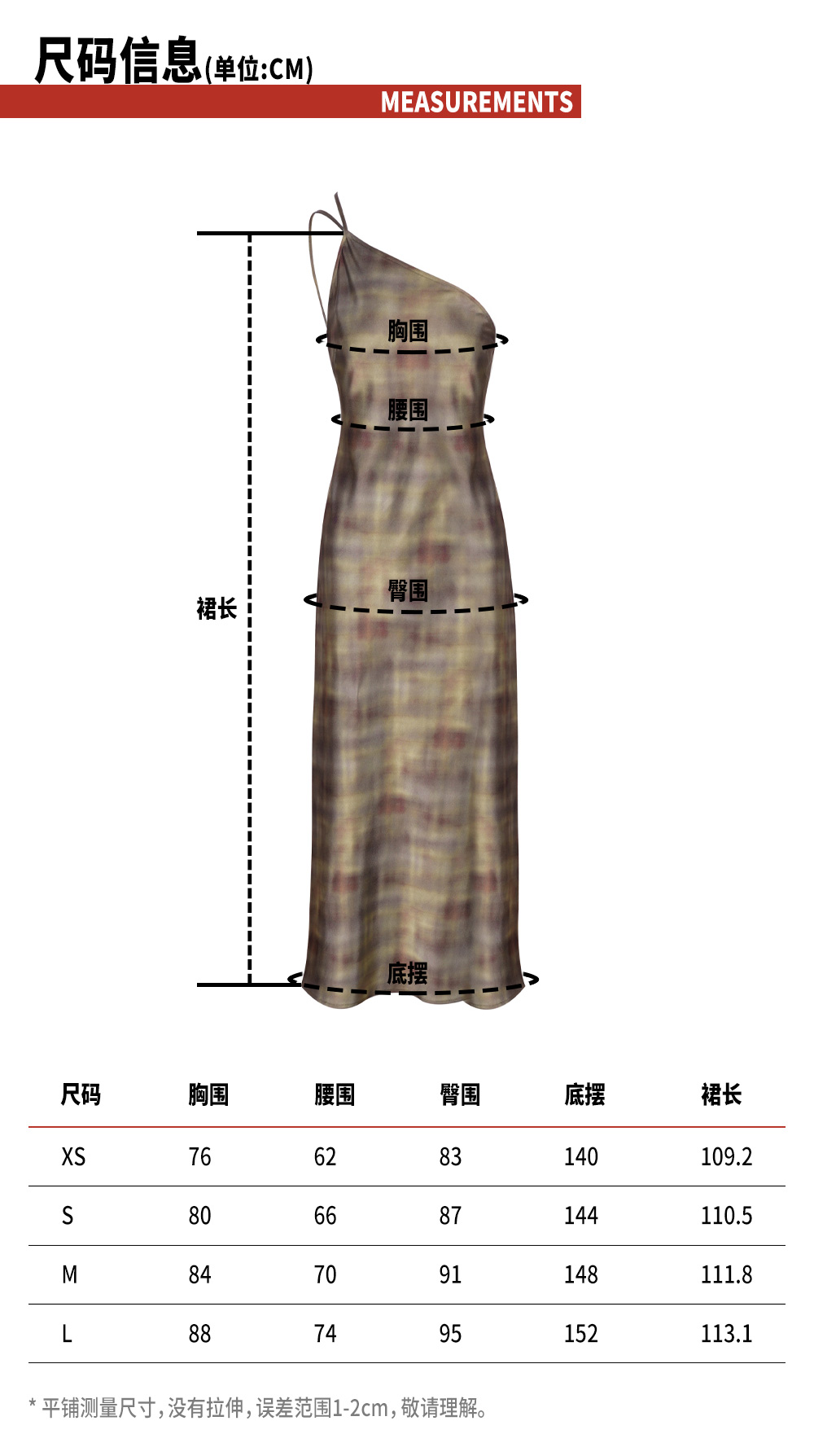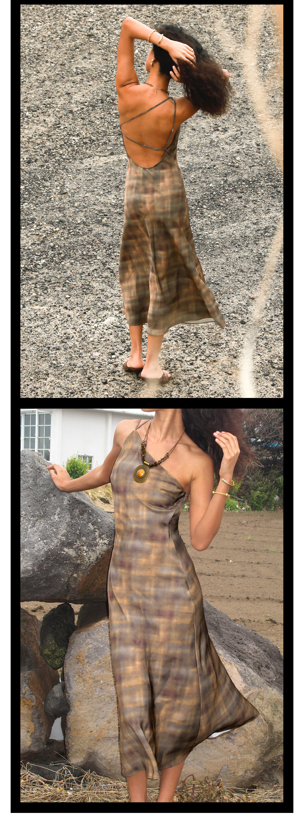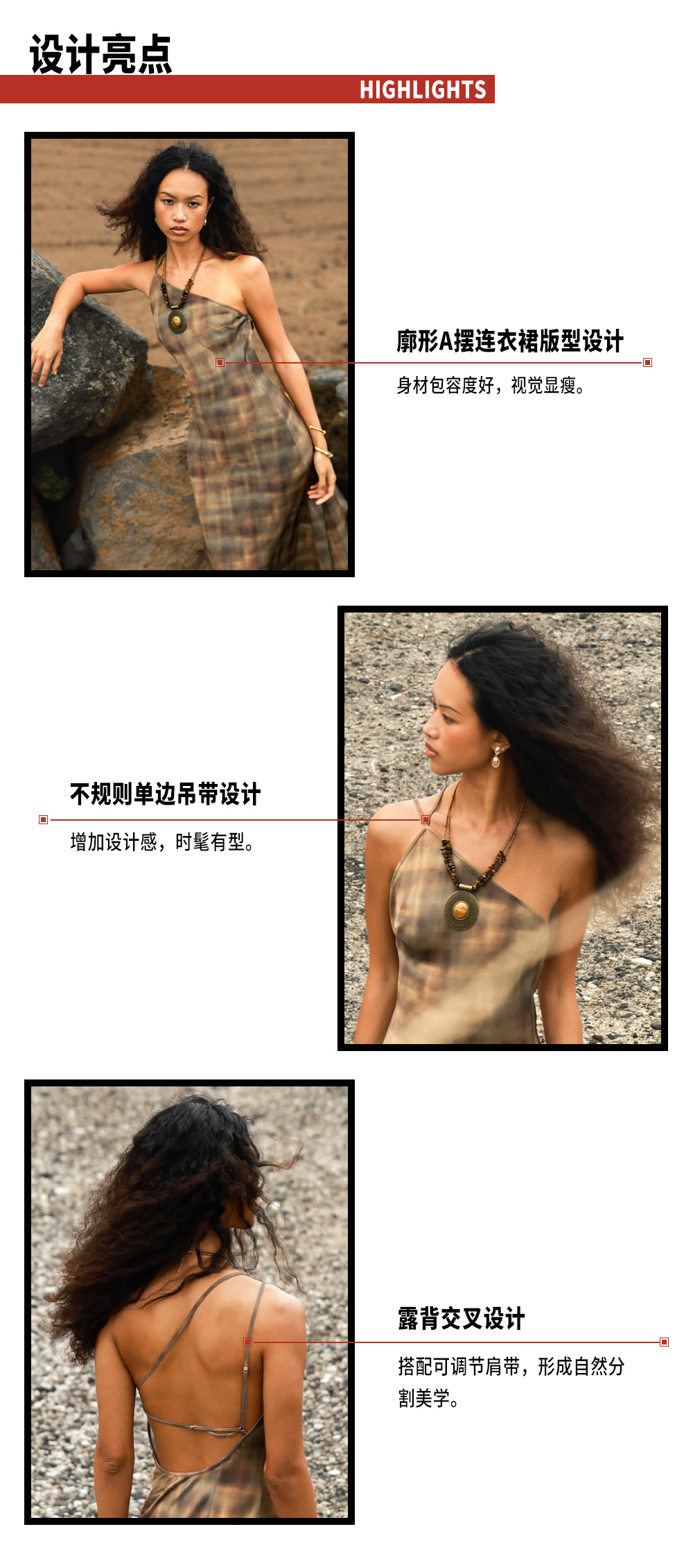 TR她热 公路棕迹 棕色缎面渐变格纹不规则单肩露背复古吊带连衣裙