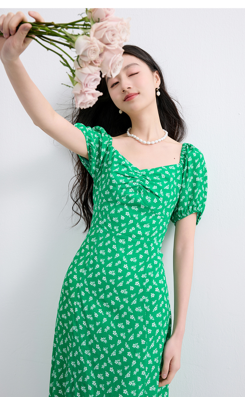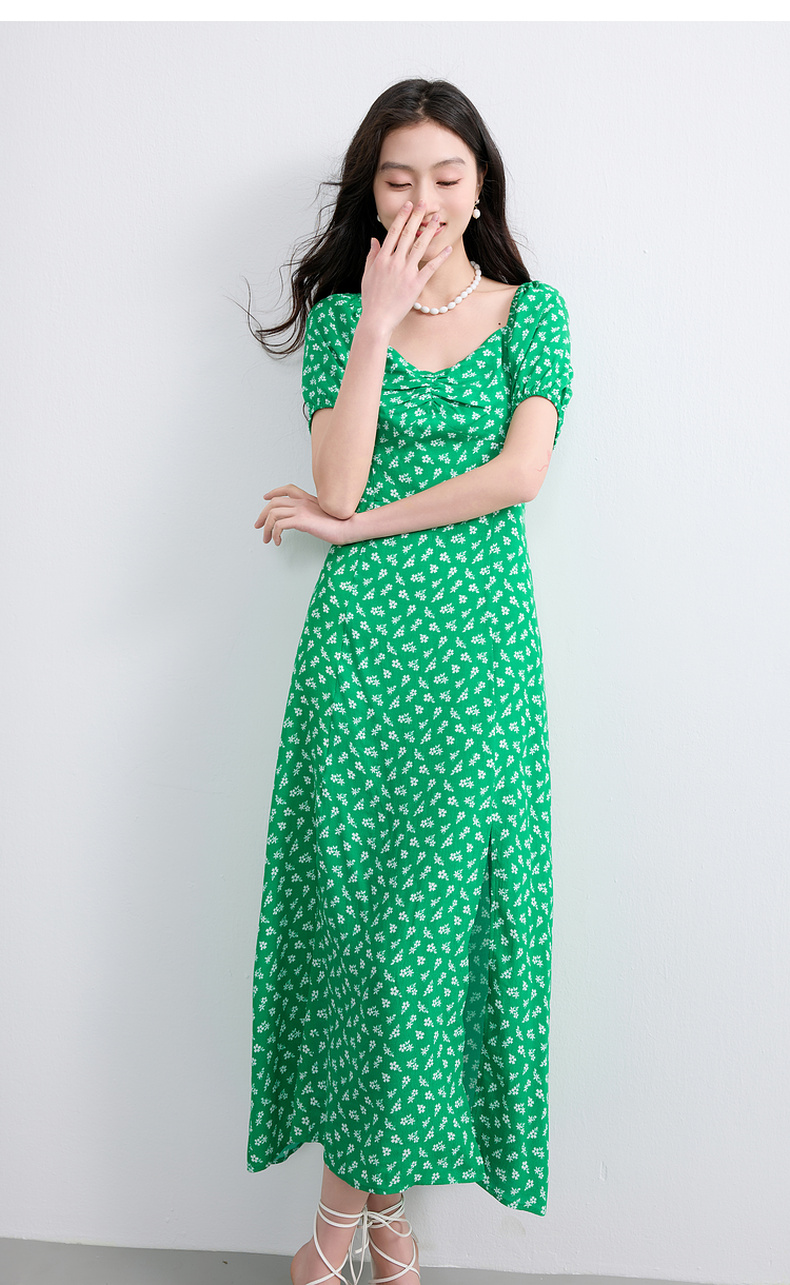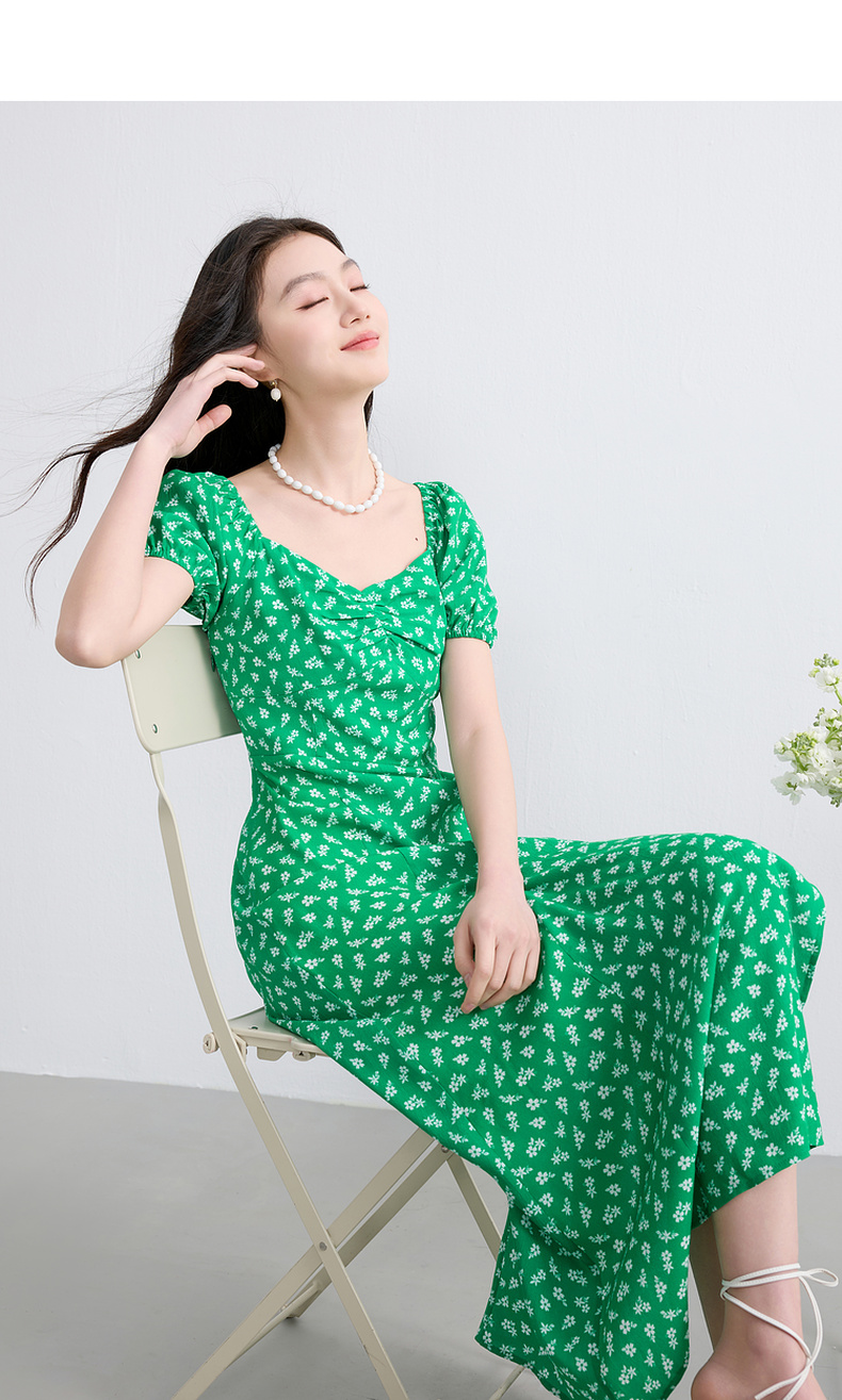三彩2025夏季新款法式碎花裙收腰A字裙泡泡袖连衣裙浪漫长裙S