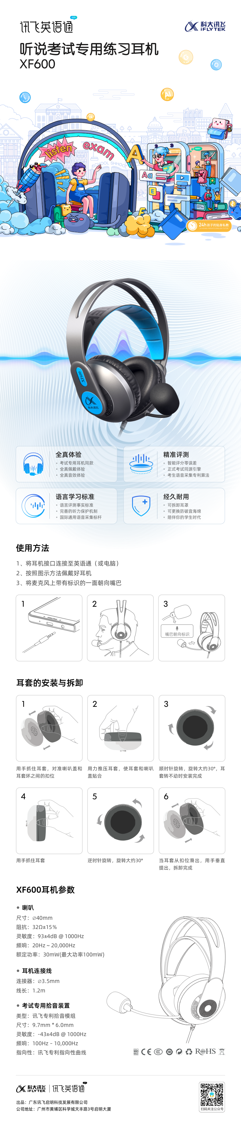 英语听说考试专用练习耳机XF600 适配英语通T1 Y1/硬件版E1 E1专用耳机