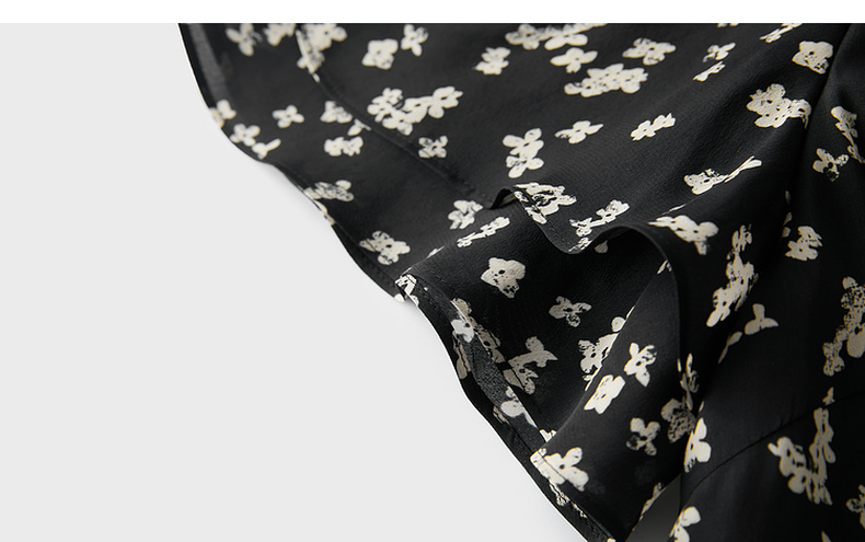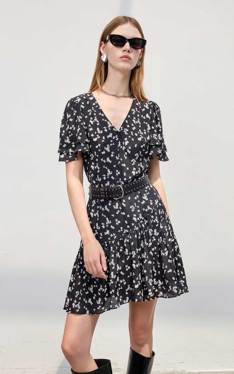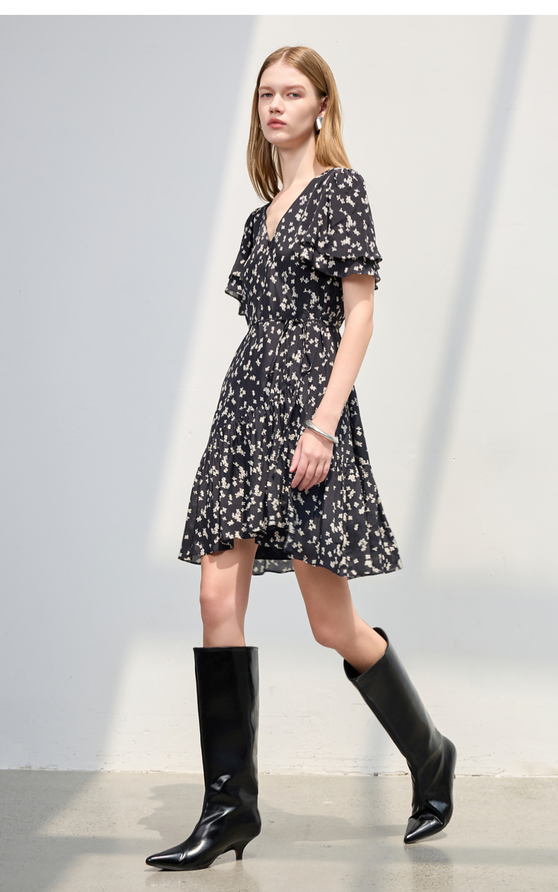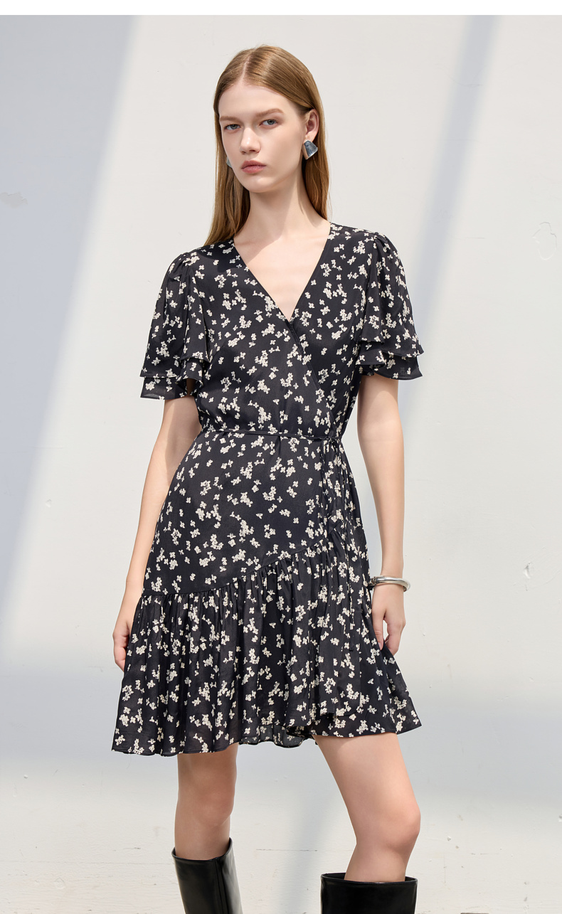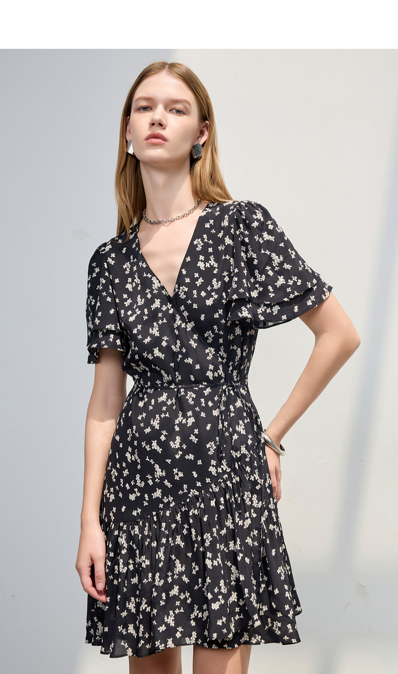 三彩2025夏季新款碎花连衣裙法式V领收腰A字裙荷叶边短裙浪漫S