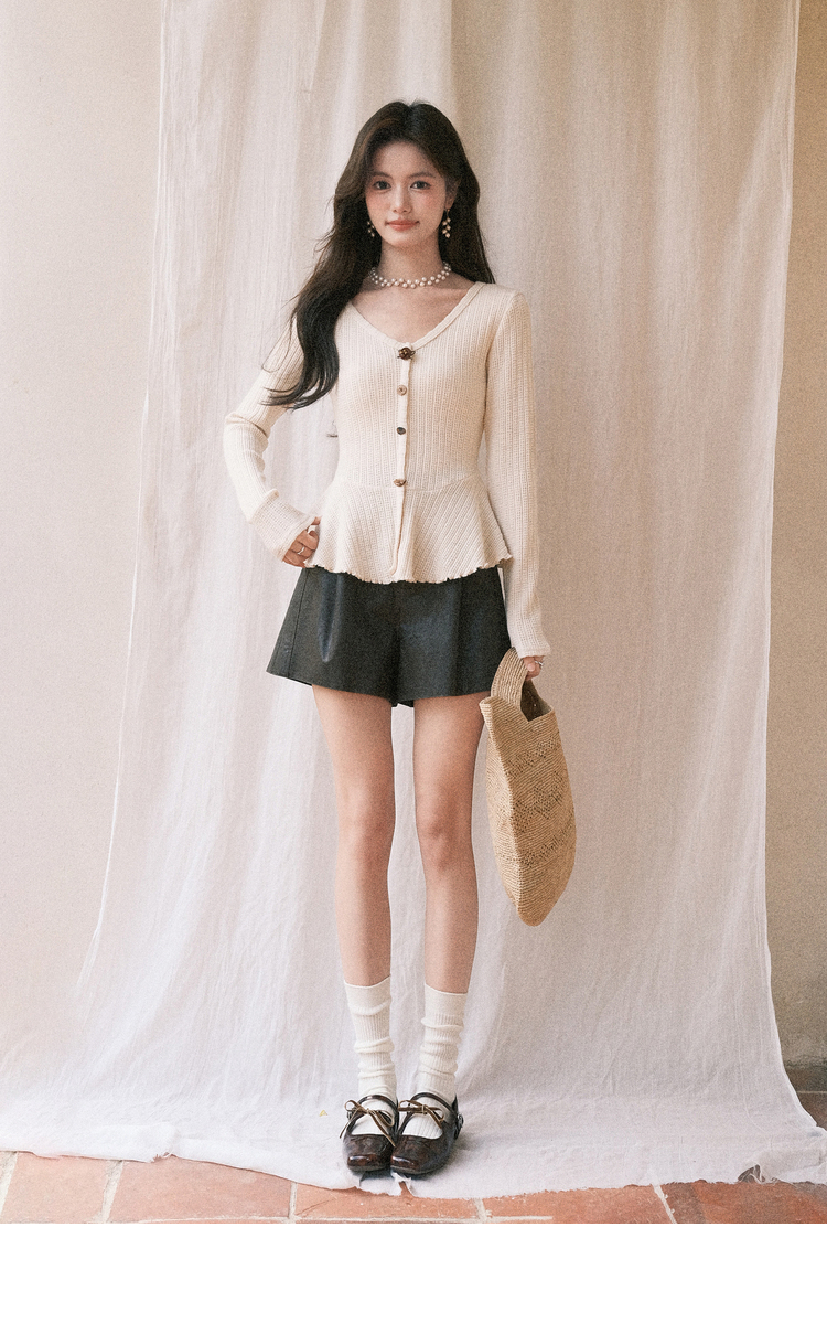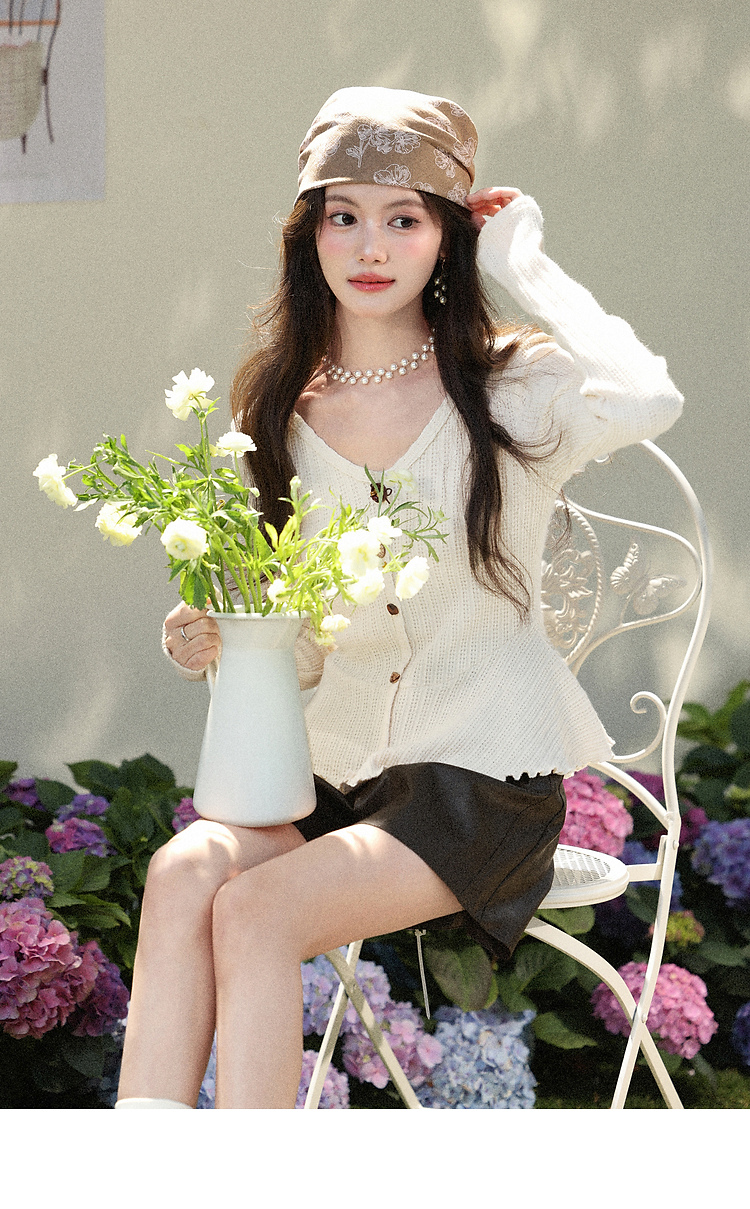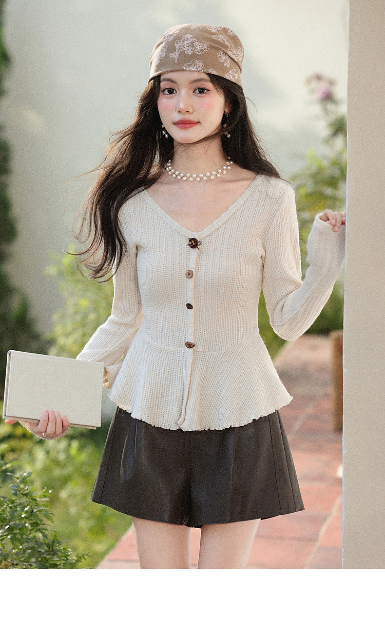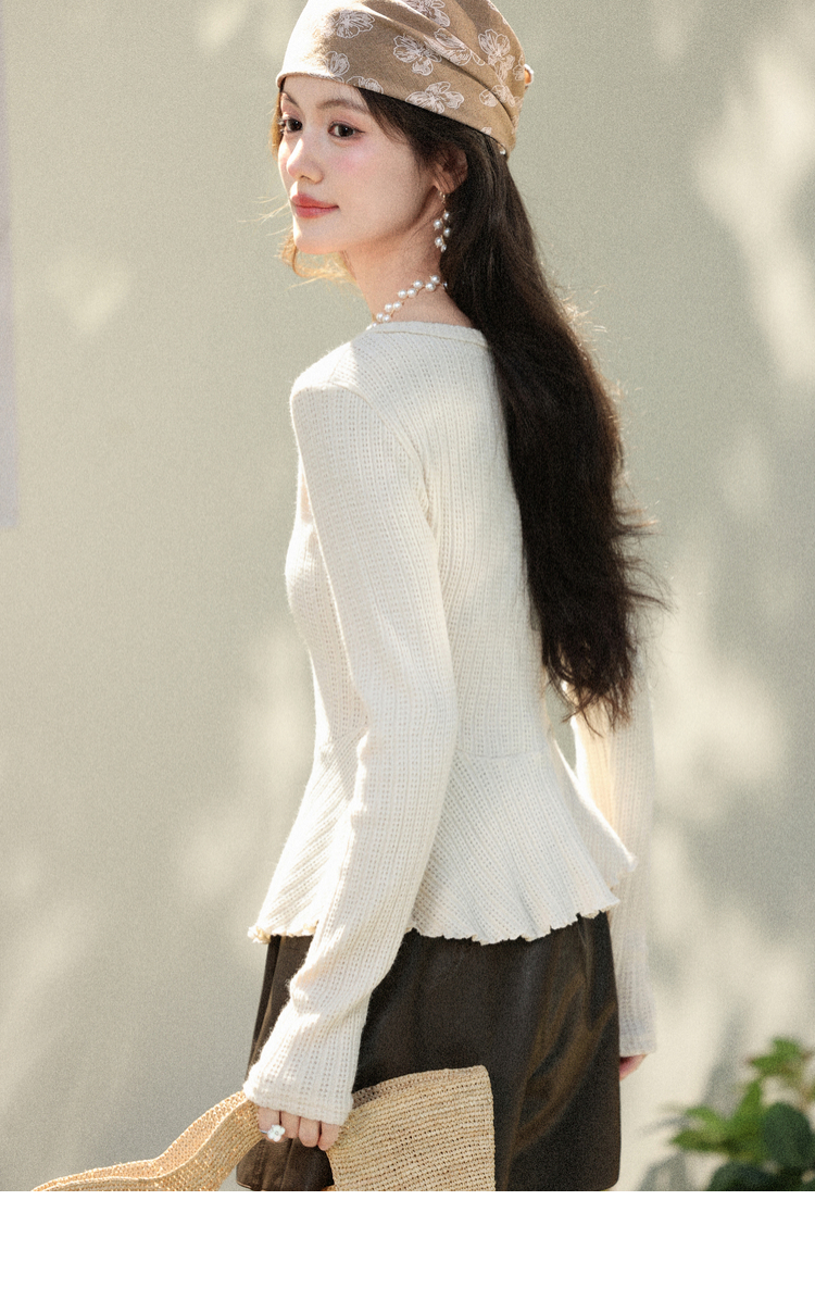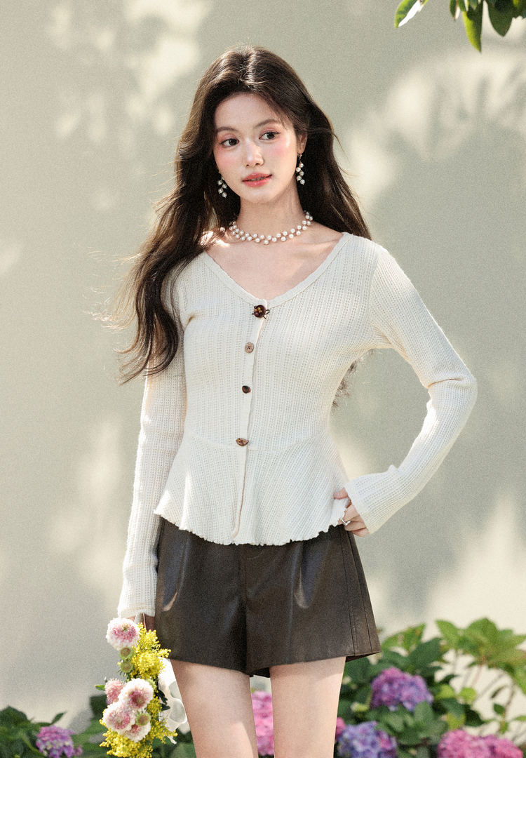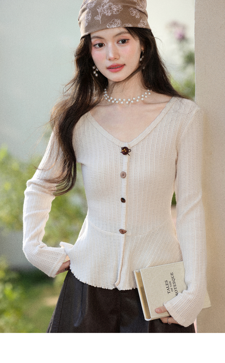 鹿向南「绒絮衬光」不规则花边燕麦色V领长袖T恤女春季显瘦上衣