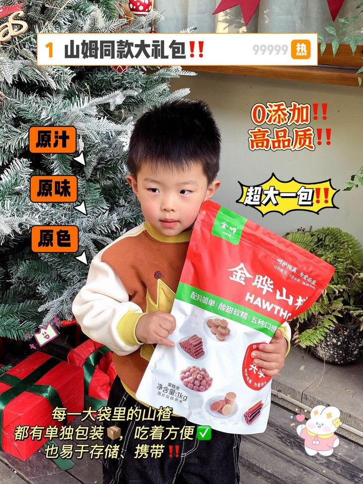 五种产品 酸甜搭配,不重样,好吃停不下来!喜庆的包装,充满中国传统年味的感觉,大一包,山楂美味大合集,团圆大分享,美味满满,福气满满。无论是平日里的朋友小聚,或者节日送礼,都是一份相爱相聚的心意山楂富含维生素C、碳水化合物、多种矿物质、胡萝卜素等