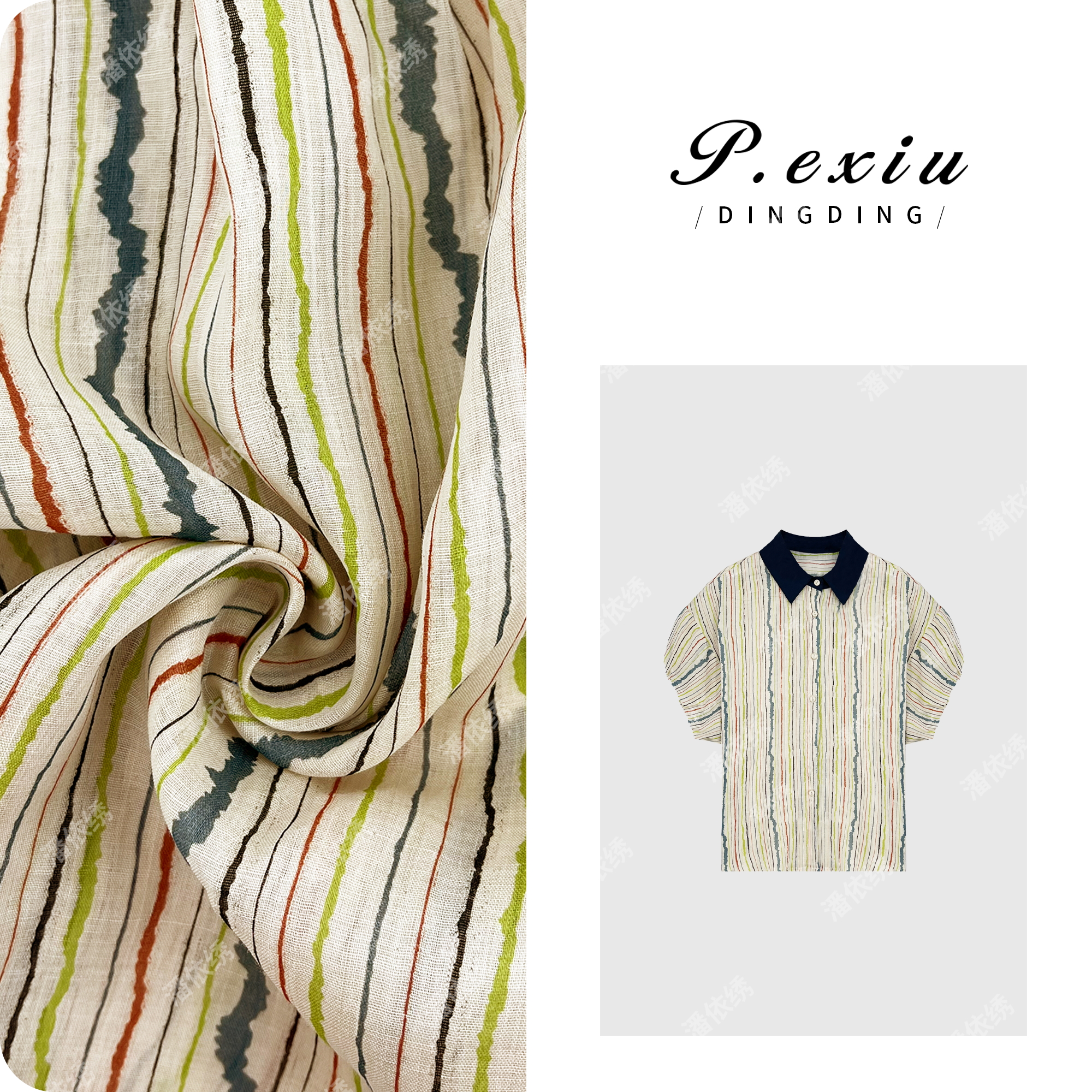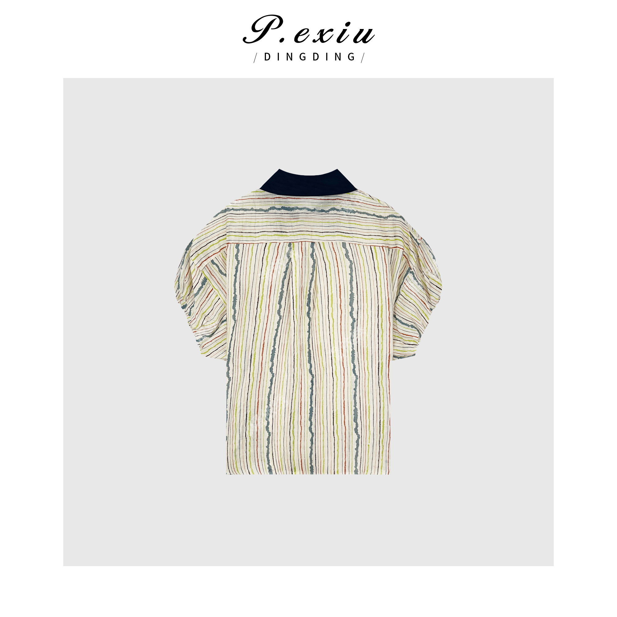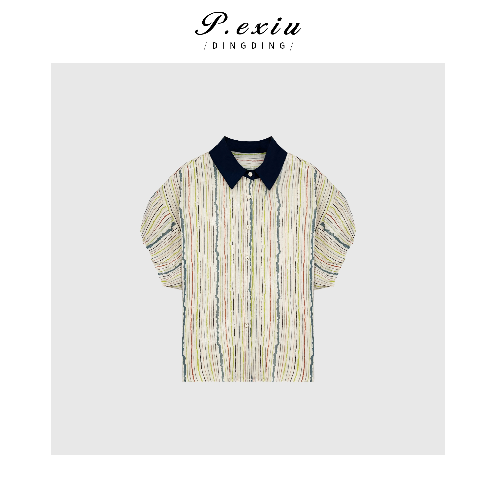 04-1潘依绣丁丁宠粉PanYiXiu/潘依绣100%苎麻小飞袖竖条纹拼接领短袖衬衫 W-62140