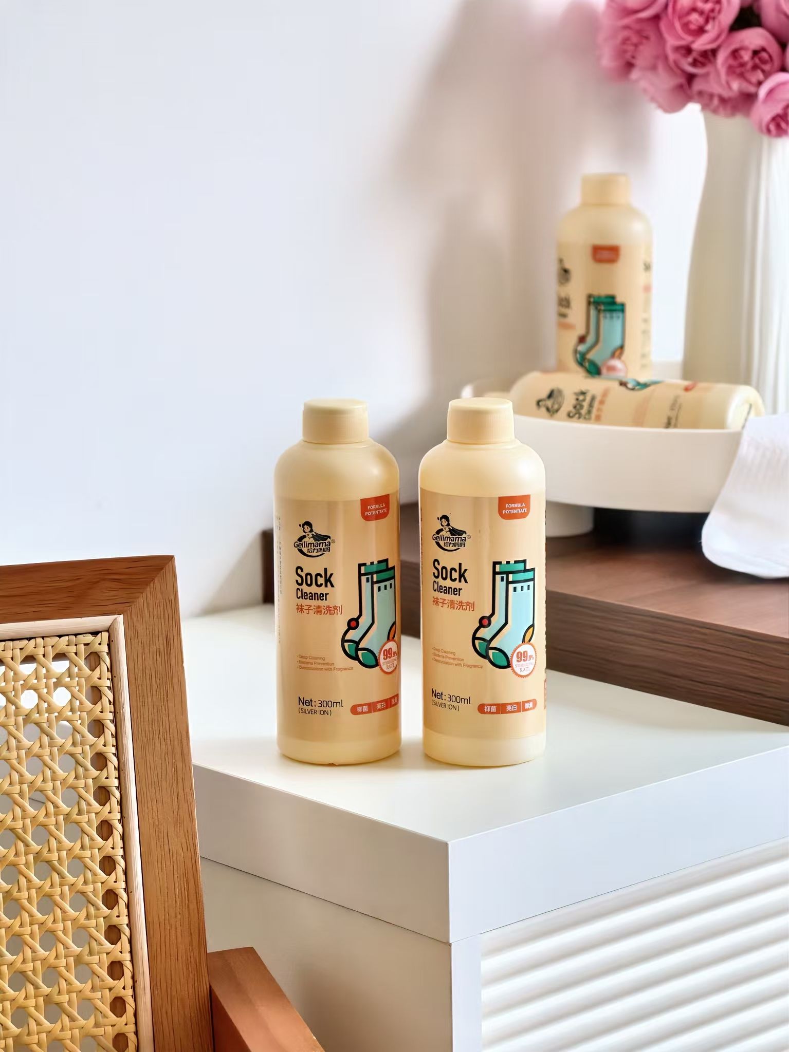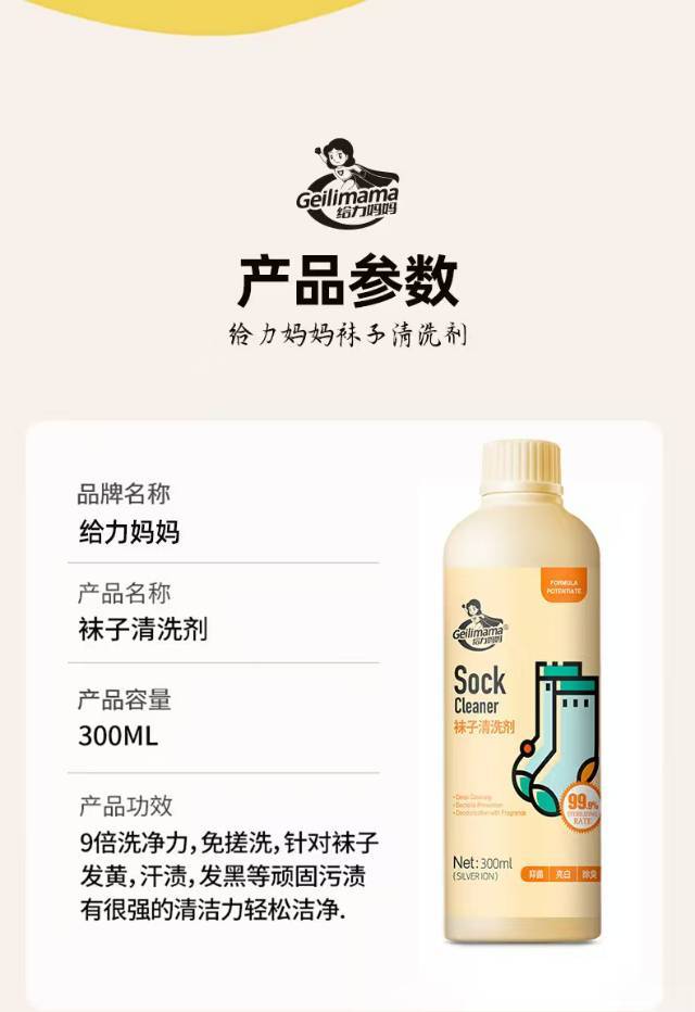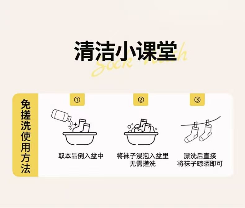 🔥给力妈妈袜子清洗剂专用使用方法: step1:取本品倒入盆中 step2:将袜子浸泡入盆里无需搓洗 step3:漂洗后拧干水分,晾干即可