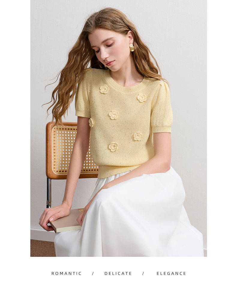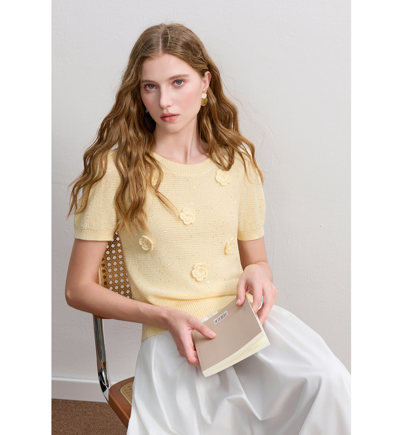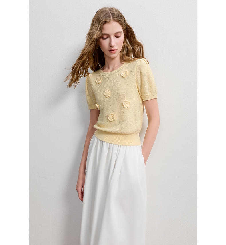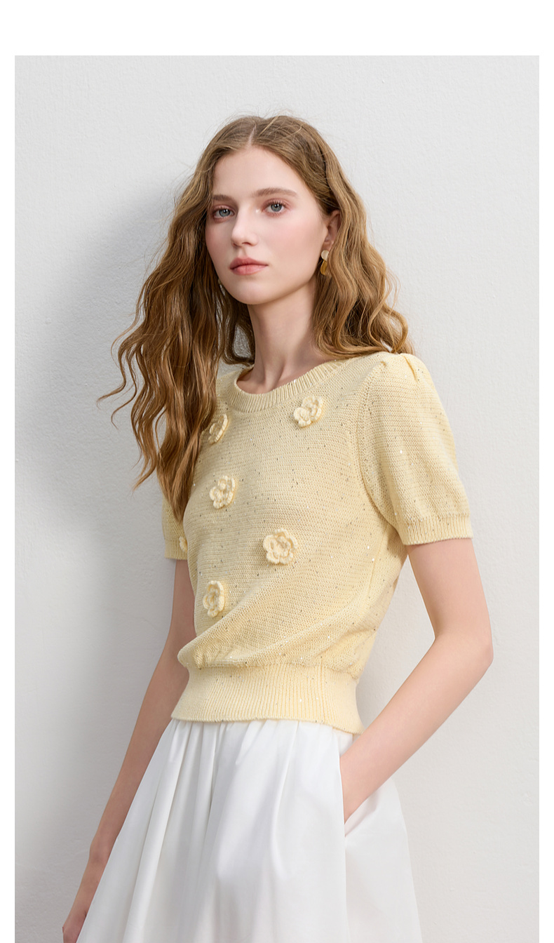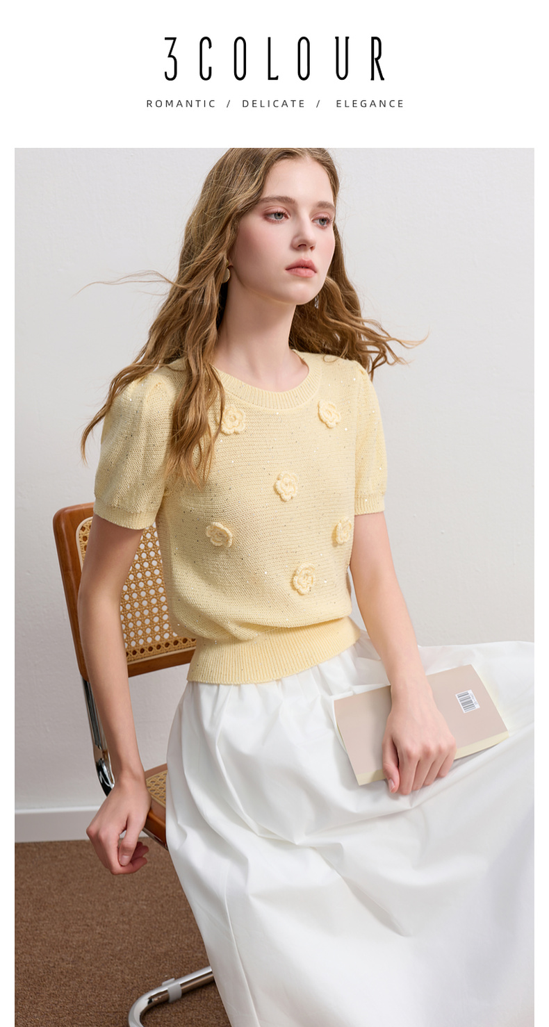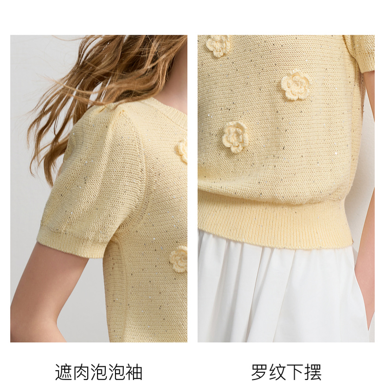 三彩2025秋季新款花朵针织衫亮片毛衫泡泡袖圆领短款M