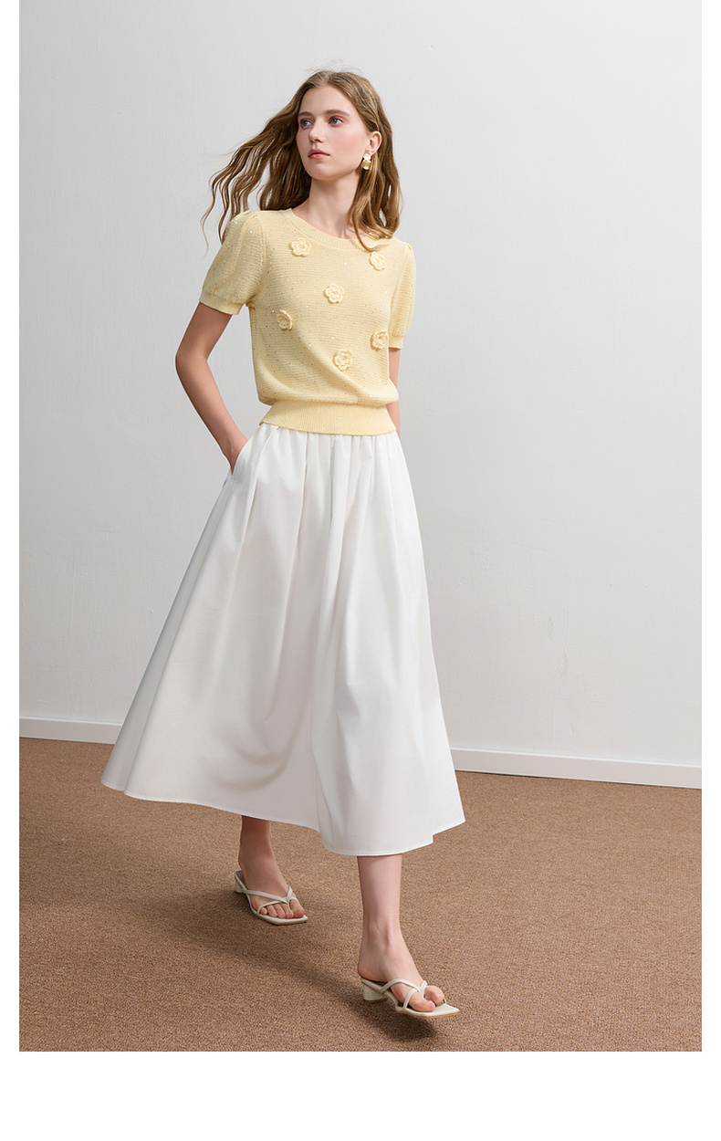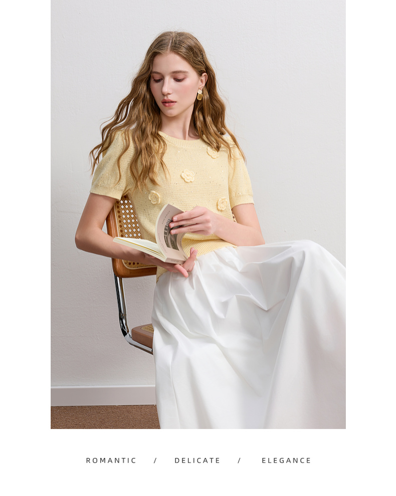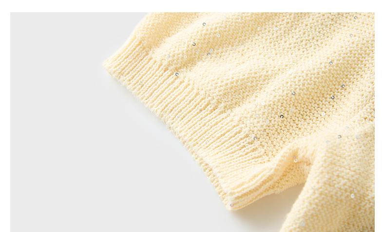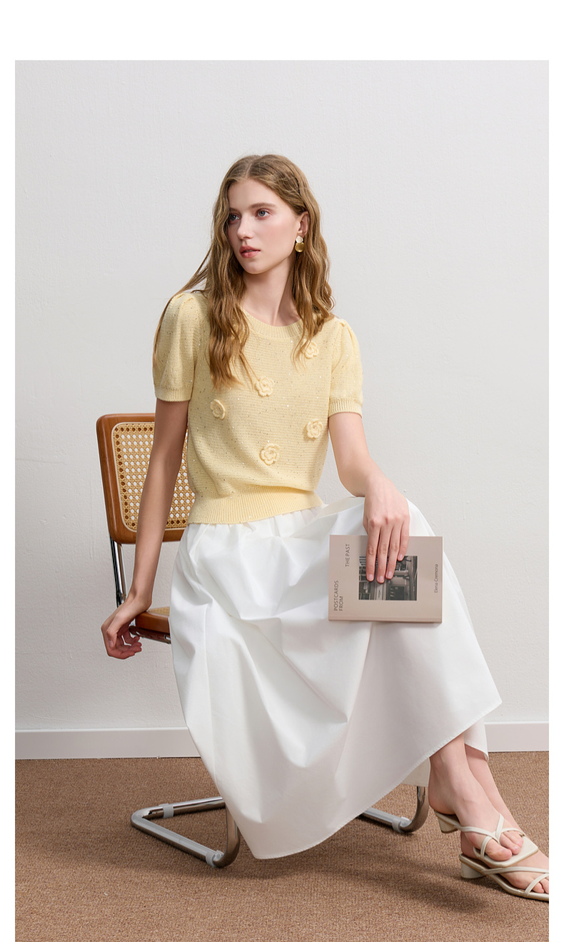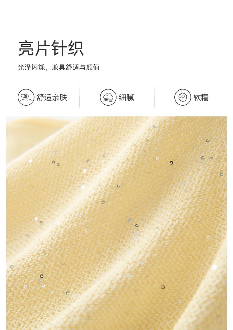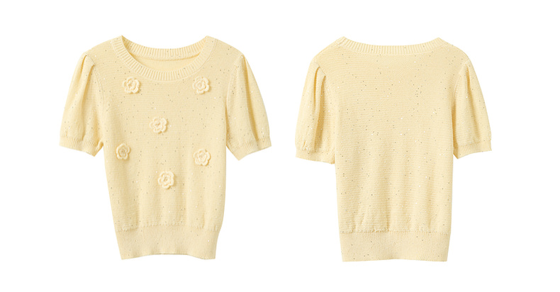 三彩2025秋季新款花朵针织衫亮片毛衫泡泡袖圆领短款M