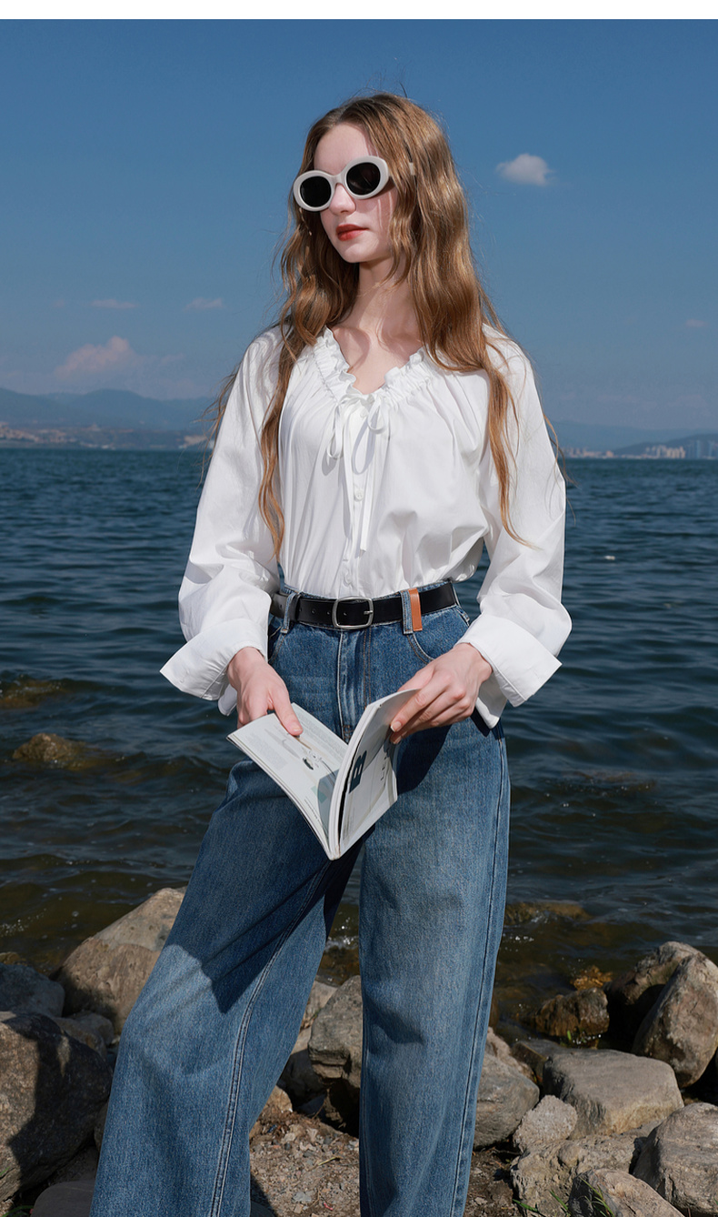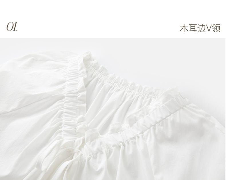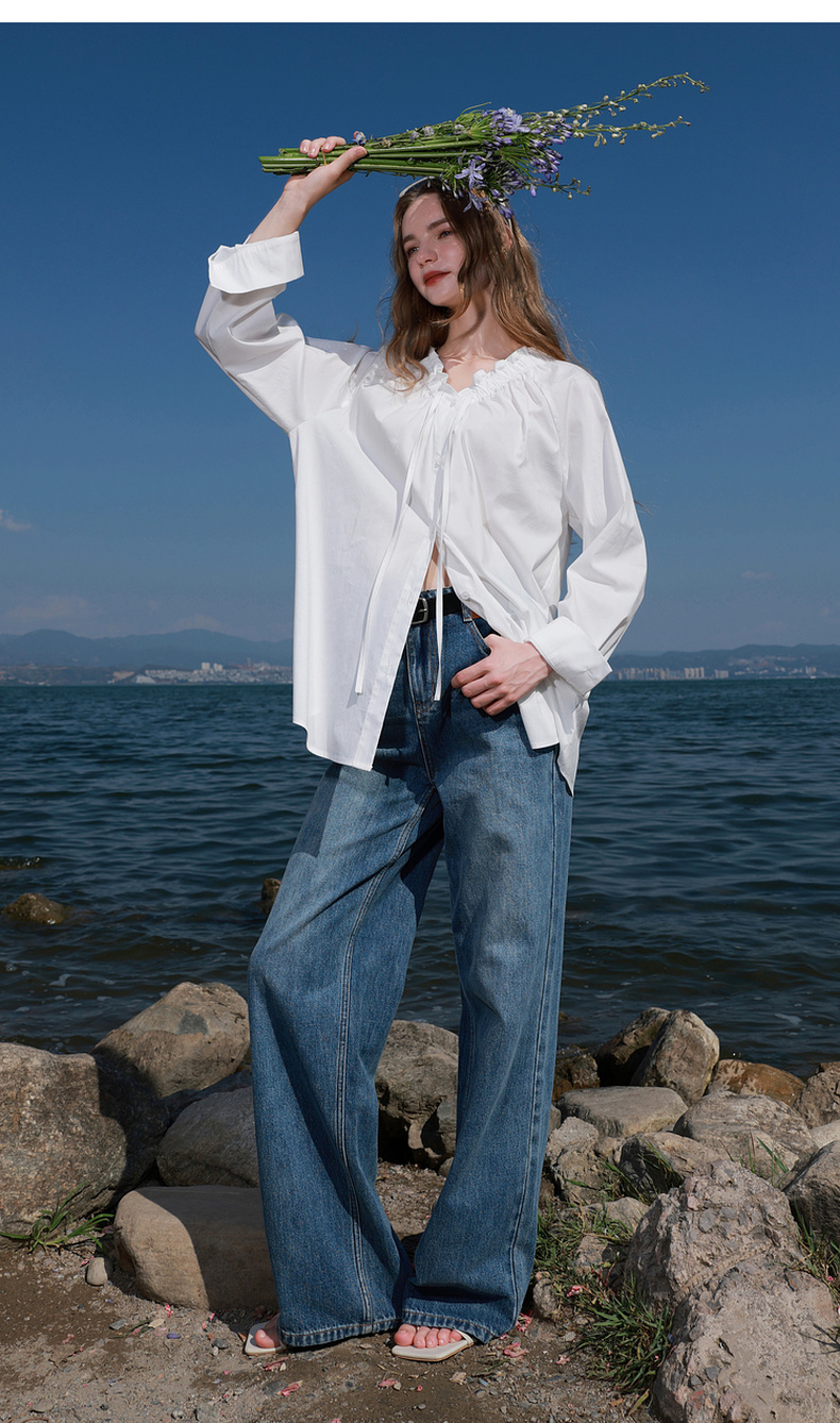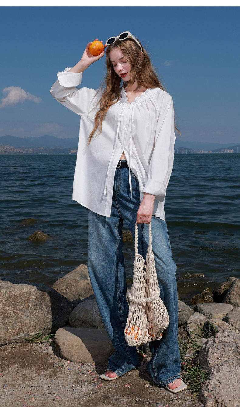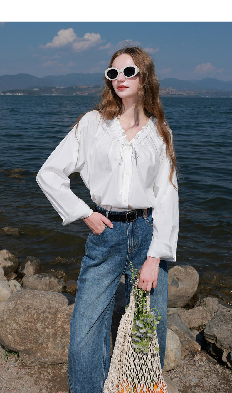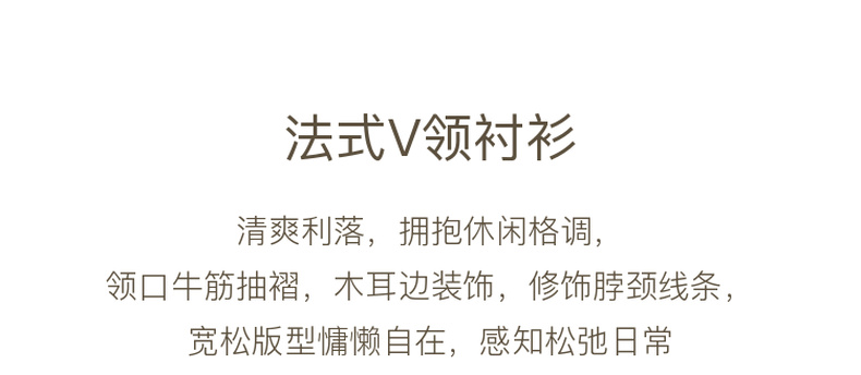 三彩2025秋季新款V领衬衫木耳边系带宽松衬衣简约M