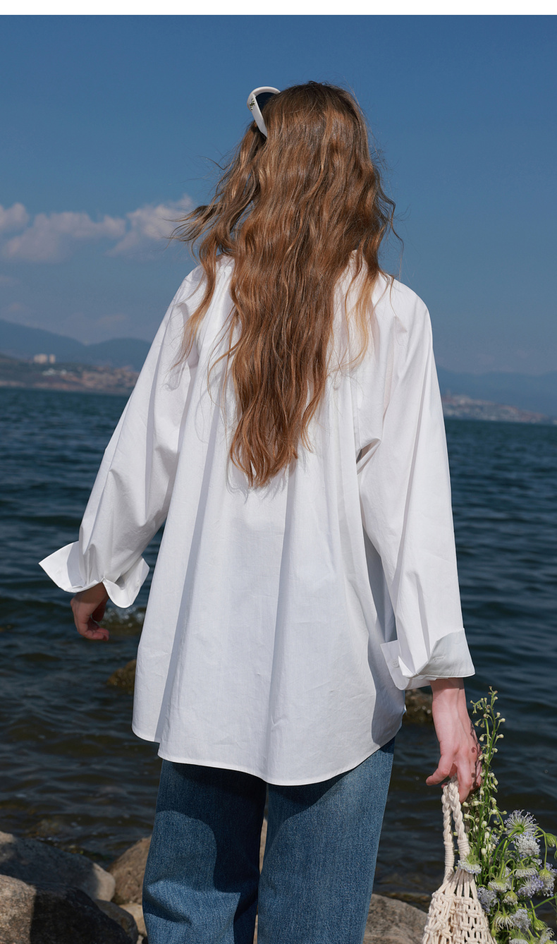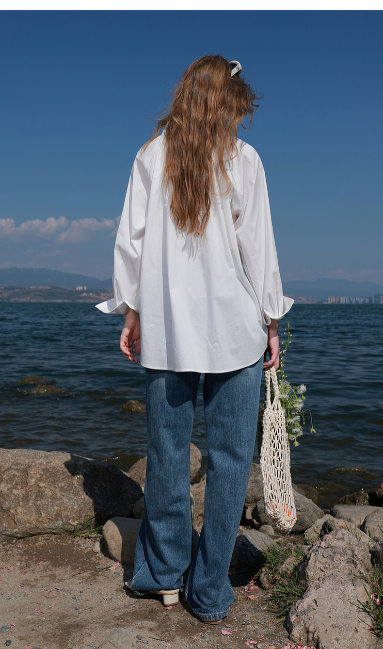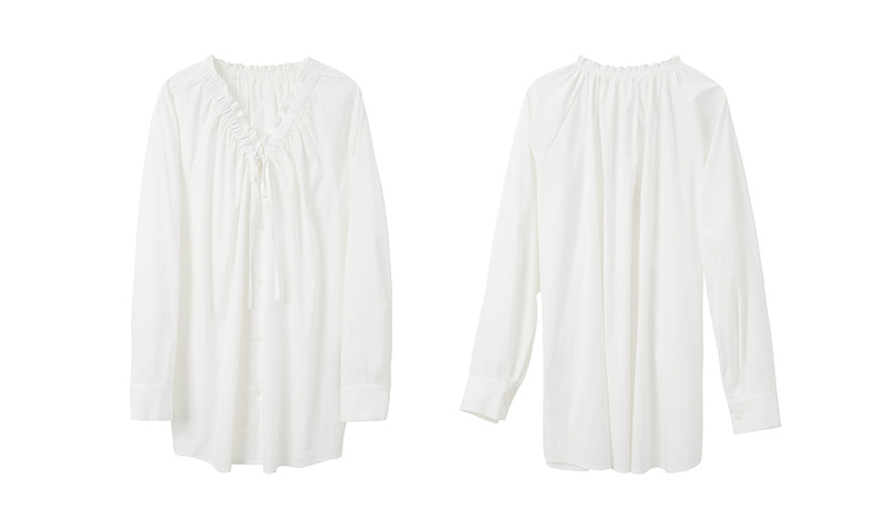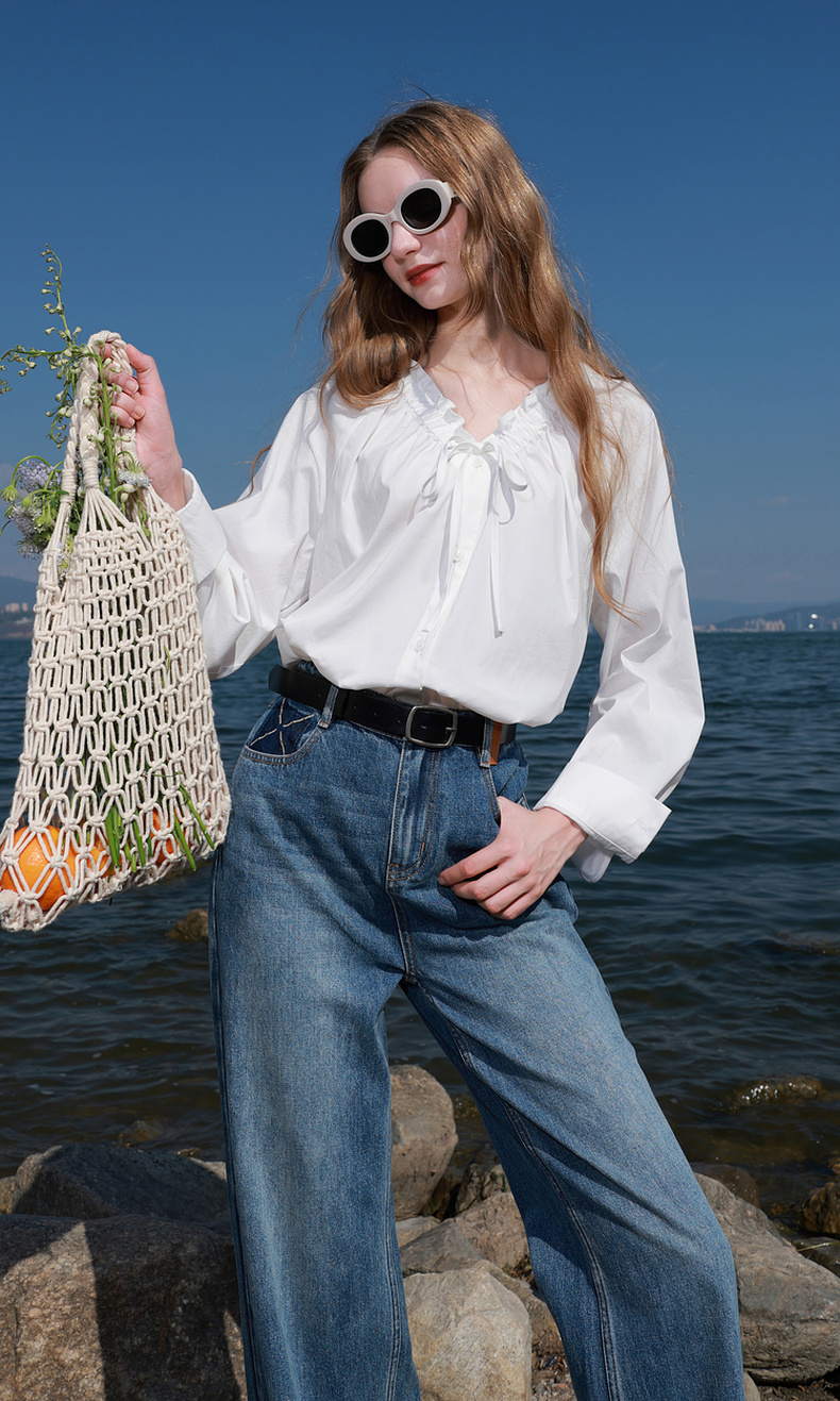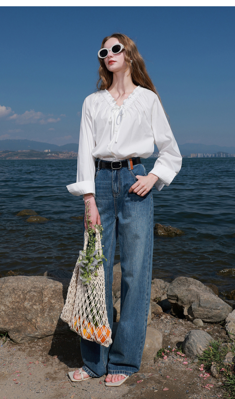 三彩2025秋季新款V领衬衫木耳边系带宽松衬衣简约M