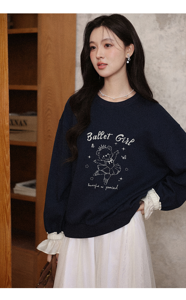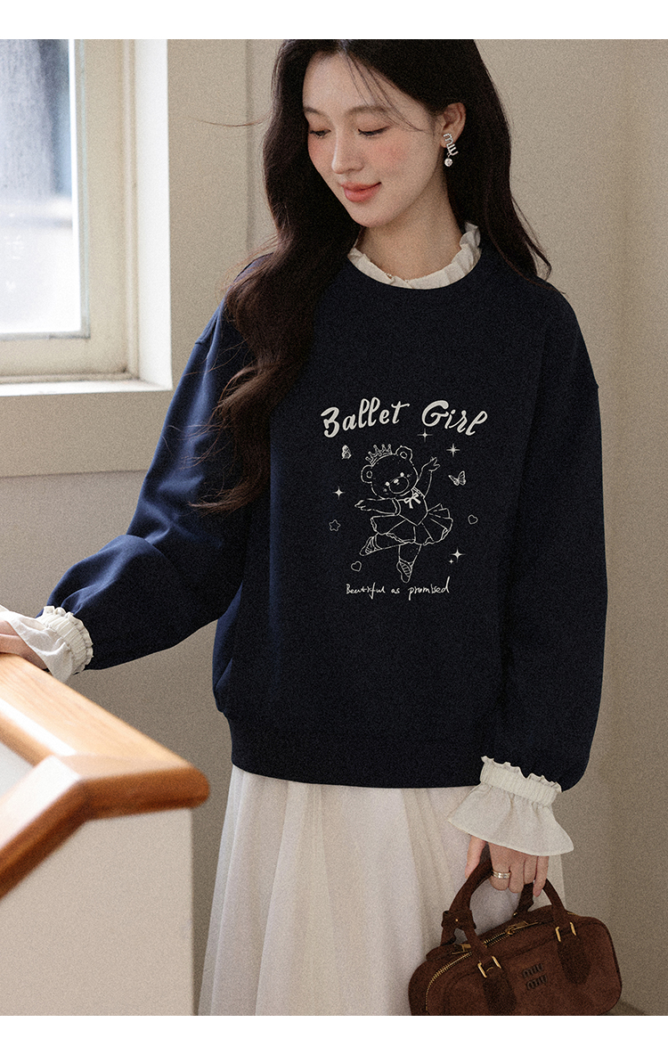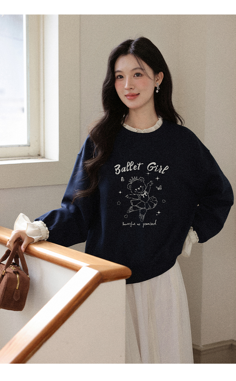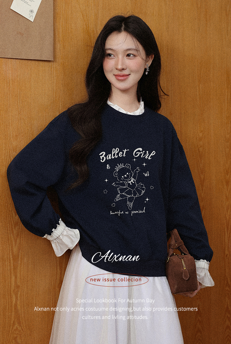 鹿向南「布朗茶茶」藏青色小熊芭蕾圆领套头卫衣宽松显瘦上衣女秋